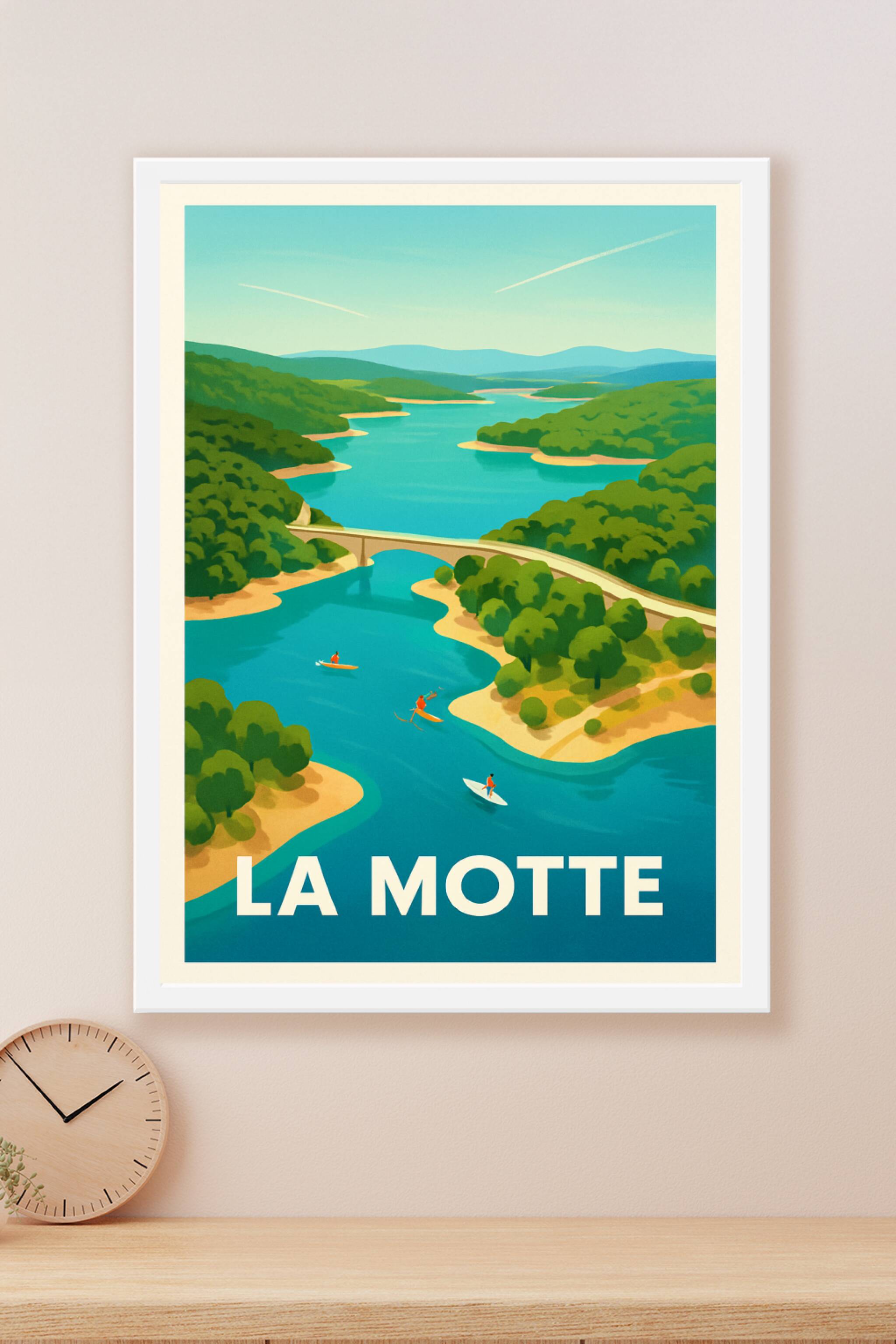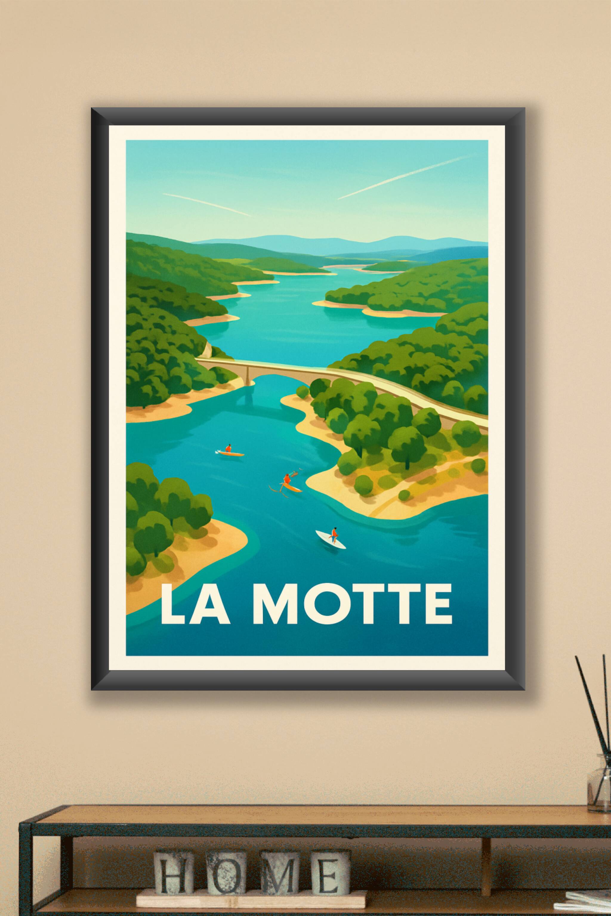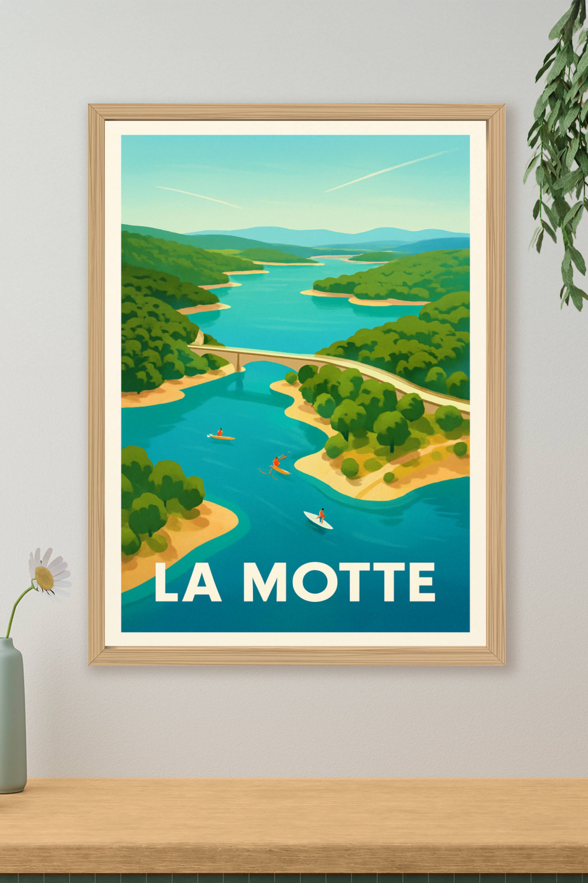 Découvrez la sérénité de La Motte avec cette affiche illustrée mettant en scène son paysage naturel et ses eaux paisibles où naviguent canoës et pa...