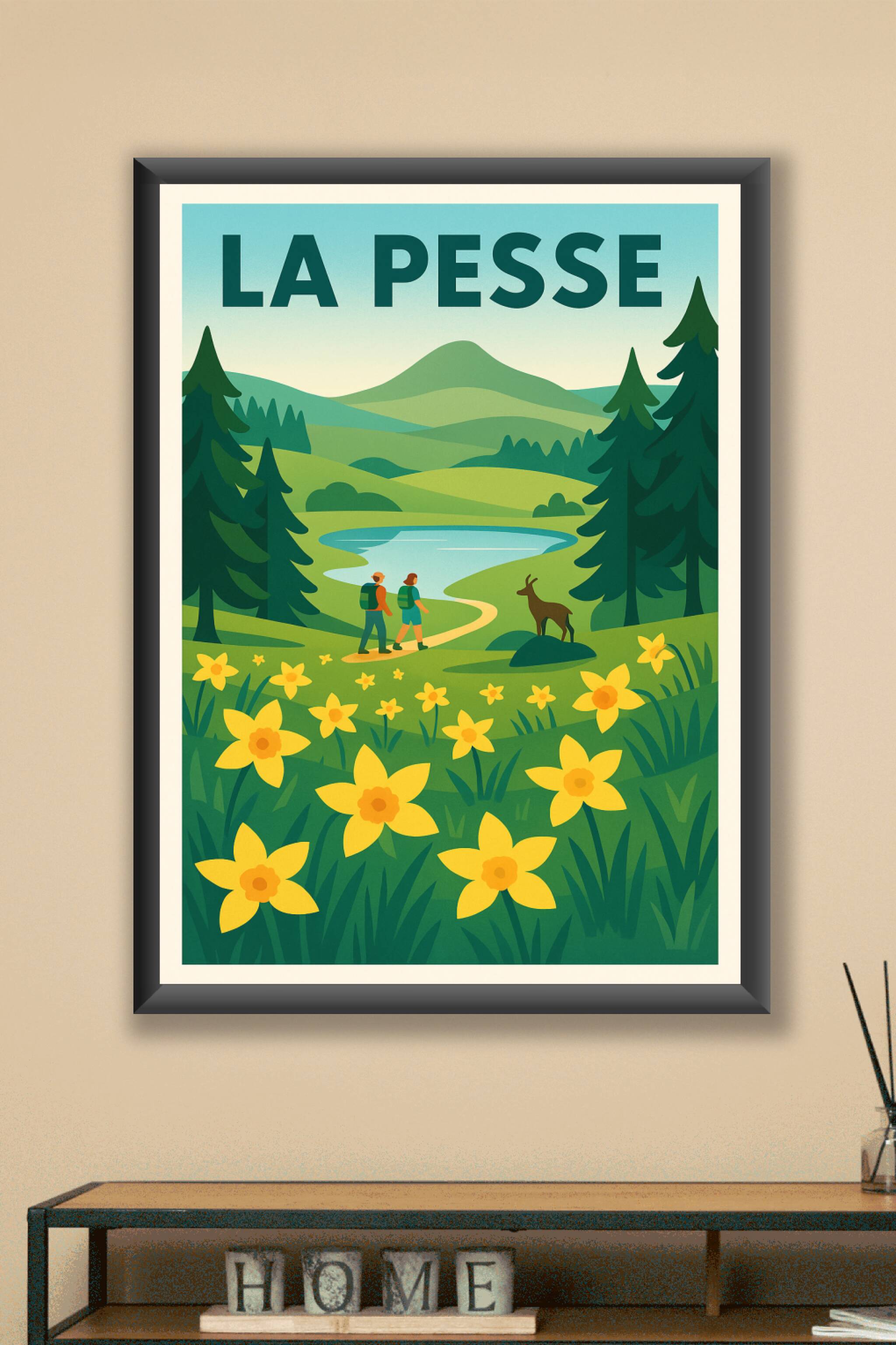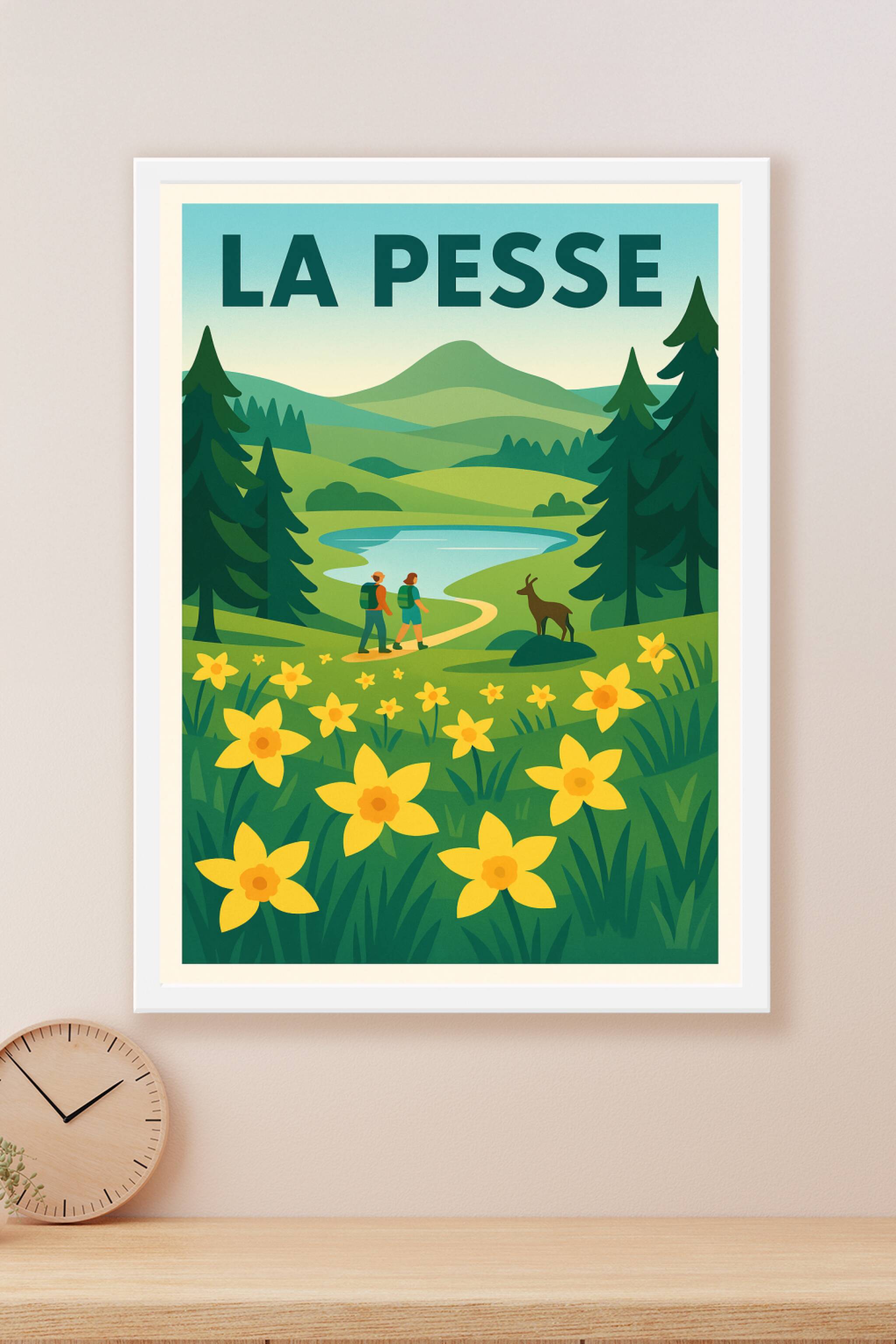 Découvrez la beauté paisible de La Pesse avec cette affiche illustrée qui capture un sentier bucolique bordé de fleurs jaunes éclatantes, entouré de forêts et de collines verdoyantes. Idéale pour les amateurs de randonnée et de paysages apaisants, cette affiche est un véritable hymne à la nature et au calme. Ce poster est imprimé en tirage "Fine Art" sur papier 305g coton, garantissant une qualité d'impression exceptionnelle et une longue tenue des couleurs. Disponible en formats A1 à A4, avec ou sans cadre, il saura embellir votre intérieur tout en vous transportant au cœur des grands espaces. Apportez une touche de sérénité et d'évasion à votre décoration avec ce poster premium, 100% fabriqué en France.