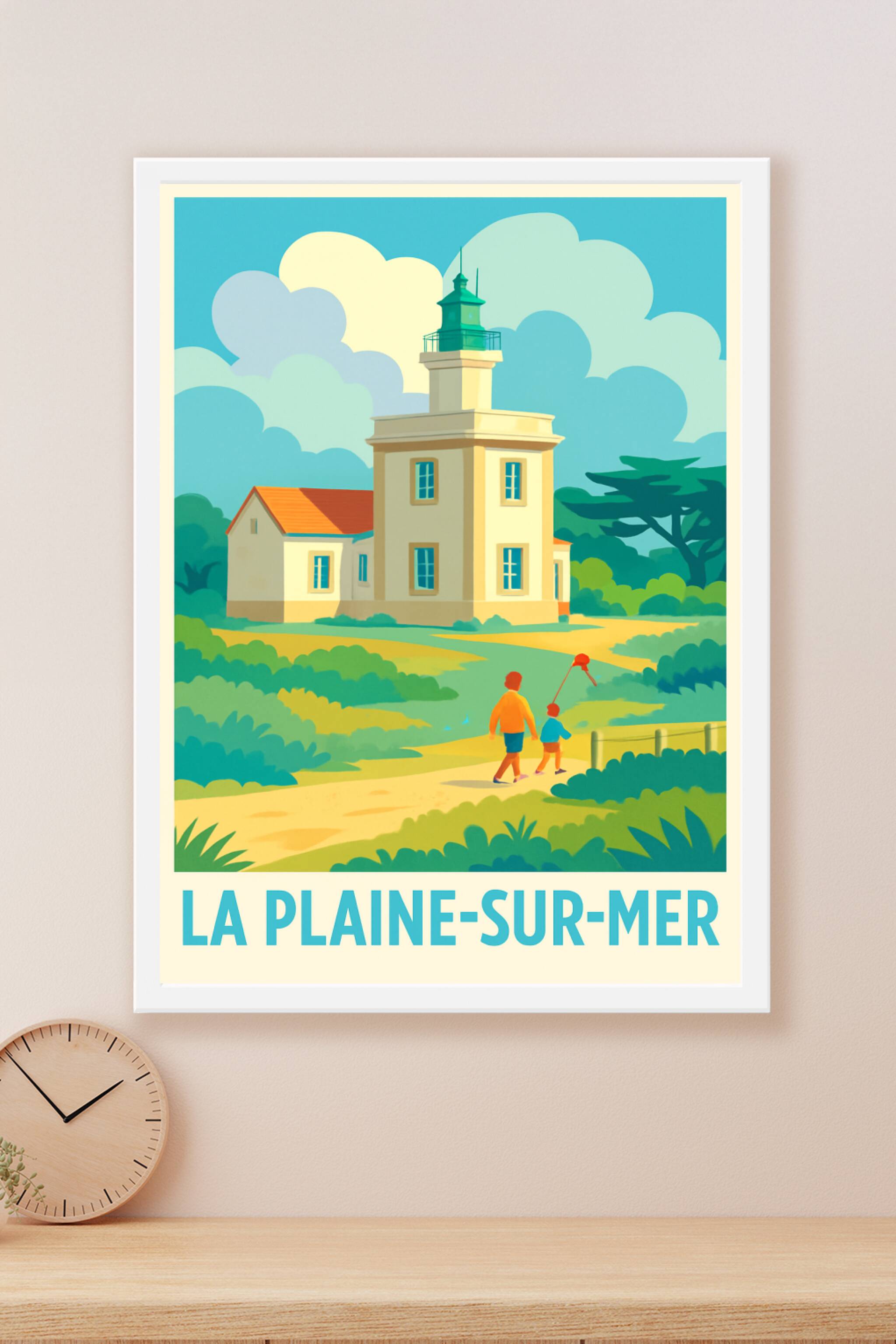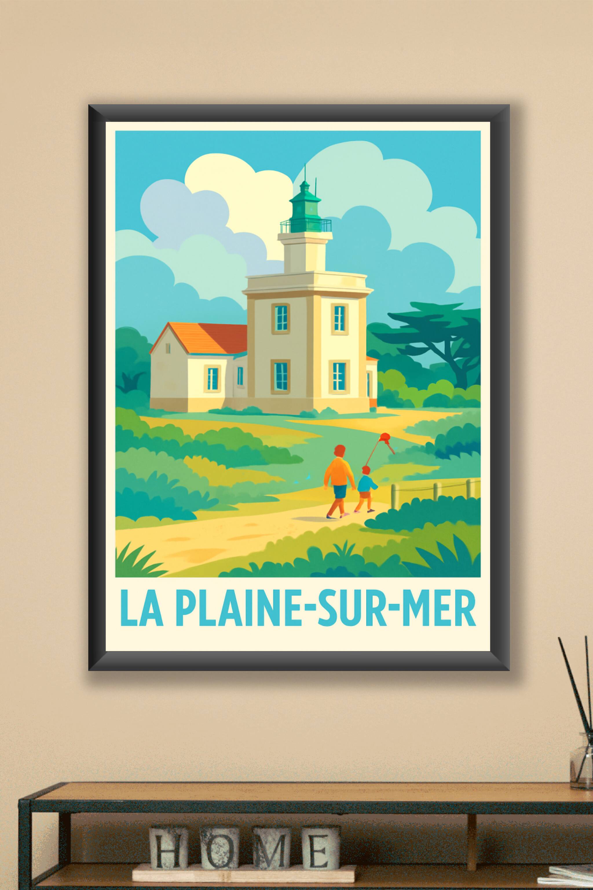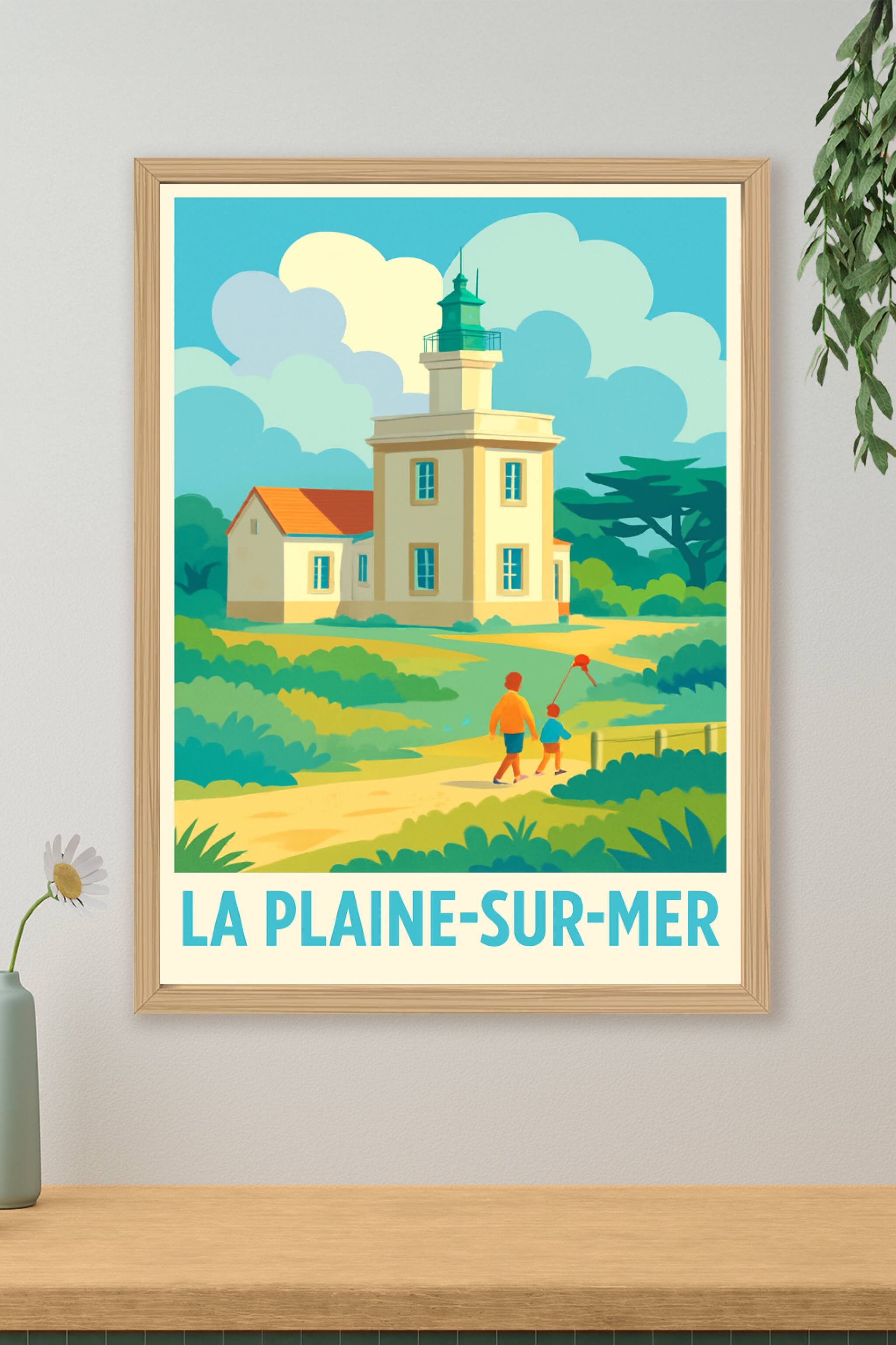 Découvrez l'esprit paisible et chaleureux de La Plaine-sur-Mer avec cette affiche illustrée mettant en scène un phare emblématique et une balade fa...