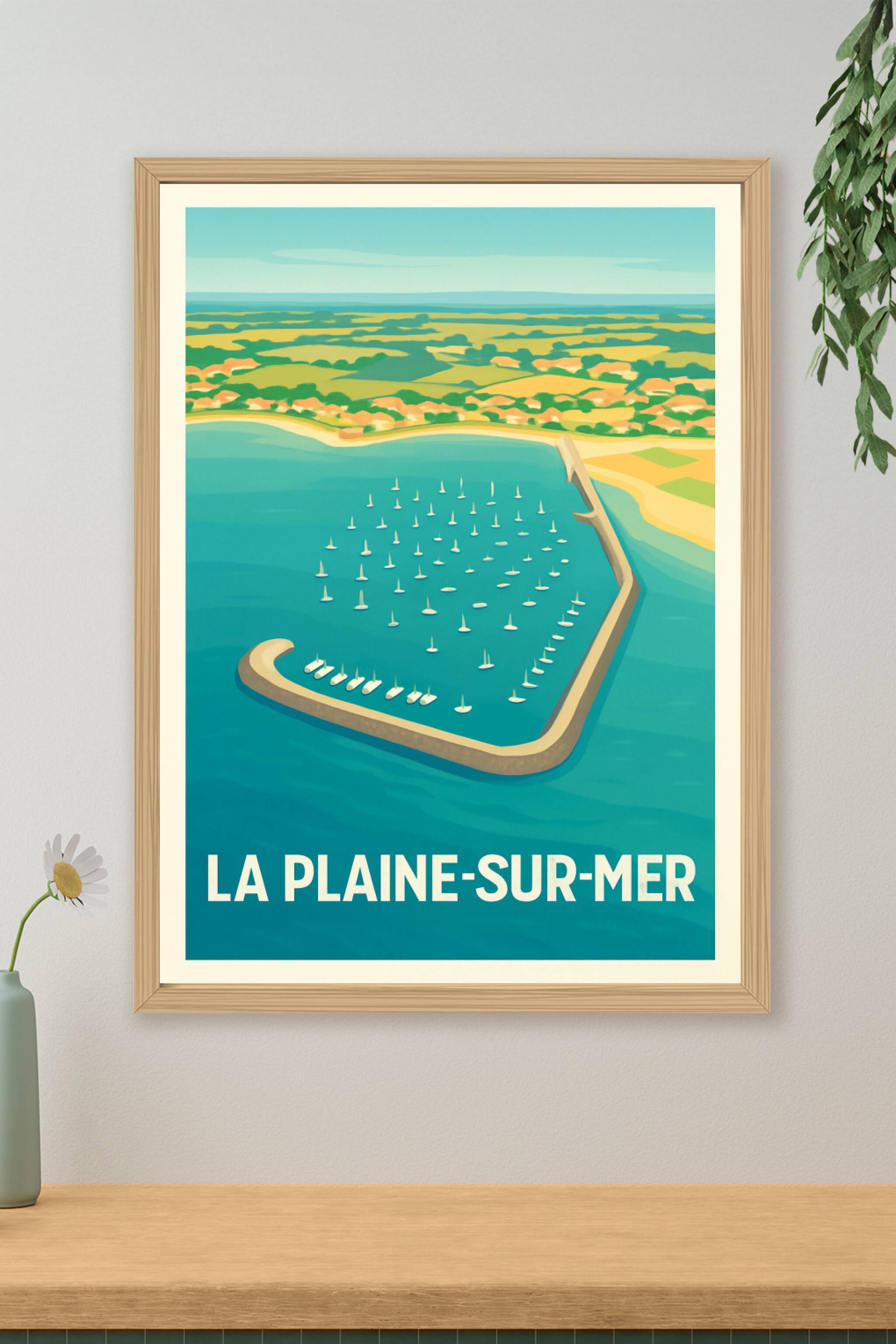 Découvrez la douceur et la tranquillité de La Plaine-sur-Mer avec cette affiche illustrée représentant un port intimiste abritant de nombreux voili...
