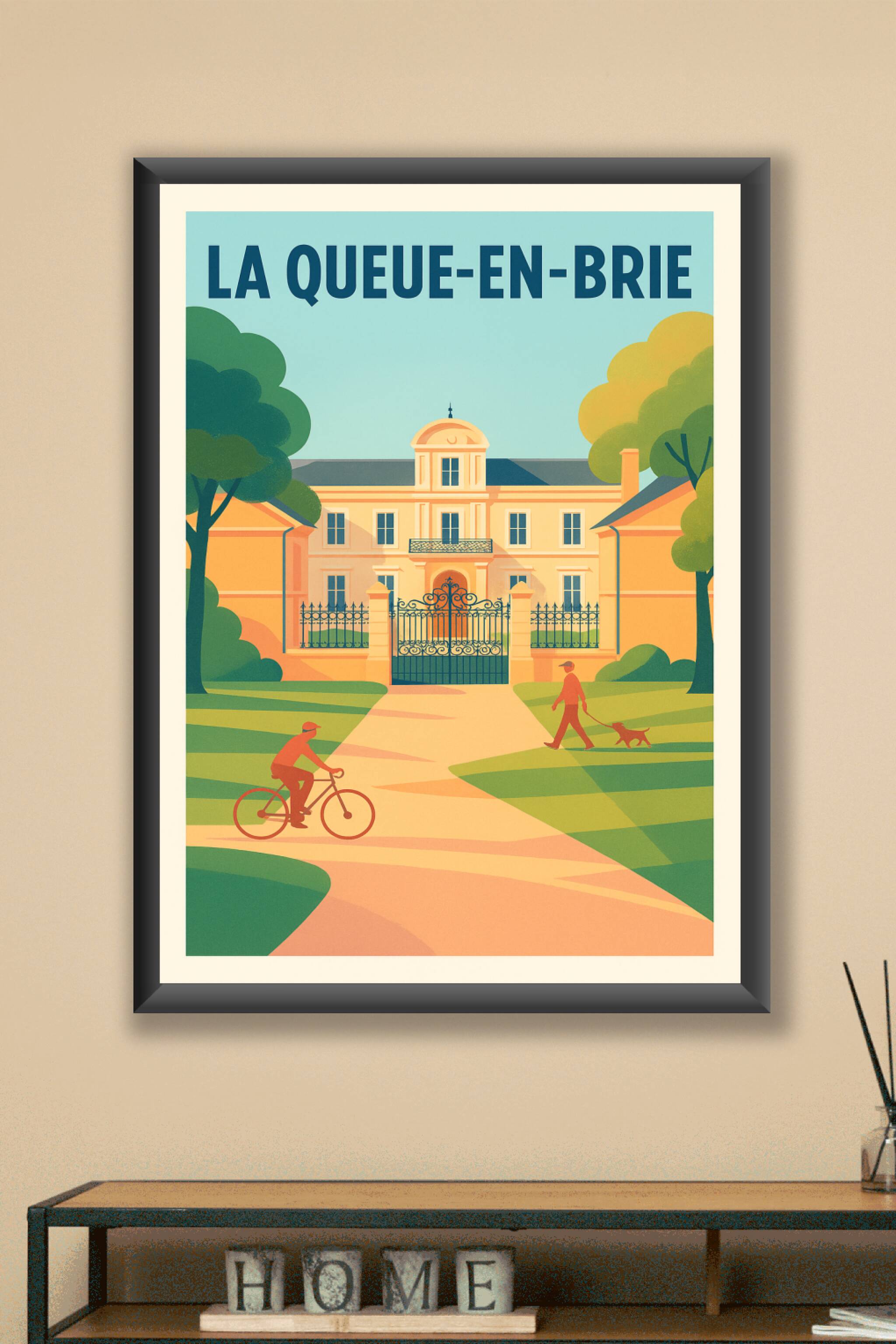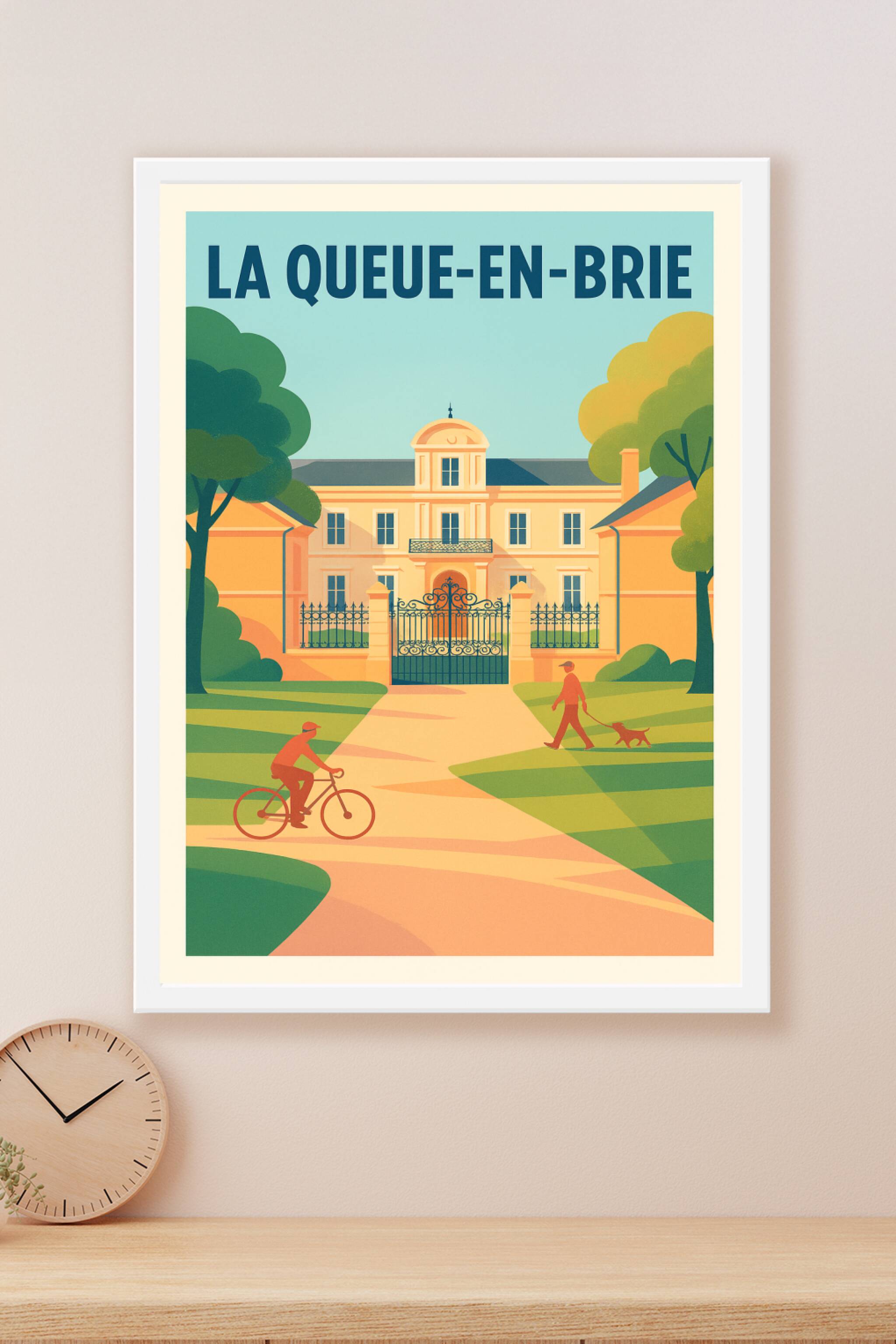Découvrez l'atmosphère sereine et élégante de La Queue-en-Brie avec cette affiche qui capture un instant de vie harmonieux entre nature et architec...
