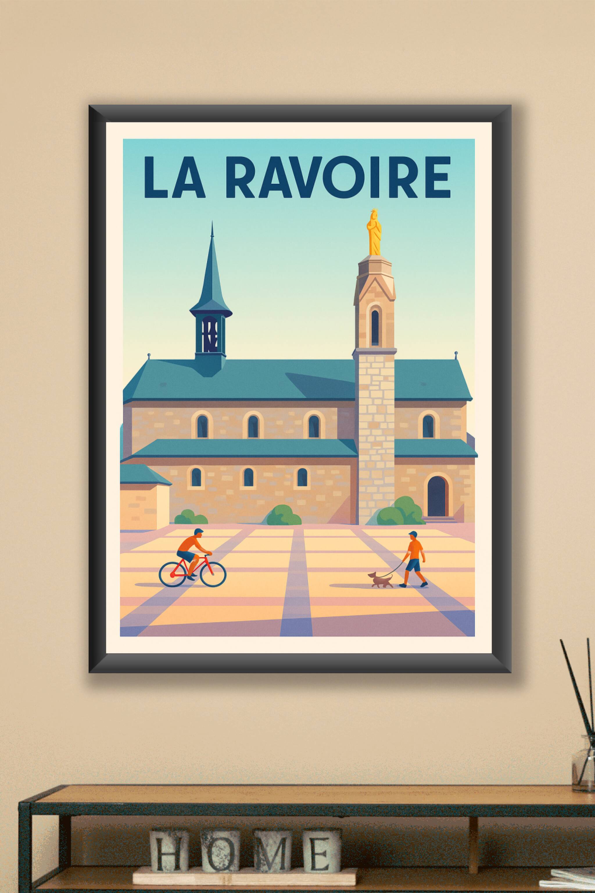 Découvrez le charme paisible de La Ravoire à travers cette affiche illustrée qui met en scène l'architecture locale et la douceur de vivre de cette petite ville. Cette scène harmonieuse invite à la détente, avec ses personnages en balade et à vélo sur une place baignée de lumière.Ce poster est imprimé en tirage "Fine Art" sur papier 305g coton, garantissant une qualité d'impression exceptionnelle et des couleurs vibrantes qui sublimeront votre intérieur. Disponible en formats A1 à A4, avec ou sans cadre, cette affiche s'adapte parfaitement à tous les styles de décoration. Profitez d'un produit 100% français, idéal comme cadeau ou pour immortaliser un souvenir de La Ravoire avec élégance et authenticité.