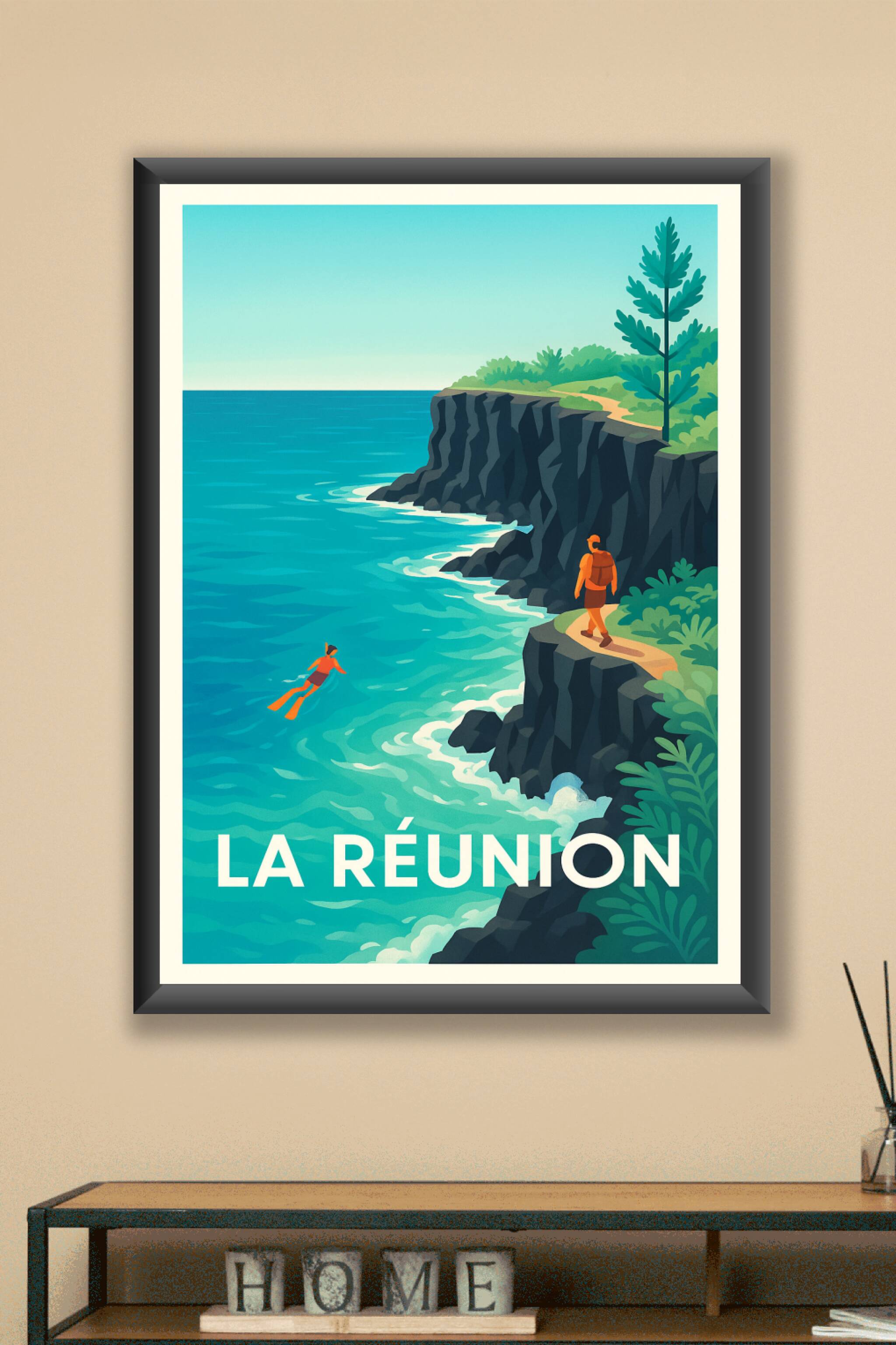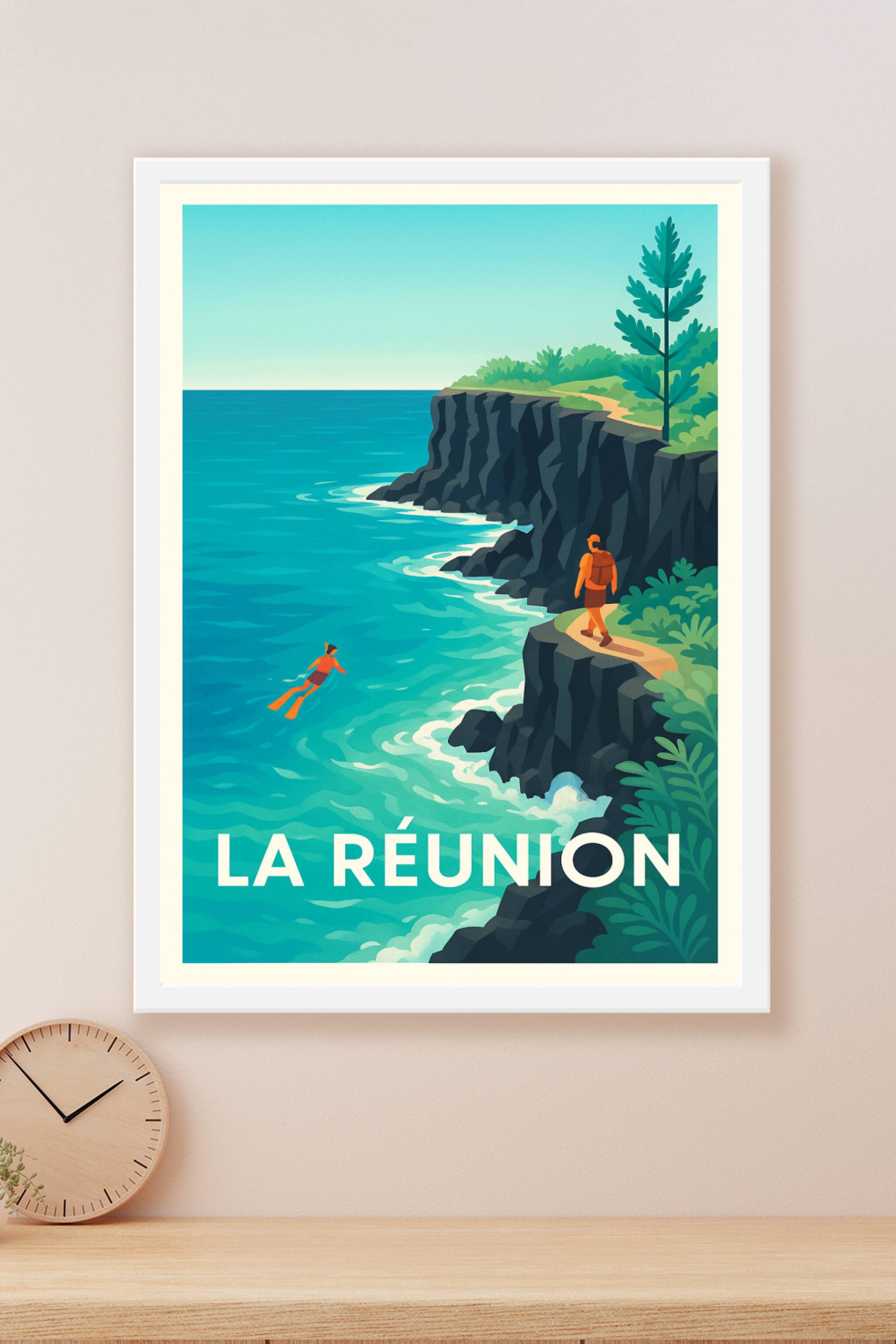 Découvrez la beauté sauvage et l'esprit d'aventure de La Réunion avec ce poster illustré vibrant. L'affiche capture une scène où un plongeur explor...