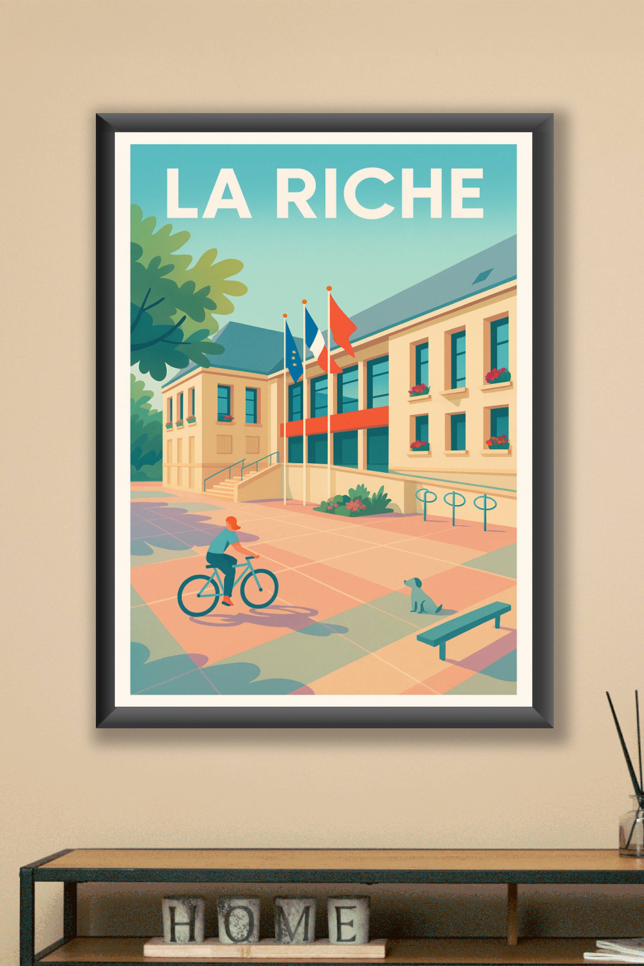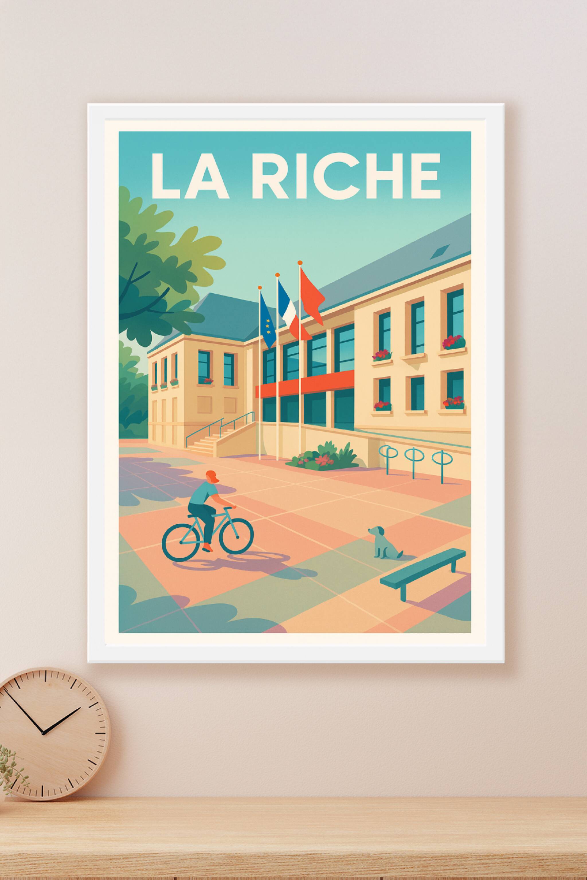 Découvrez la quiétude et le charme de La Riche avec cette affiche illustrée mettant en scène une journée tranquille devant un bâtiment municipal, s...