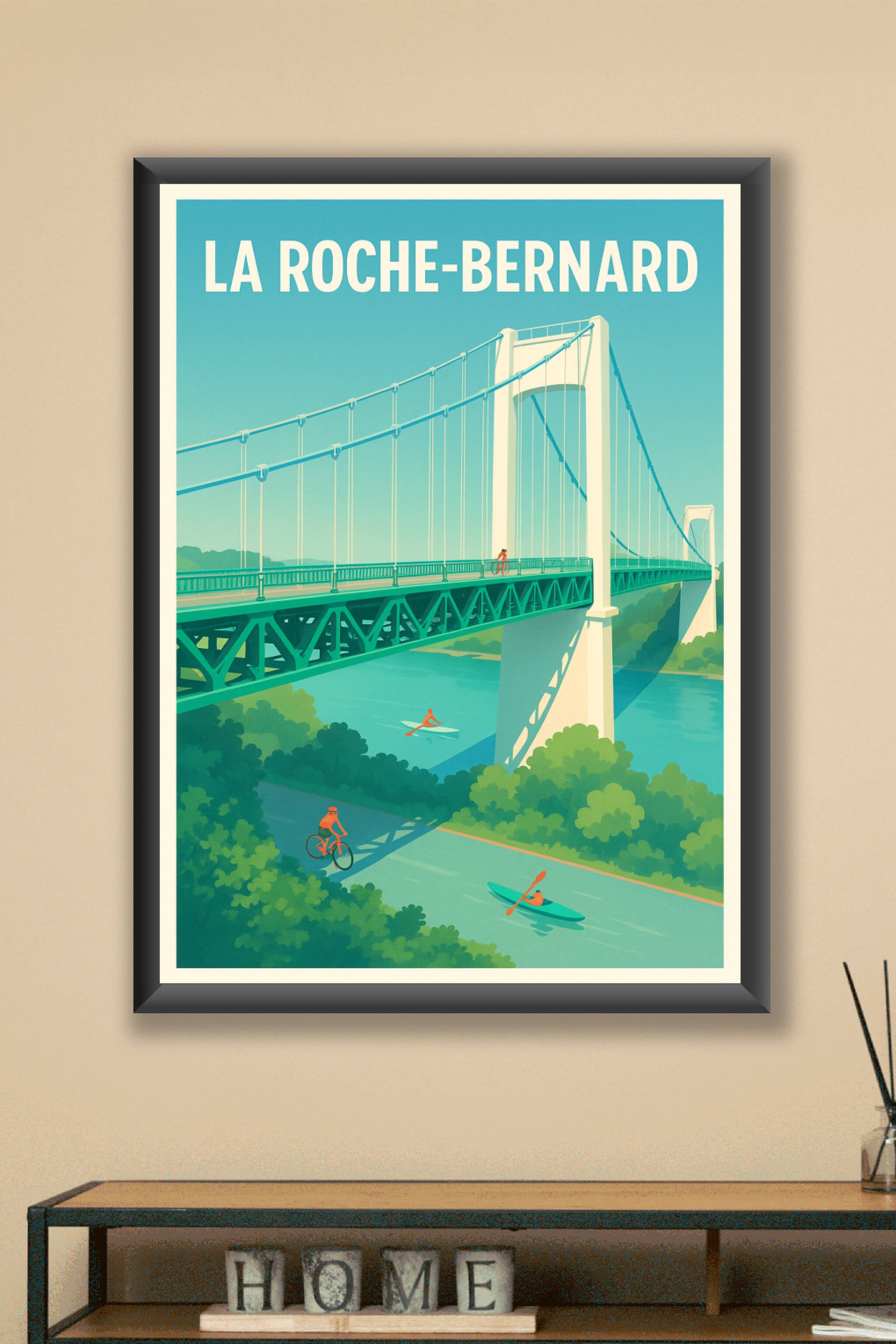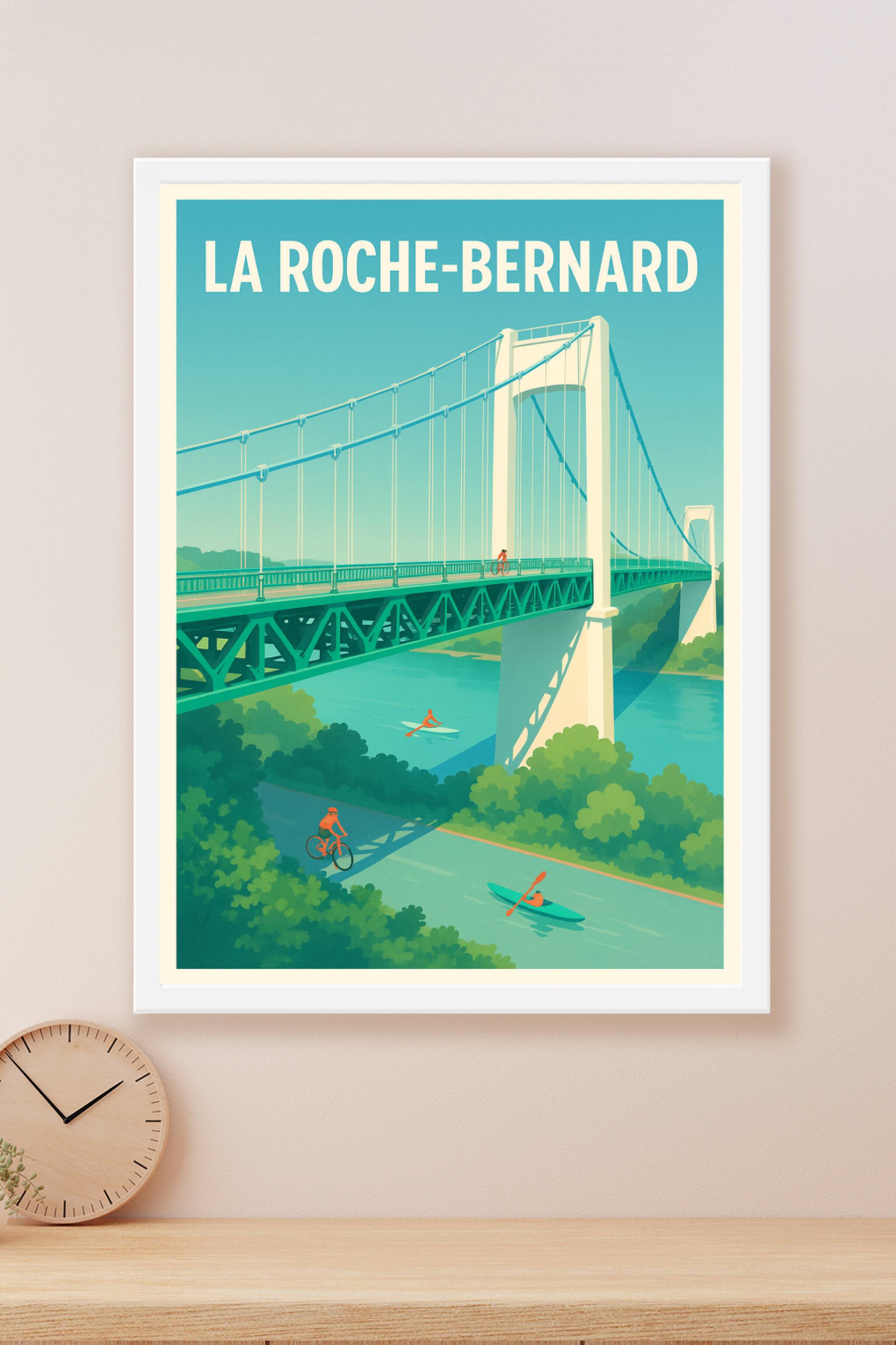 Découvrez le charme paisible de La Roche-Bernard avec cette affiche illustrée représentant le pont emblématique sur la Vilaine, un véritable havre ...