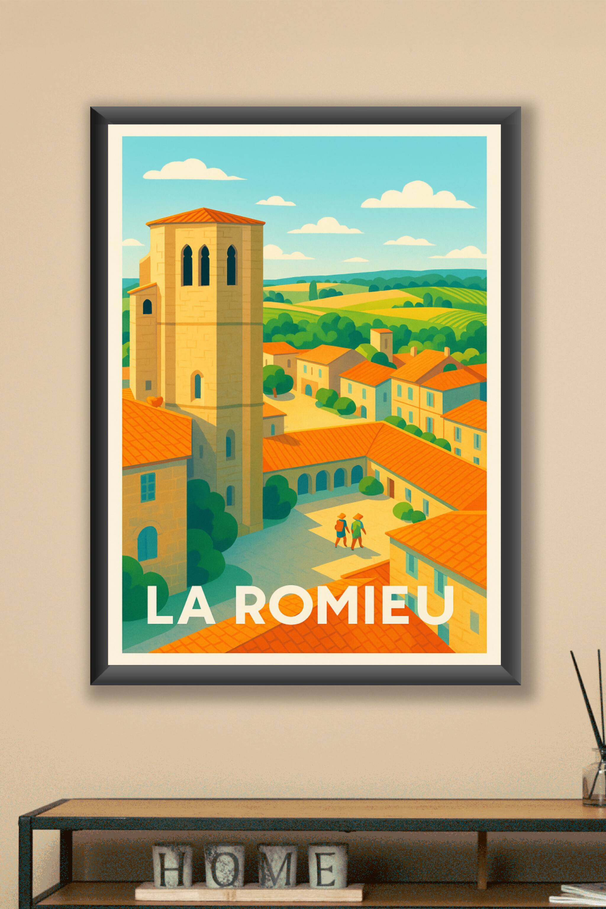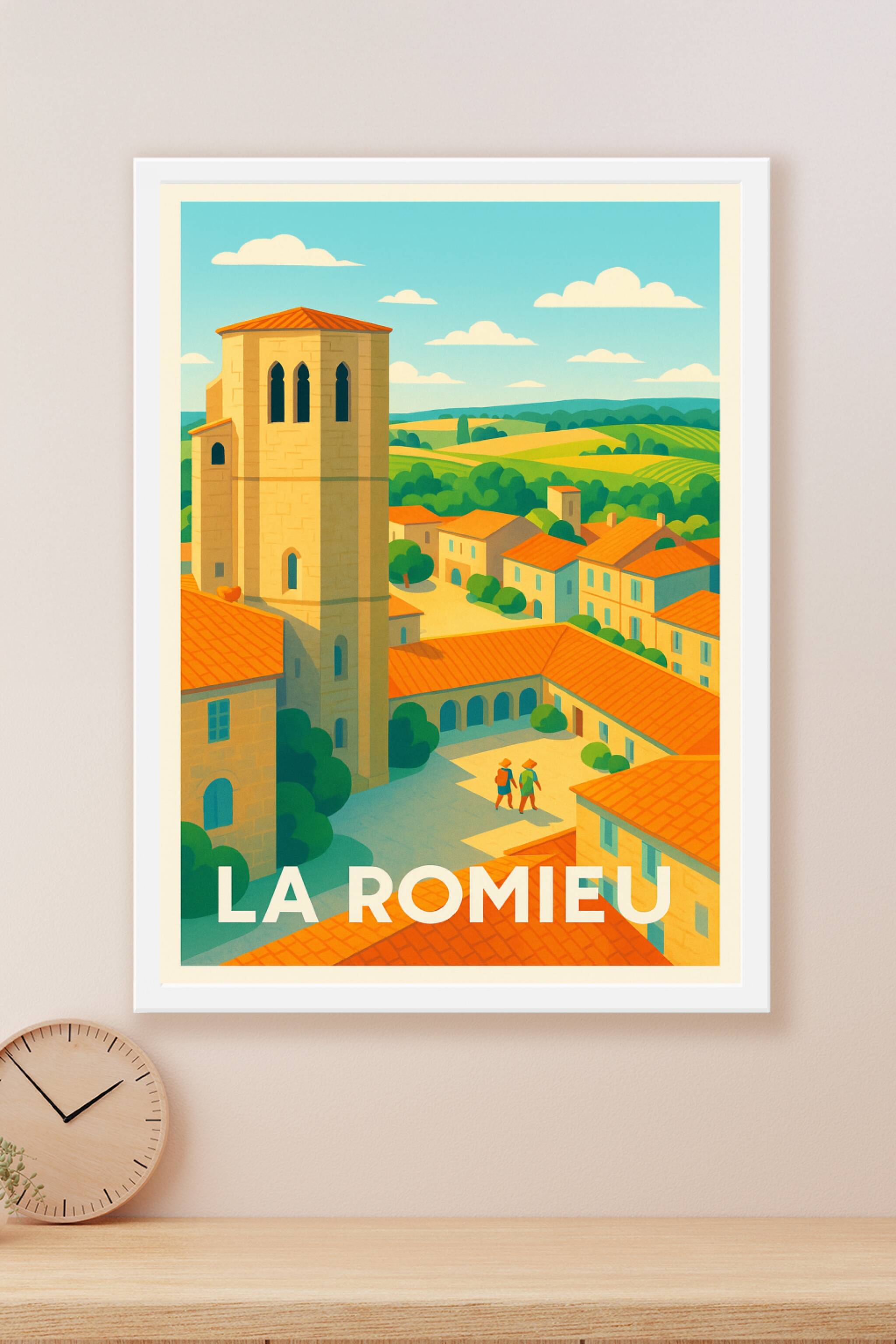 Découvrez La Romieu à travers cette affiche illustrée, représentant son architecture typique et ses paysages vallonnés baignés de lumière douce. Ce...