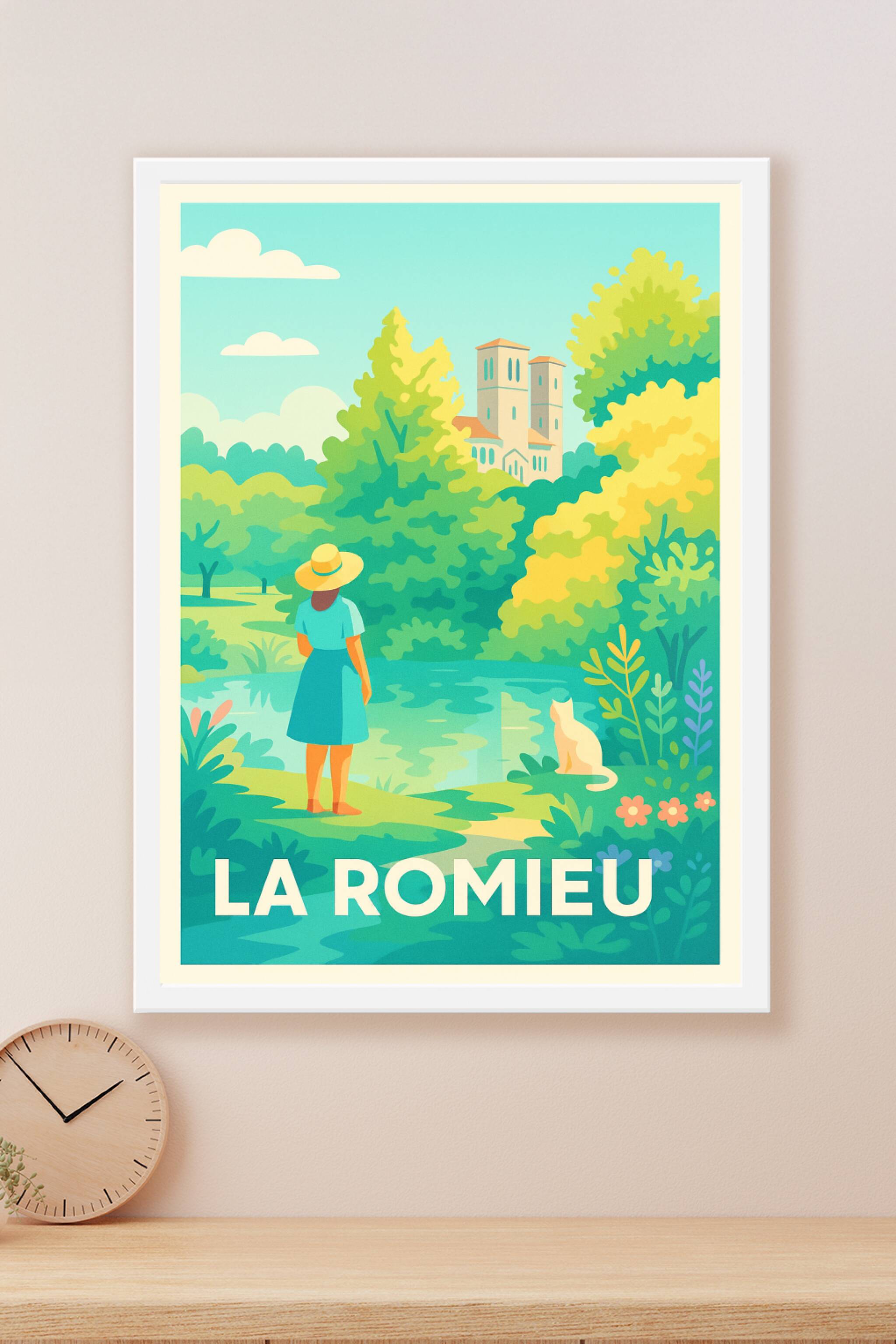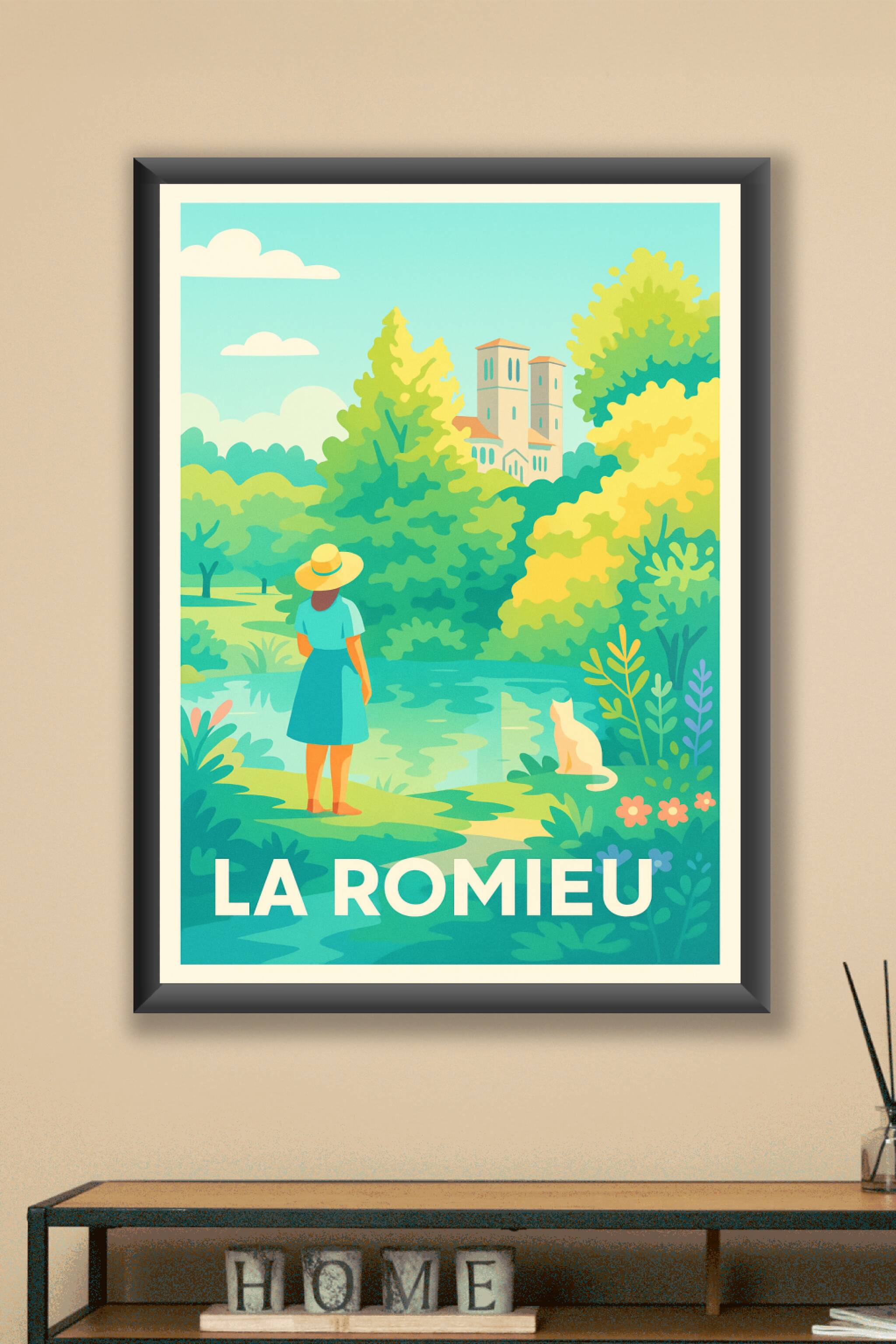 Découvrez la douceur de vivre à La Romieu avec cette affiche poétique mettant en scène une promenade champêtre au bord de l'eau, accompagnée d'un c...