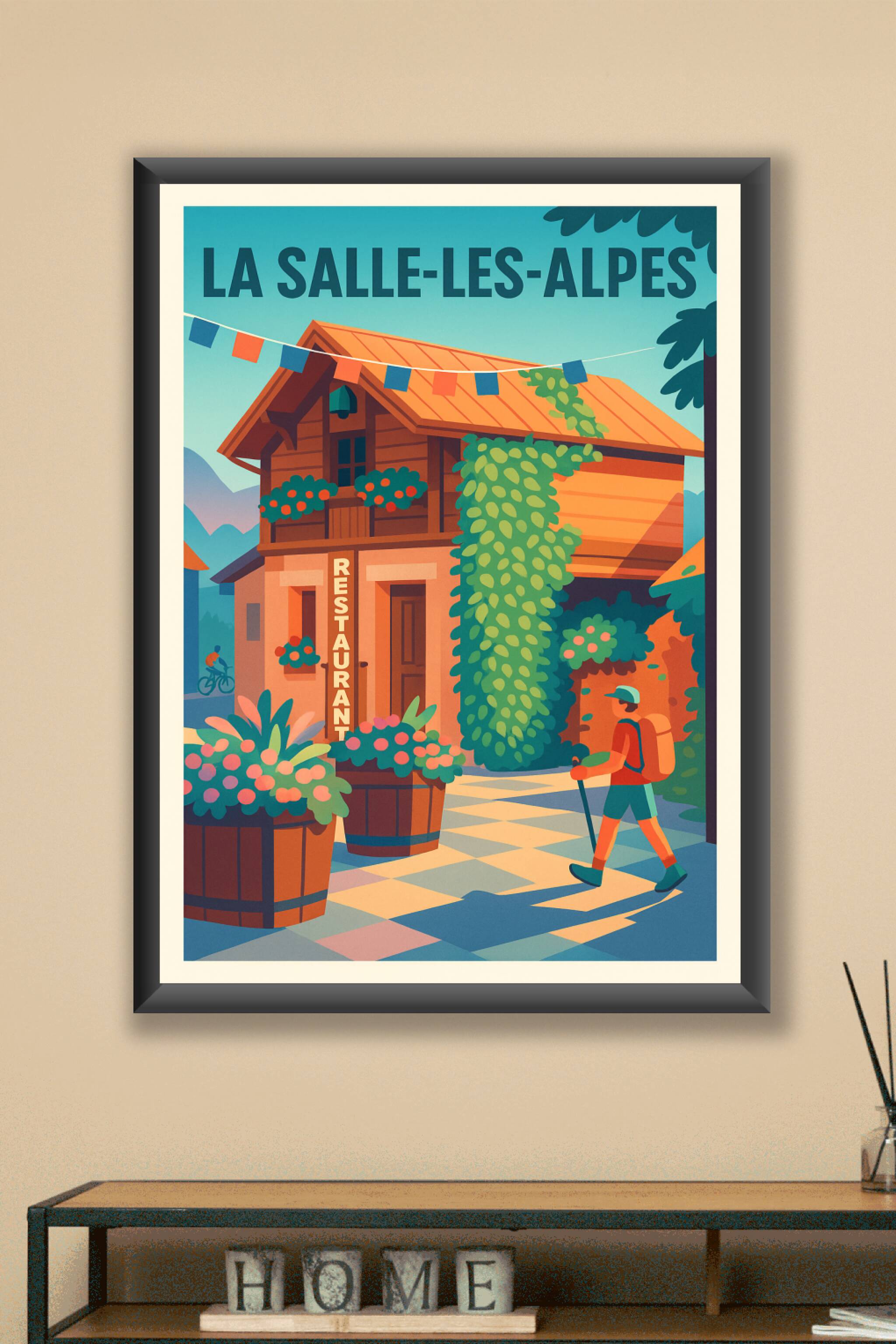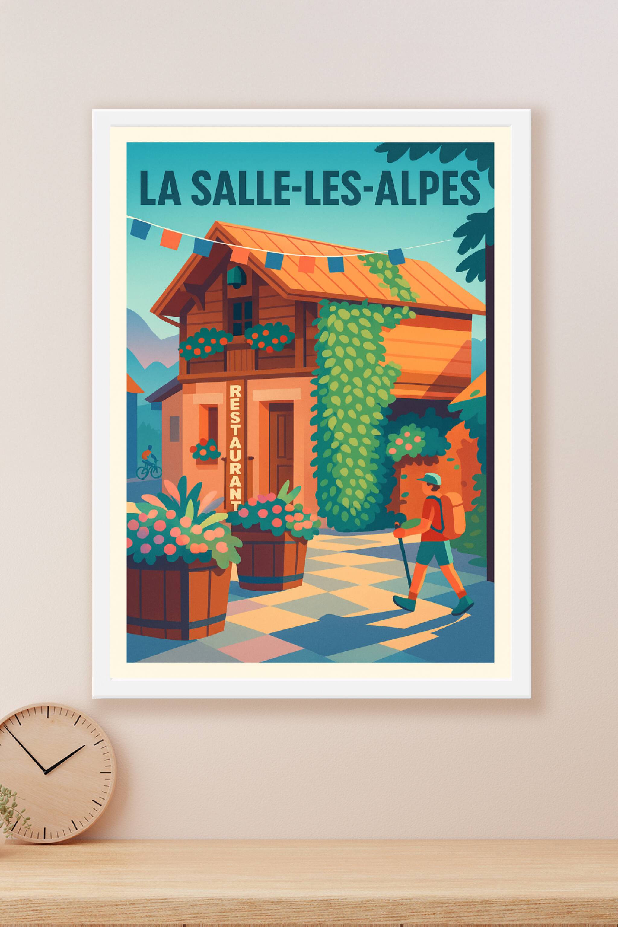 Découvrez l'atmosphère authentique et paisible de La Salle-les-Alpes avec ce poster illustré aux couleurs vives et chaleureuses. Cette affiche met en scène une petite rue animée avec un restaurant traditionnel et un randonneur prêt à explorer les environs, symbole du charme alpin.Affiche en tirage "Fine Art" imprimée sur papier 305g coton, pour une qualité d'impression exceptionnelle et des couleurs éclatantes qui dureront dans le temps. Disponible en formats A1 à A4, avec ou sans cadre, ce poster apportera une touche montagnarde et conviviale à votre décoration intérieure.Offrez-vous ou offrez un souvenir élégant et chargé d'émotion, 100% fabriqué en France, parfait pour les amoureux de la nature et des ambiances alpines.