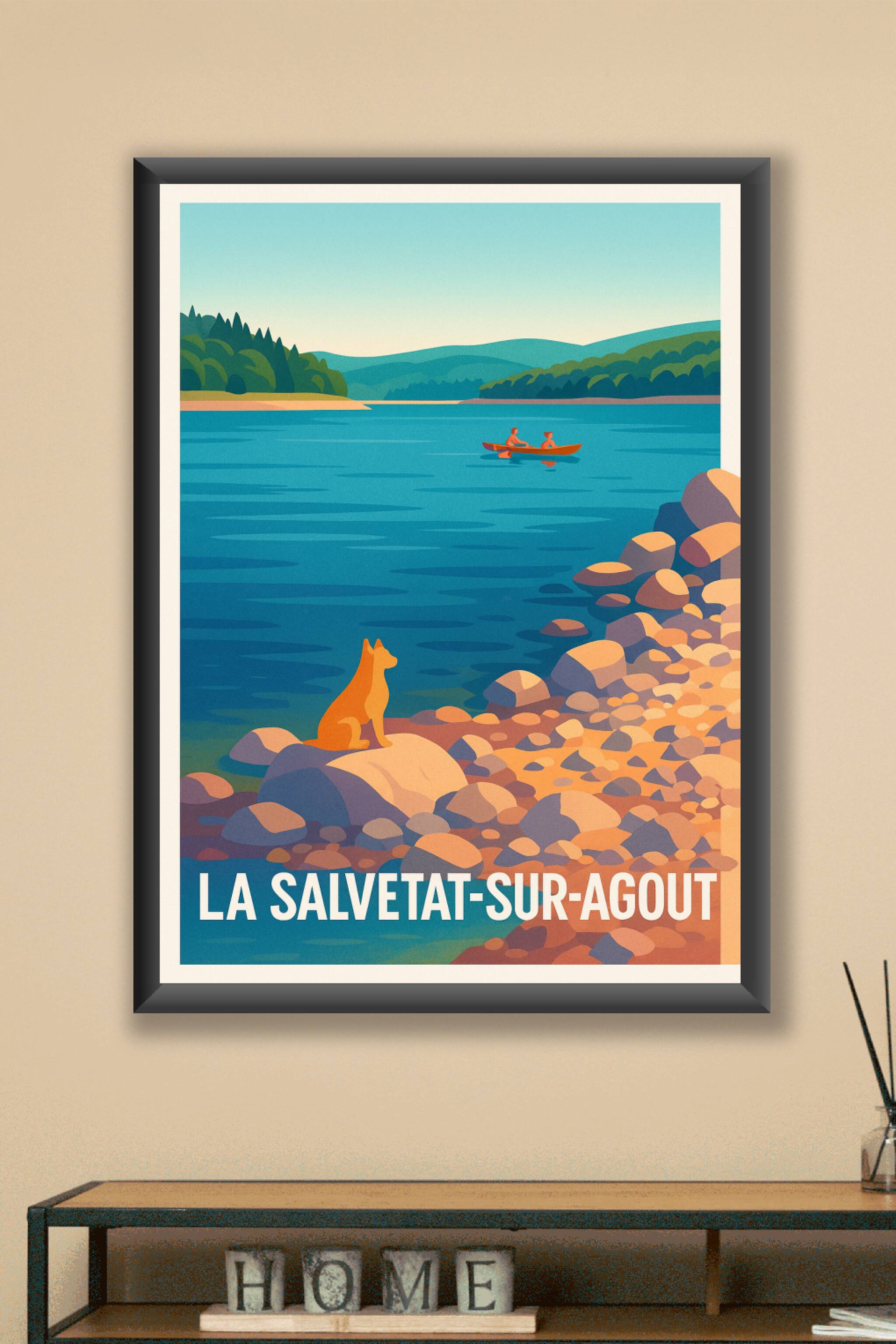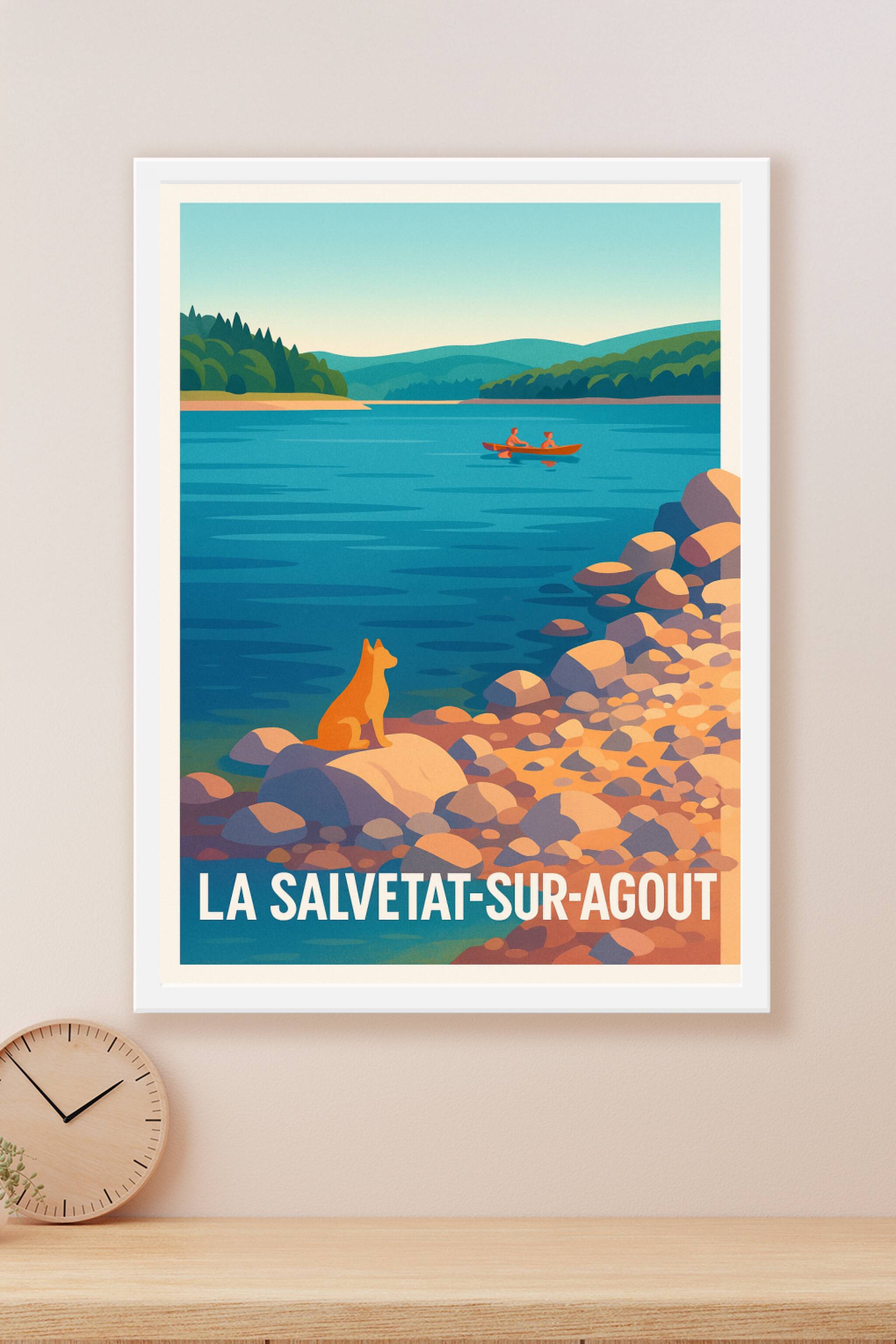 Découvrez la sérénité de La Salvetat-sur-Agout à travers cette superbe affiche illustrée, mettant en scène un paysage apaisant où un chien observe ...