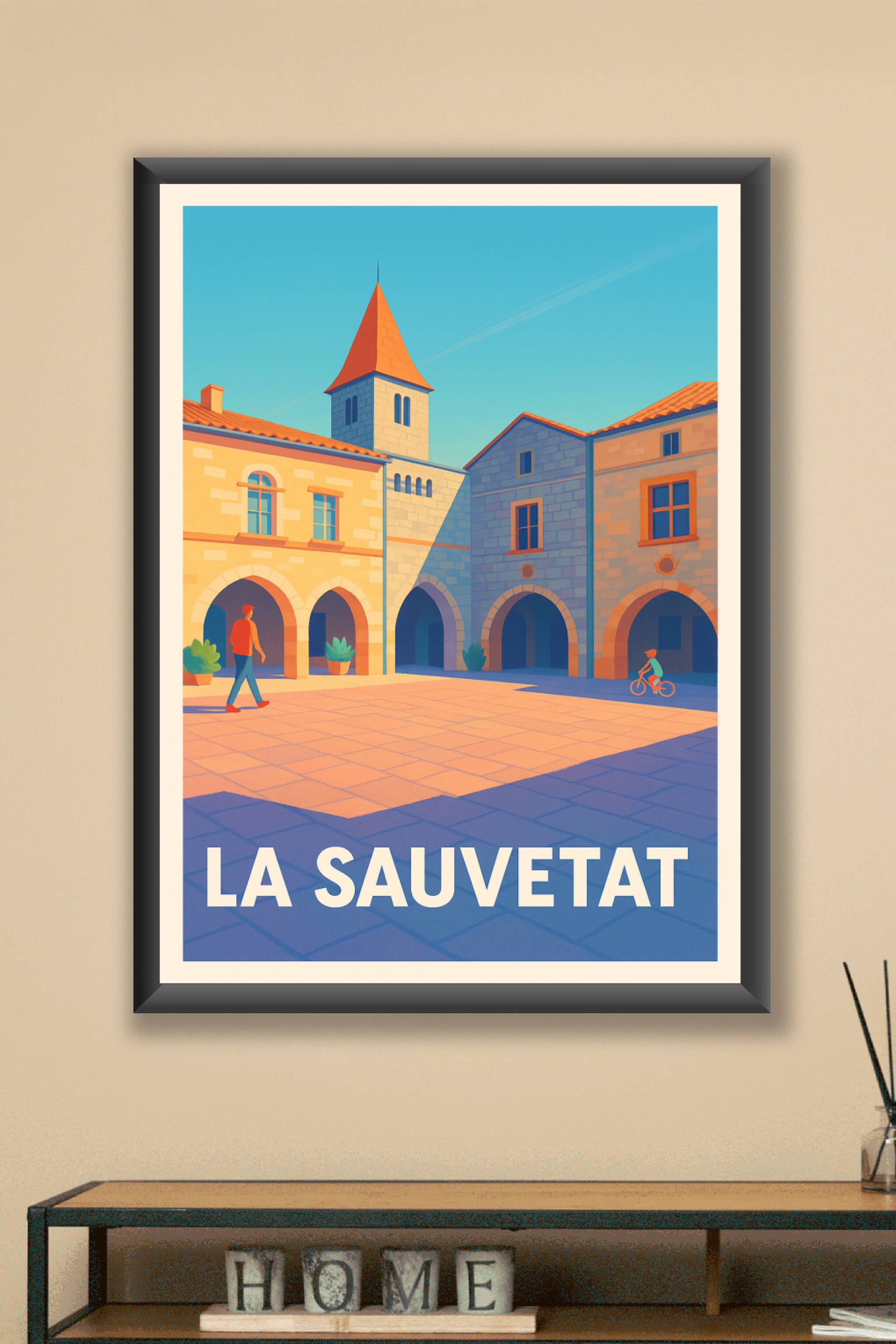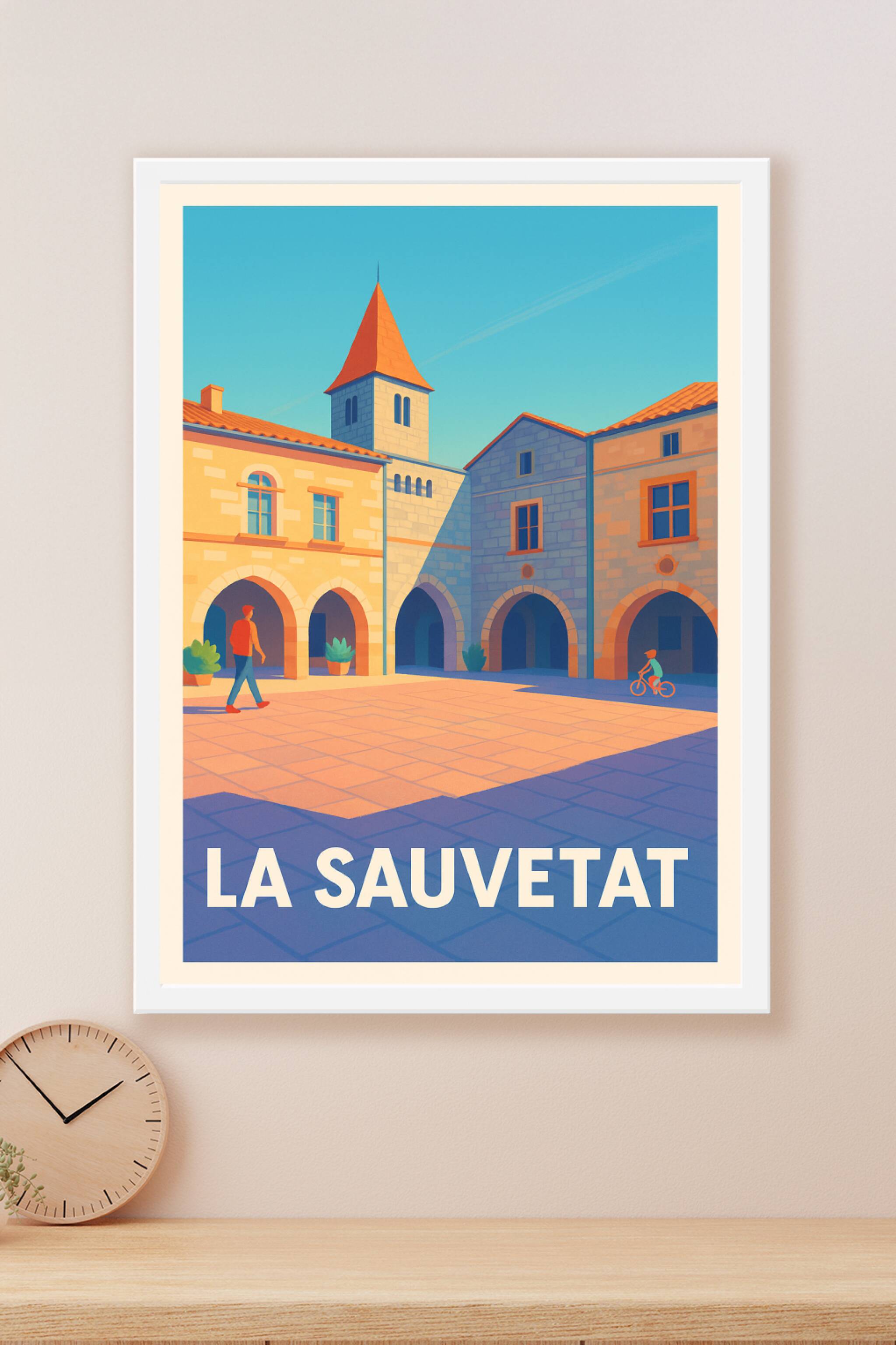 Découvrez l'élégance paisible de La Sauvetat avec cette affiche illustrée capturant la place centrale et ses arcades baignées de lumière. L'ambianc...