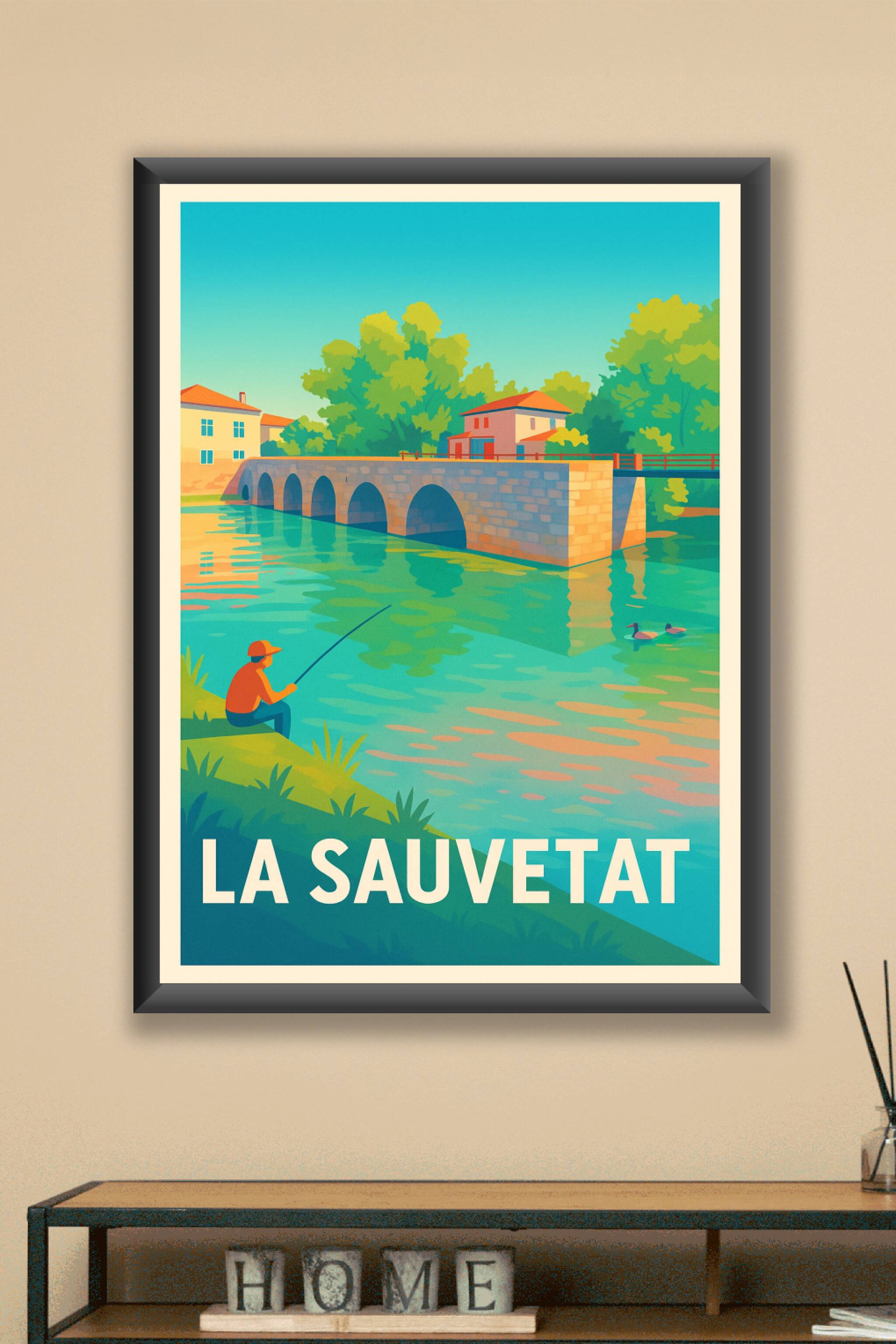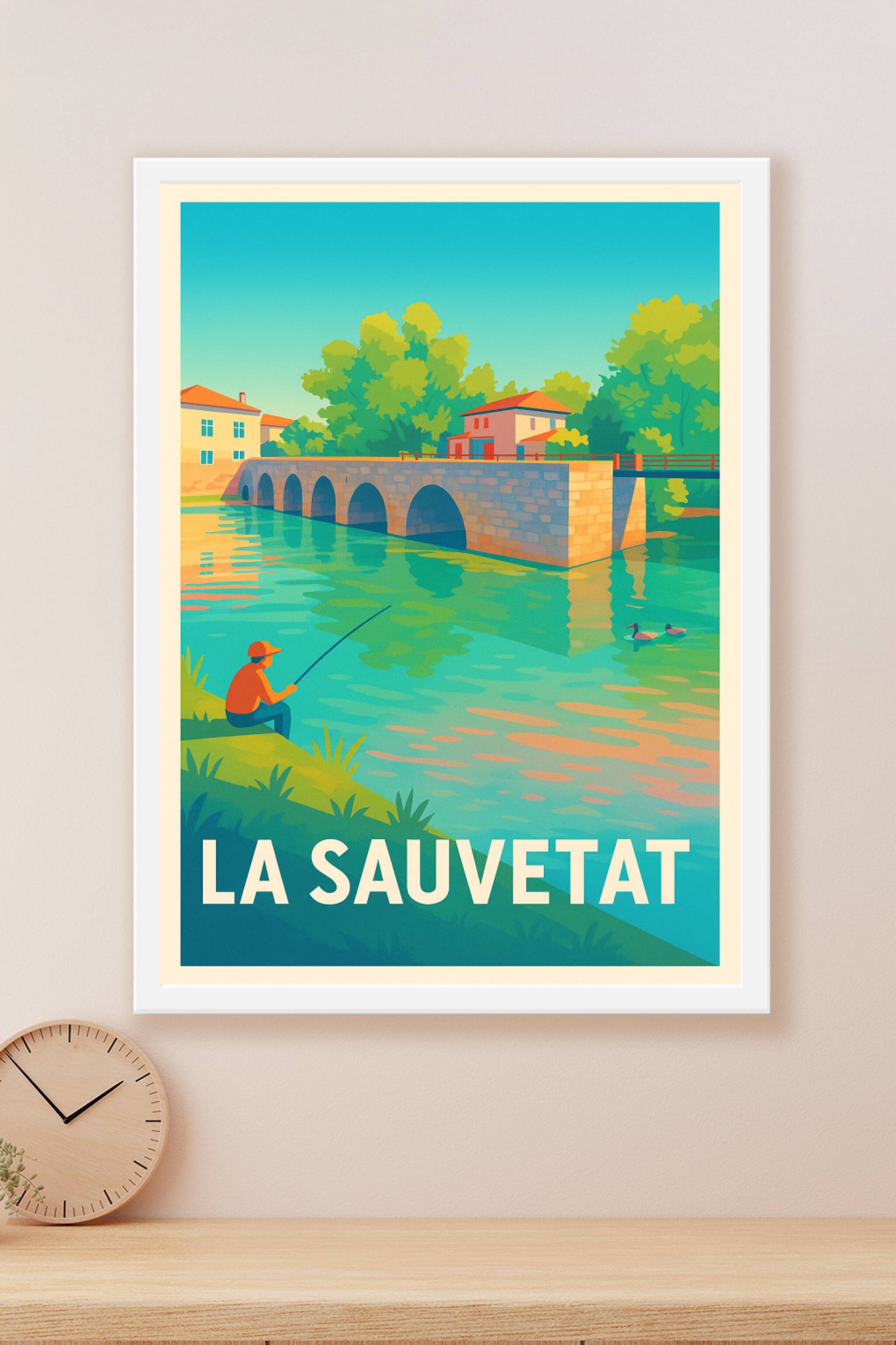 Découvrez la douceur de vivre à La Sauvetat avec cette affiche illustrée mettant en scène un paisible pont en pierre surplombant une rivière où un ...