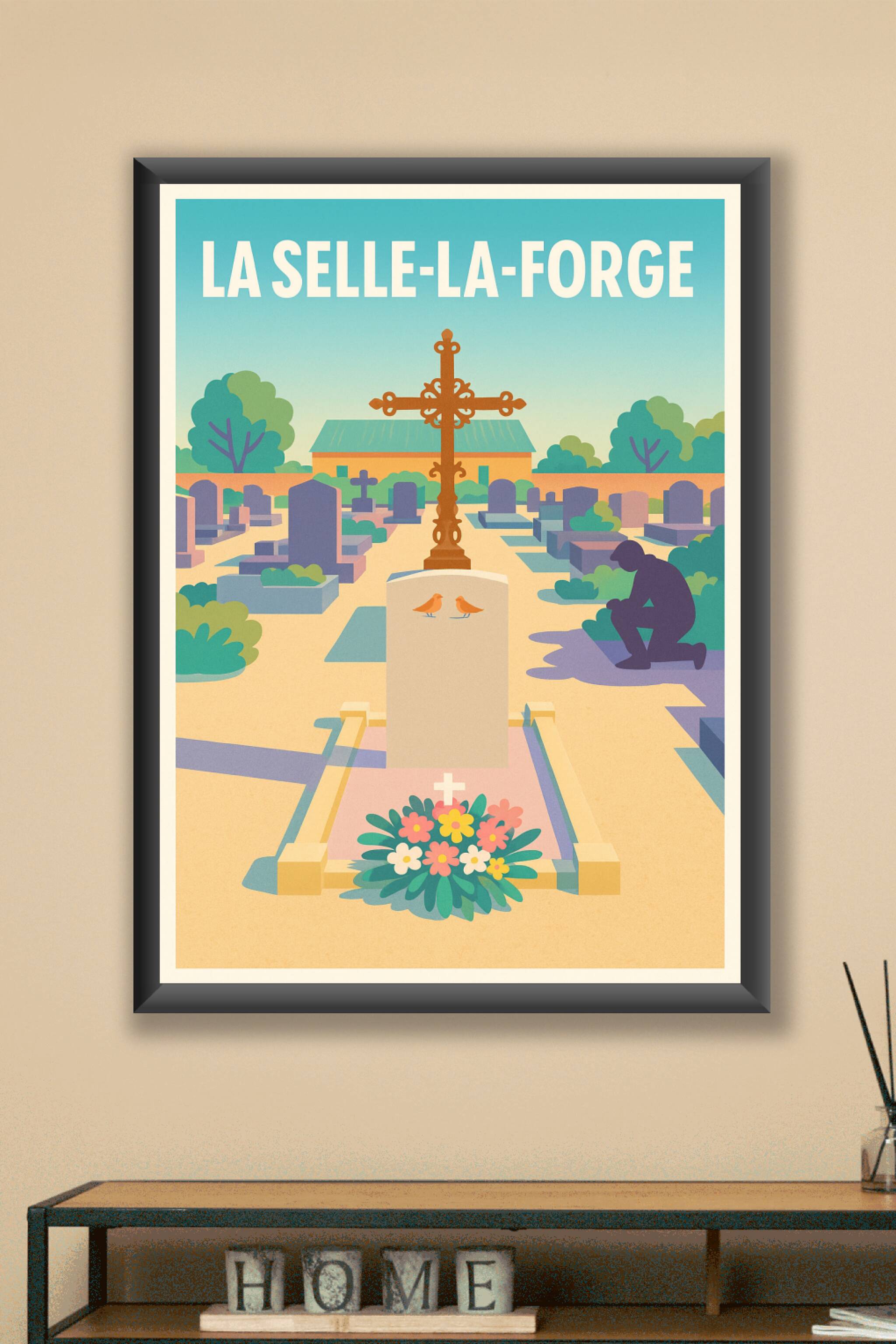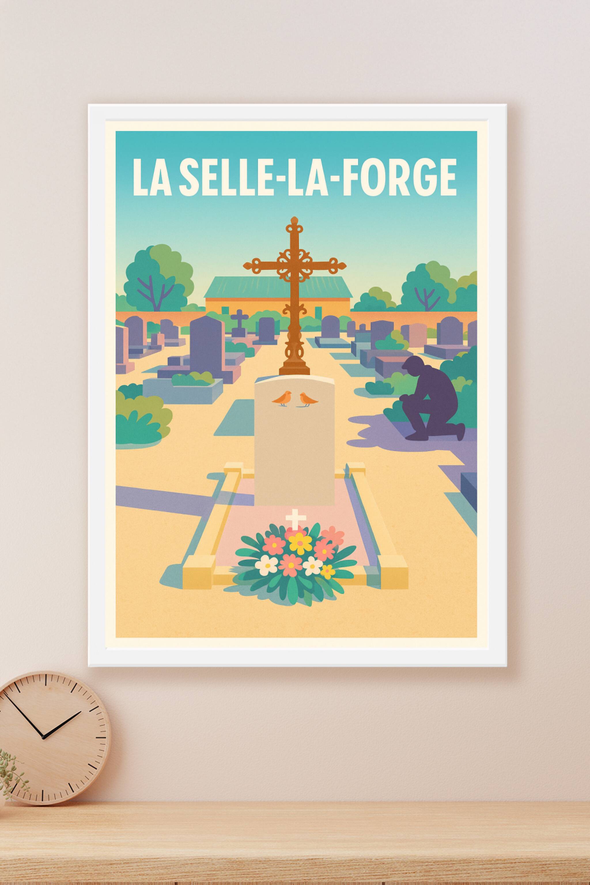 Découvrez cette affiche au style artistique unique représentant un cimetière paisible à La Selle-la-Forge, où chaque détail invite à la contemplati...
