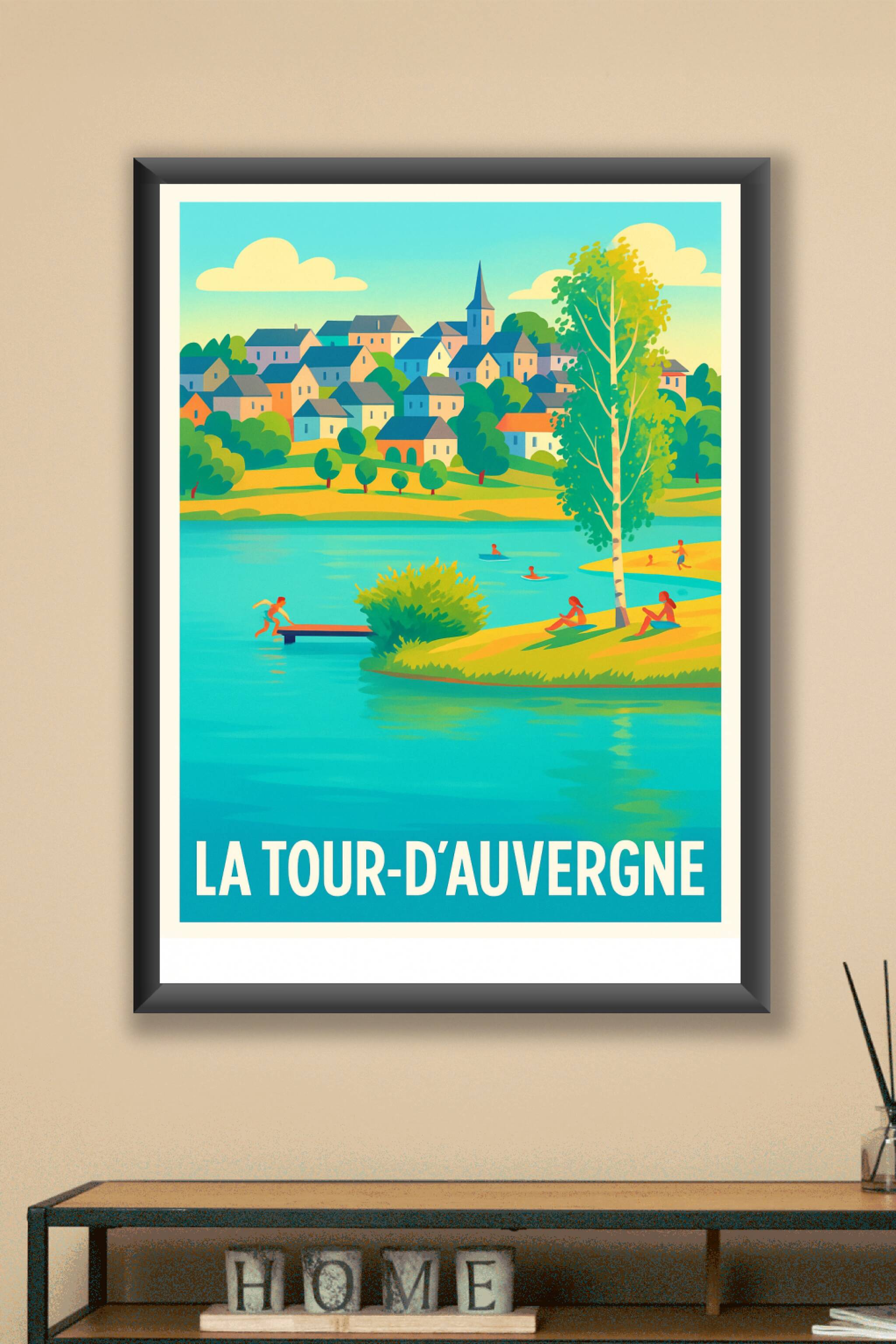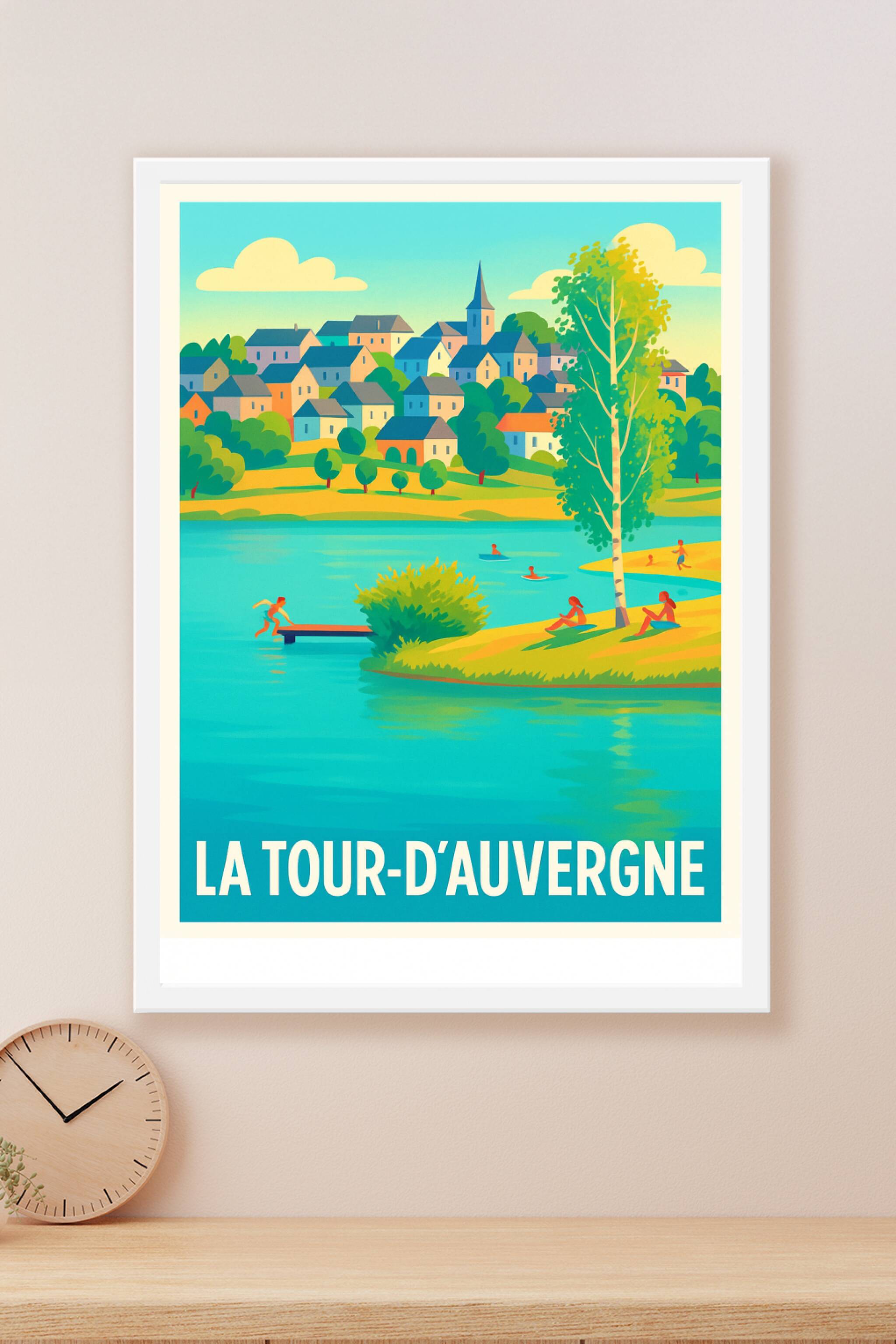 Découvrez la beauté sereine de La Tour-d’Auvergne à travers cette affiche illustrée aux couleurs lumineuses et apaisantes. Ce poster capture un mom...