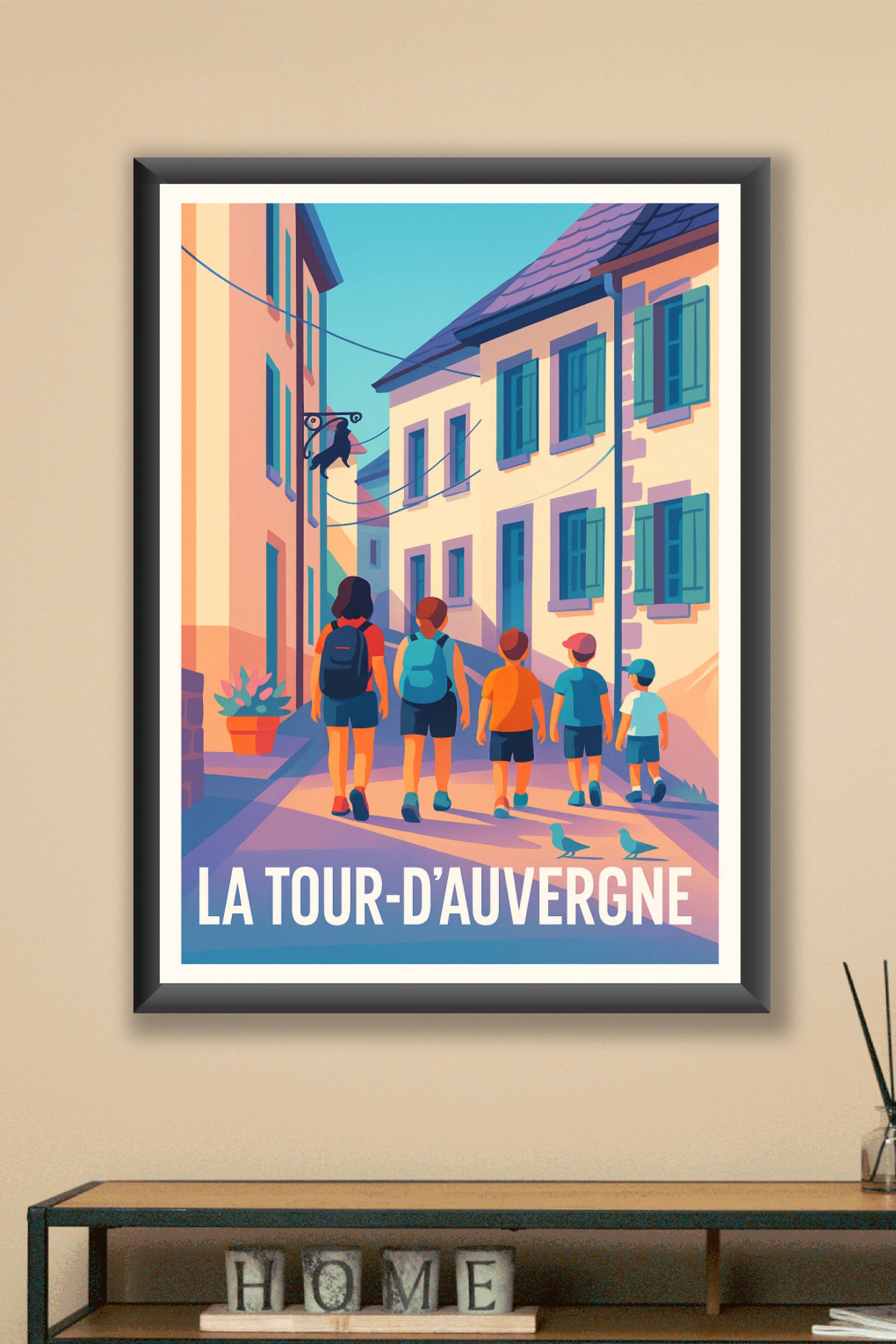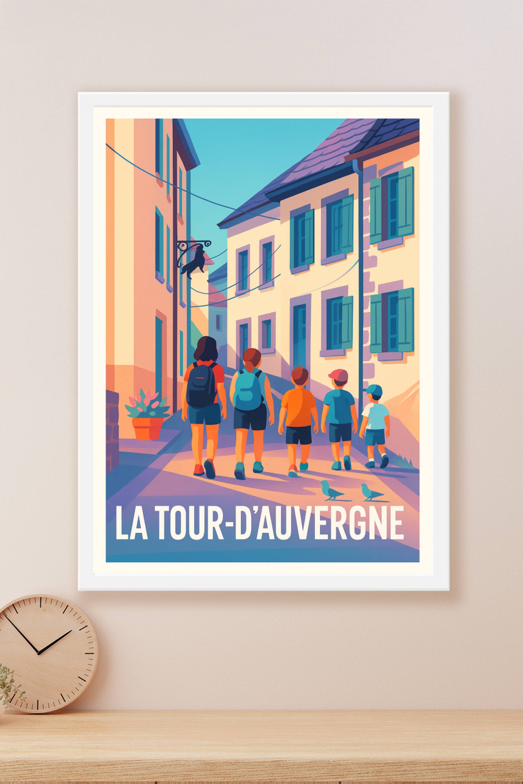 Découvrez l'ambiance chaleureuse et paisible de La Tour-d'Auvergne avec cette affiche illustrée aux couleurs douces et lumineuses. Cette représenta...