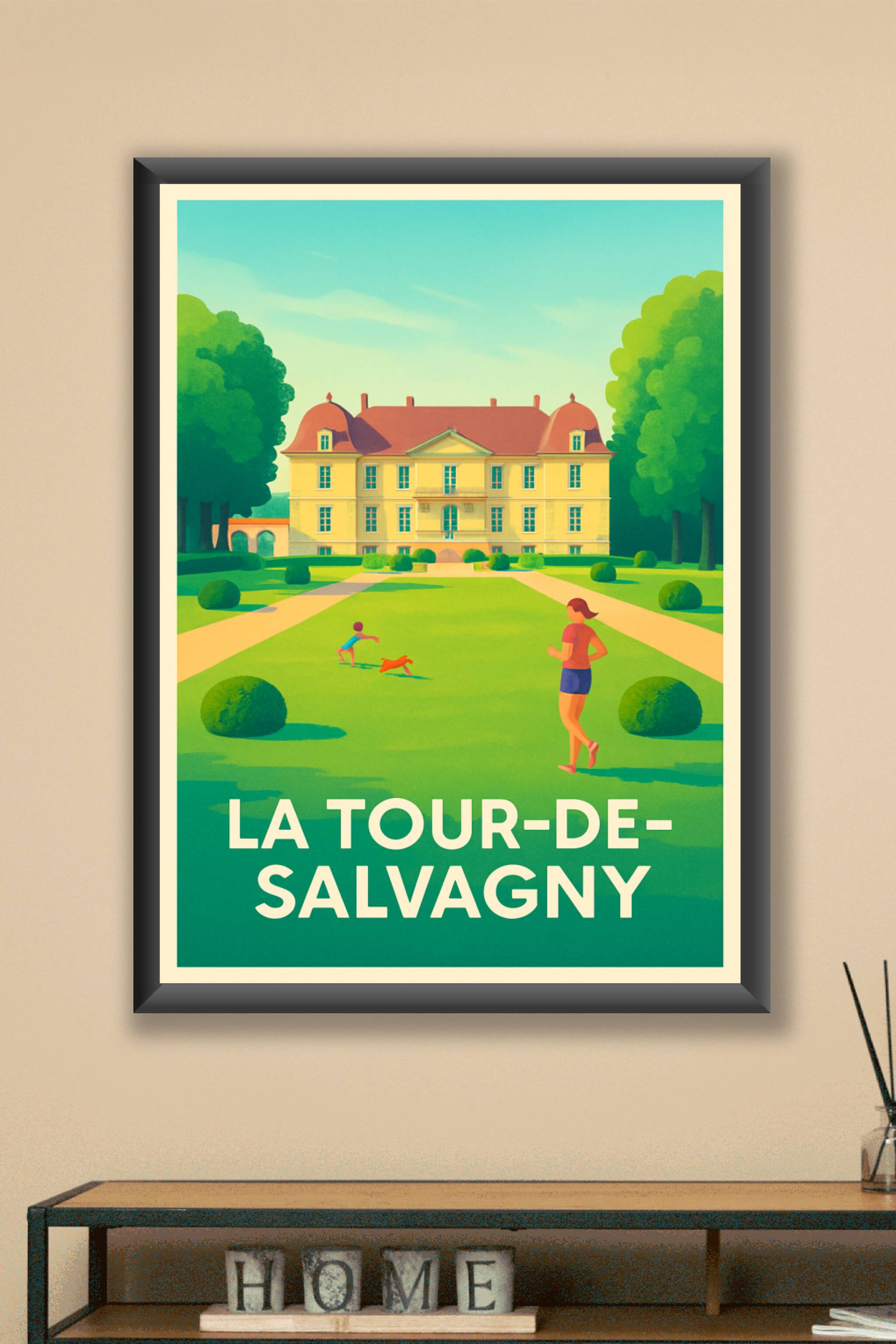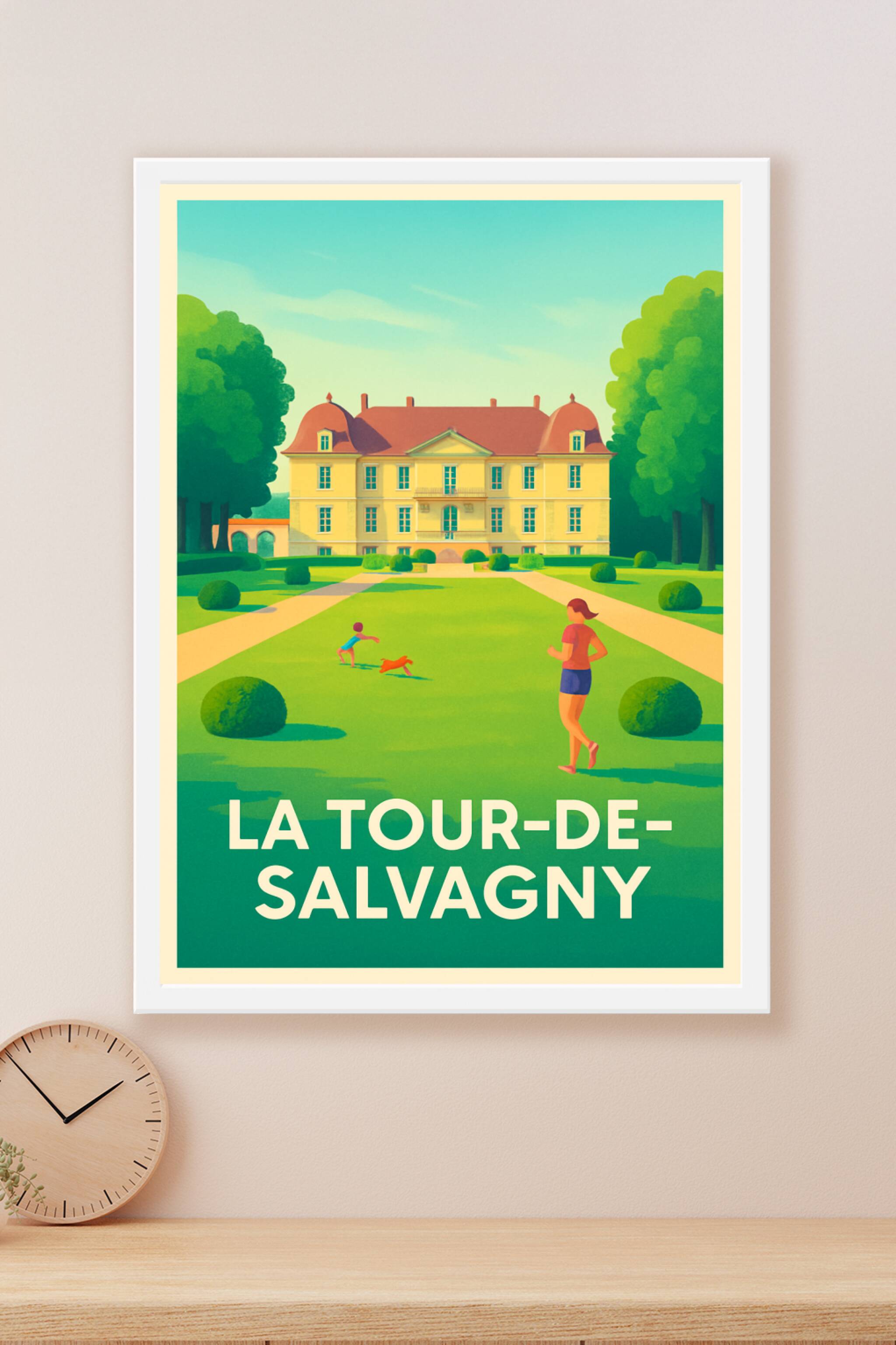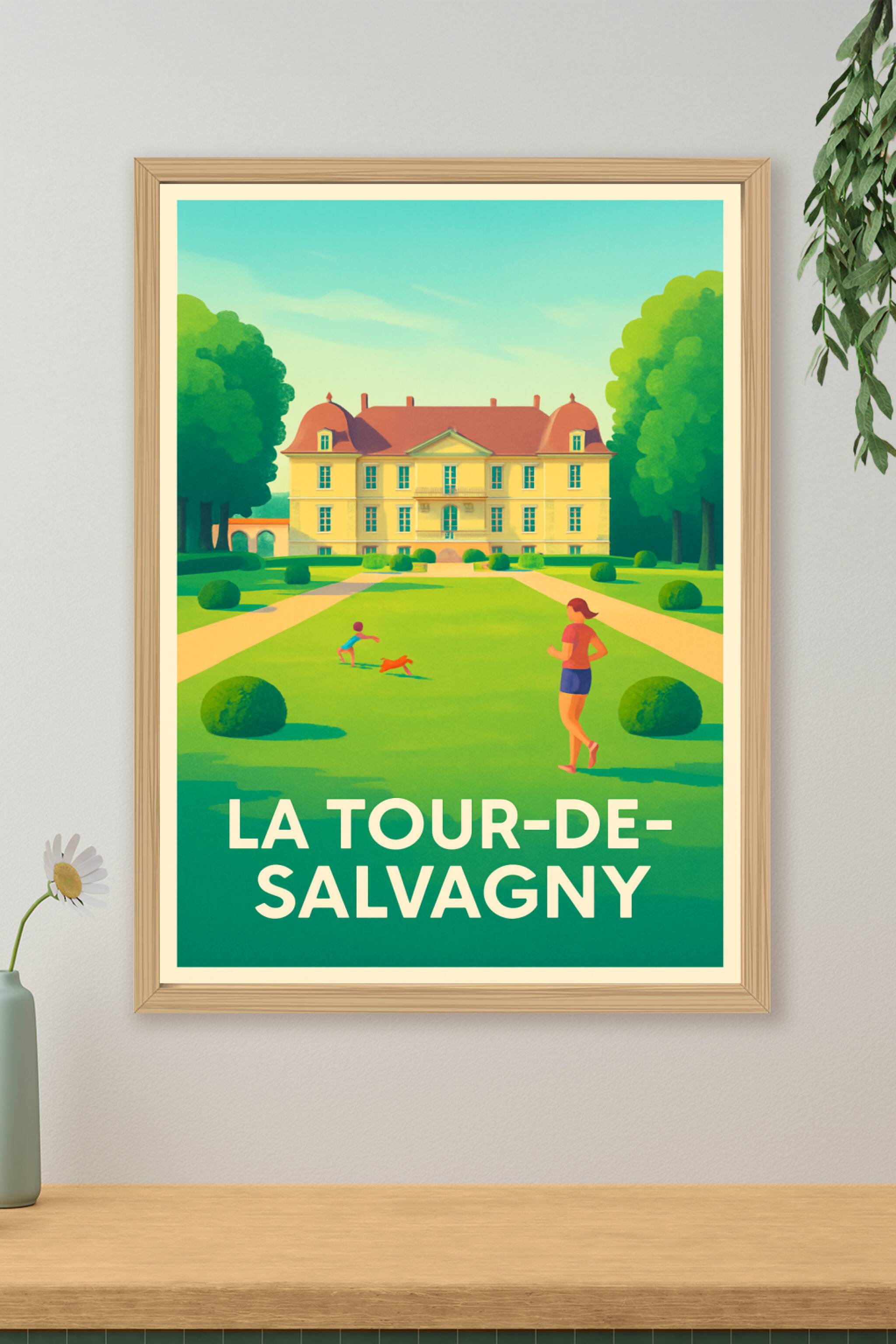 Découvrez ce poster illustré mettant en scène le charme paisible du château de La Tour-de-Salvagny, entouré de ses jardins parfaitement entretenus ...