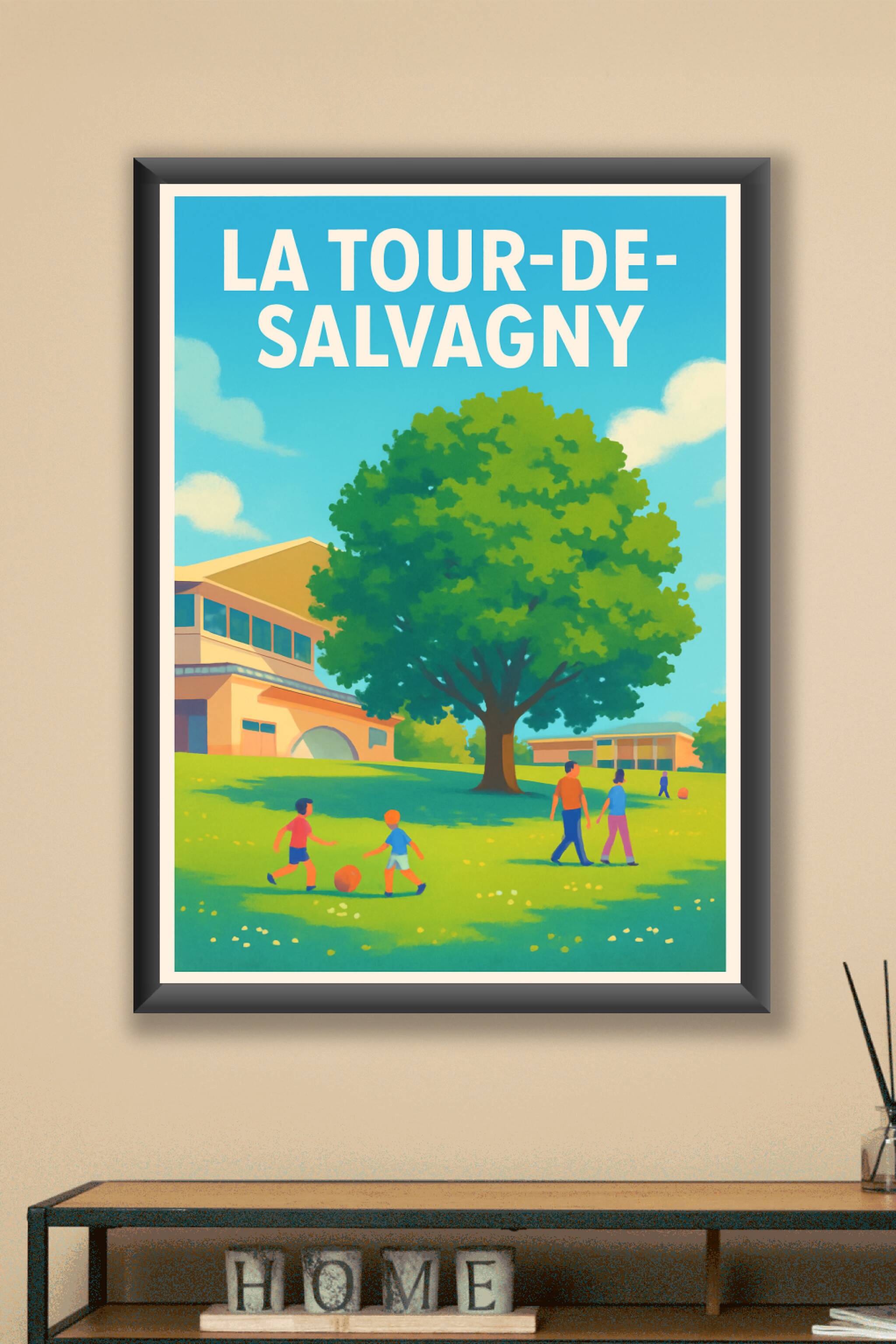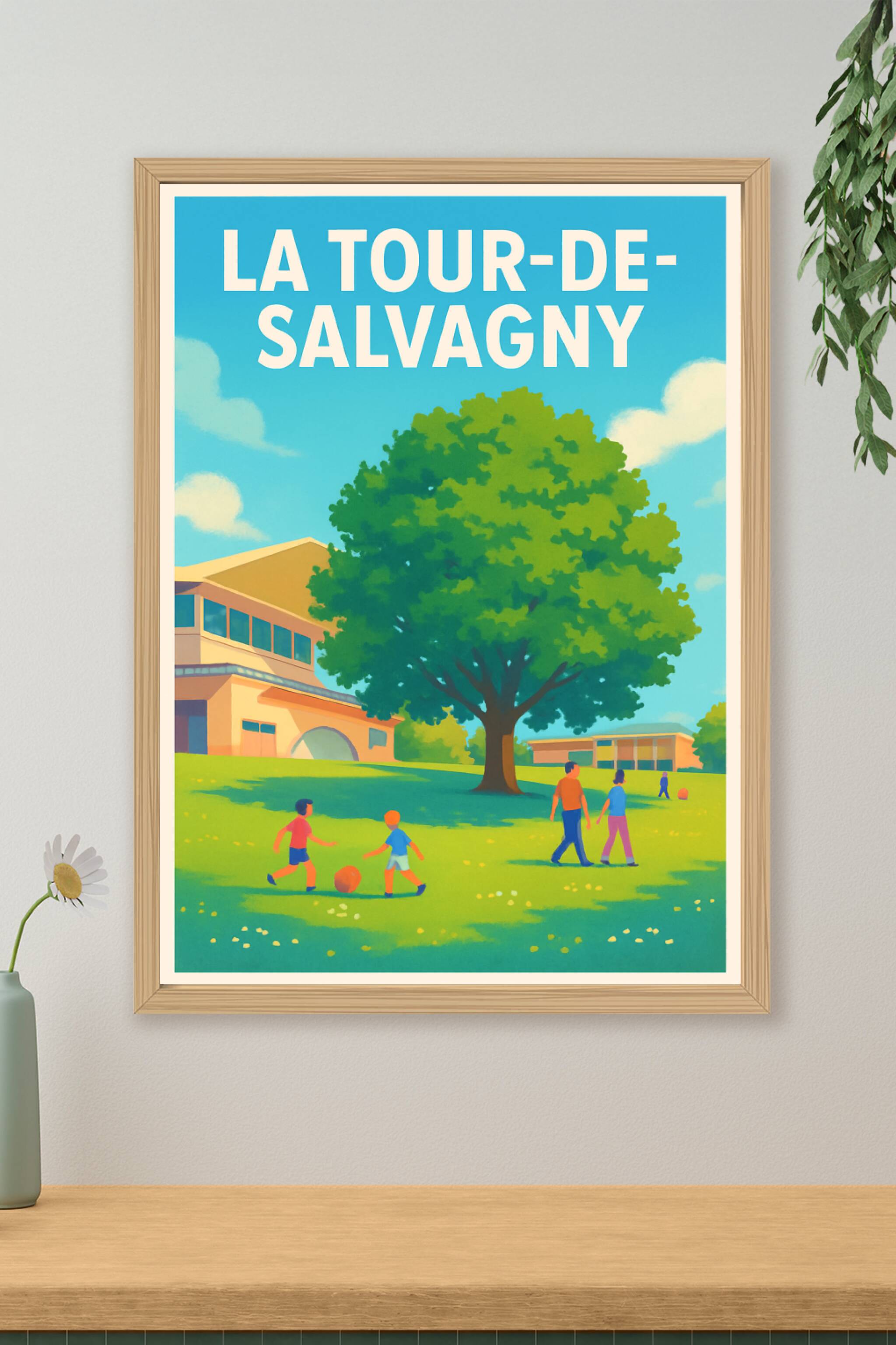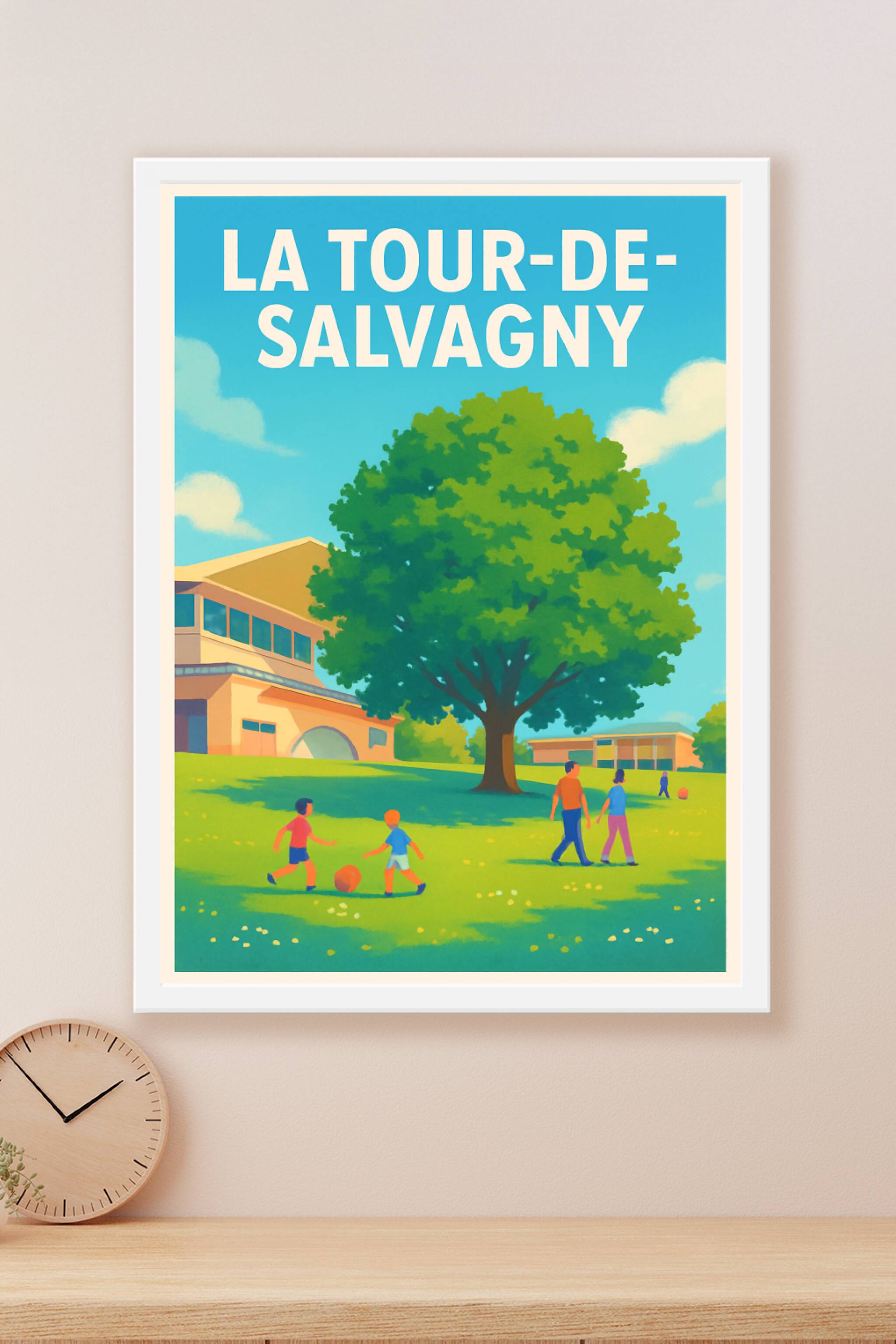 Apportez une touche de sérénité et de fraîcheur à votre intérieur avec cette affiche illustrant une scène paisible à La Tour-de-Salvagny. Cette vue champêtre met en avant un grand arbre ombragé sous un ciel bleu éclatant, où des enfants jouent au ballon et des promeneurs profitent d'une belle journée.Ce poster est proposé en tirage « Fine Art » sur papier 305g coton, garantissant une qualité d'impression remarquable et une longévité optimale. Disponible en formats A1 à A4, avec ou sans cadre, cette affiche s'adapte parfaitement à tous vos espaces de vie ou de travail. Offrez-vous ou offrez un souvenir élégant et coloré de La Tour-de-Salvagny, 100% fabriqué en France.