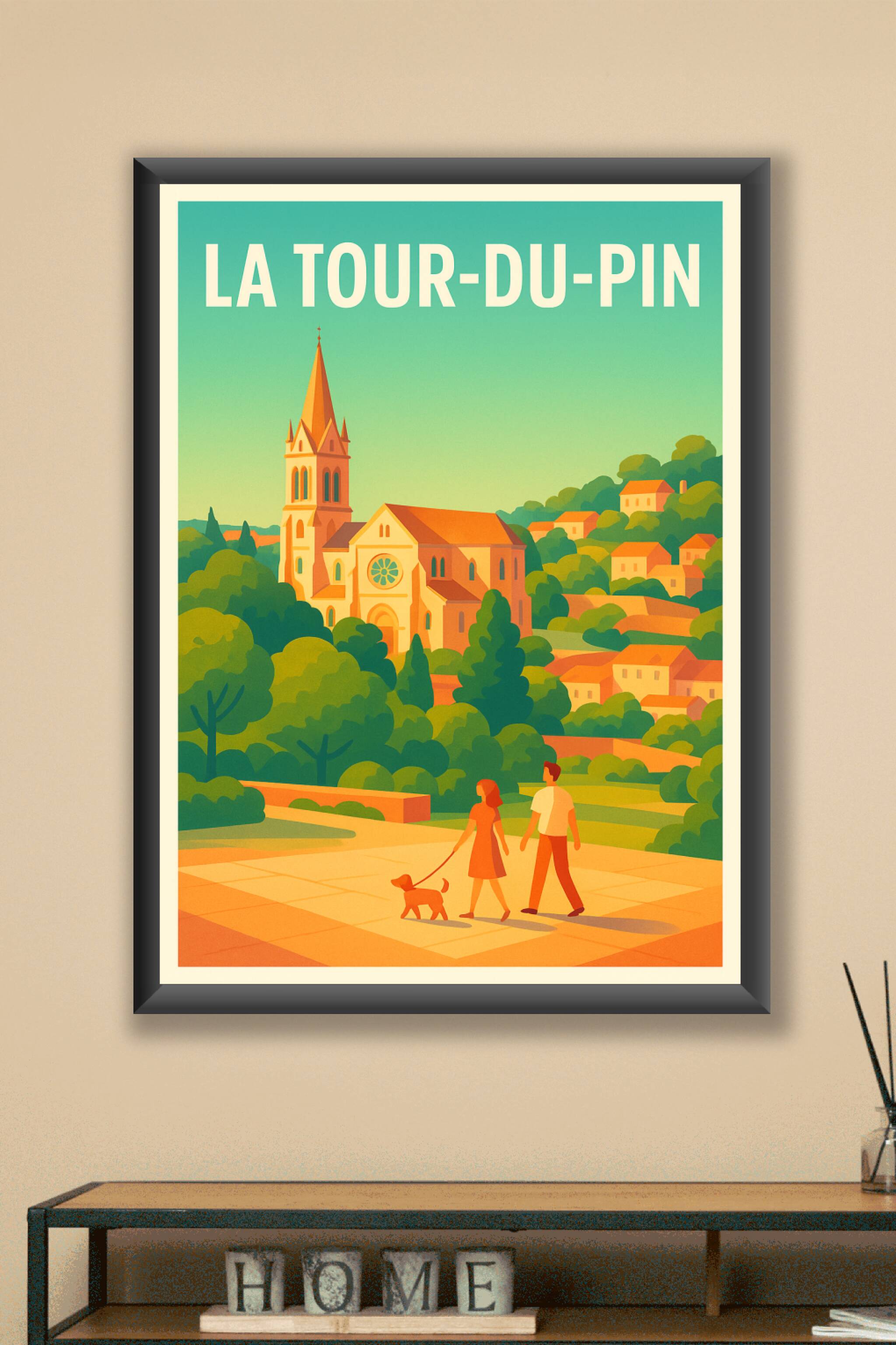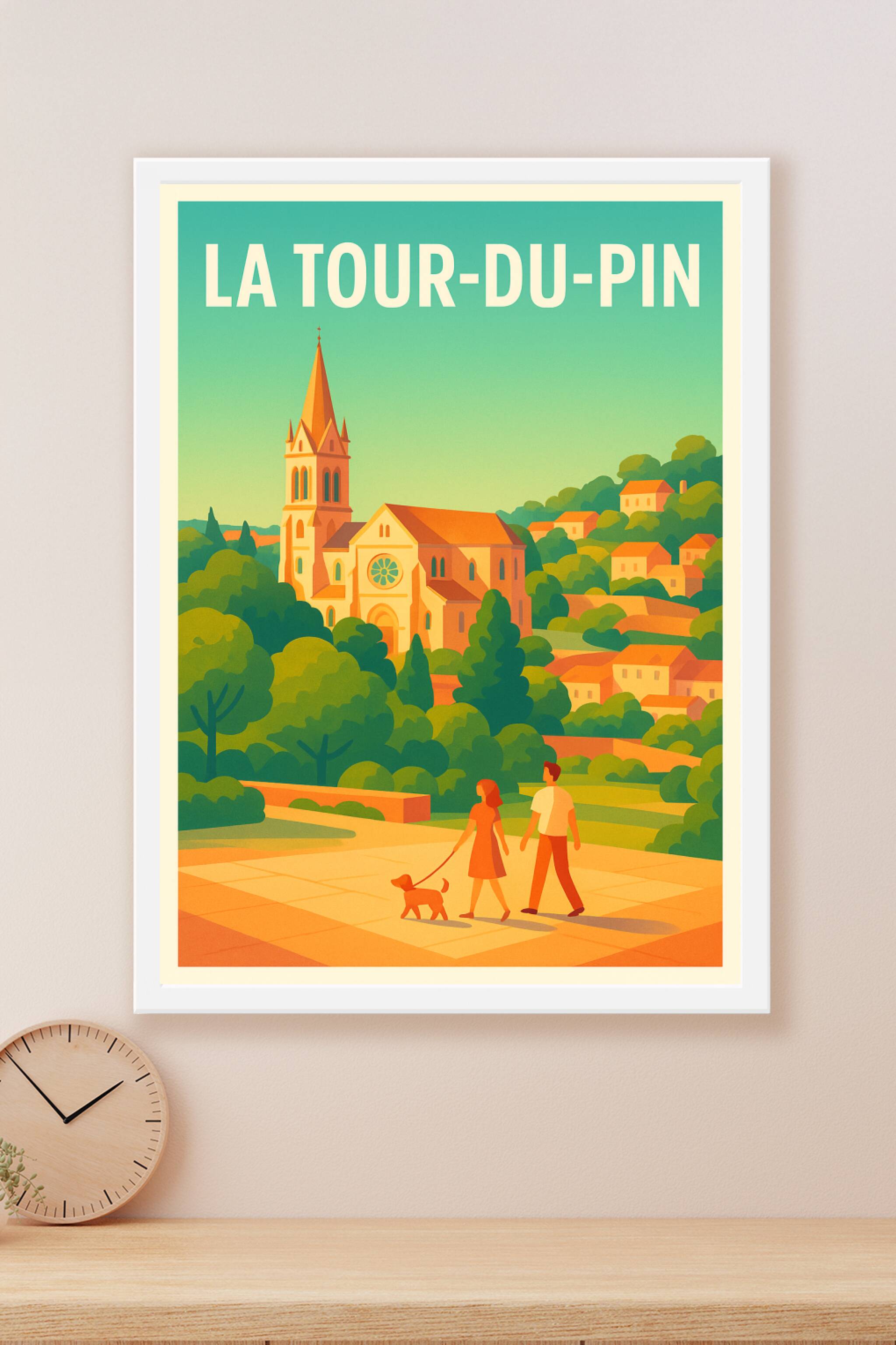 Découvrez le charme paisible de La Tour-du-Pin avec cette affiche illustrée aux couleurs chaleureuses qui mettent en valeur l'architecture emblémat...