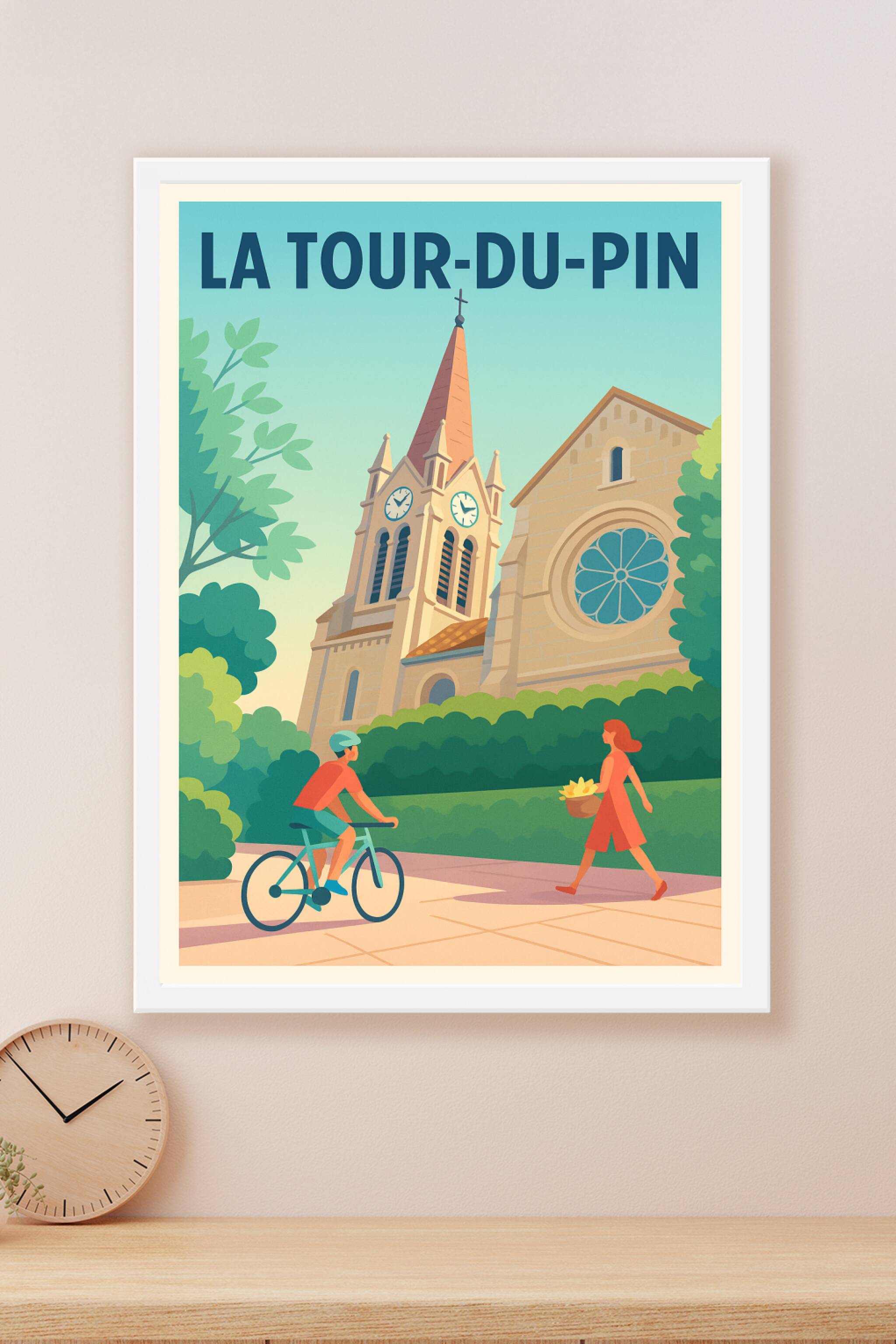 Découvrez la douceur de vivre de La Tour-du-Pin avec cette superbe affiche illustrée qui met en valeur l'emblématique église du centre-ville, baign...