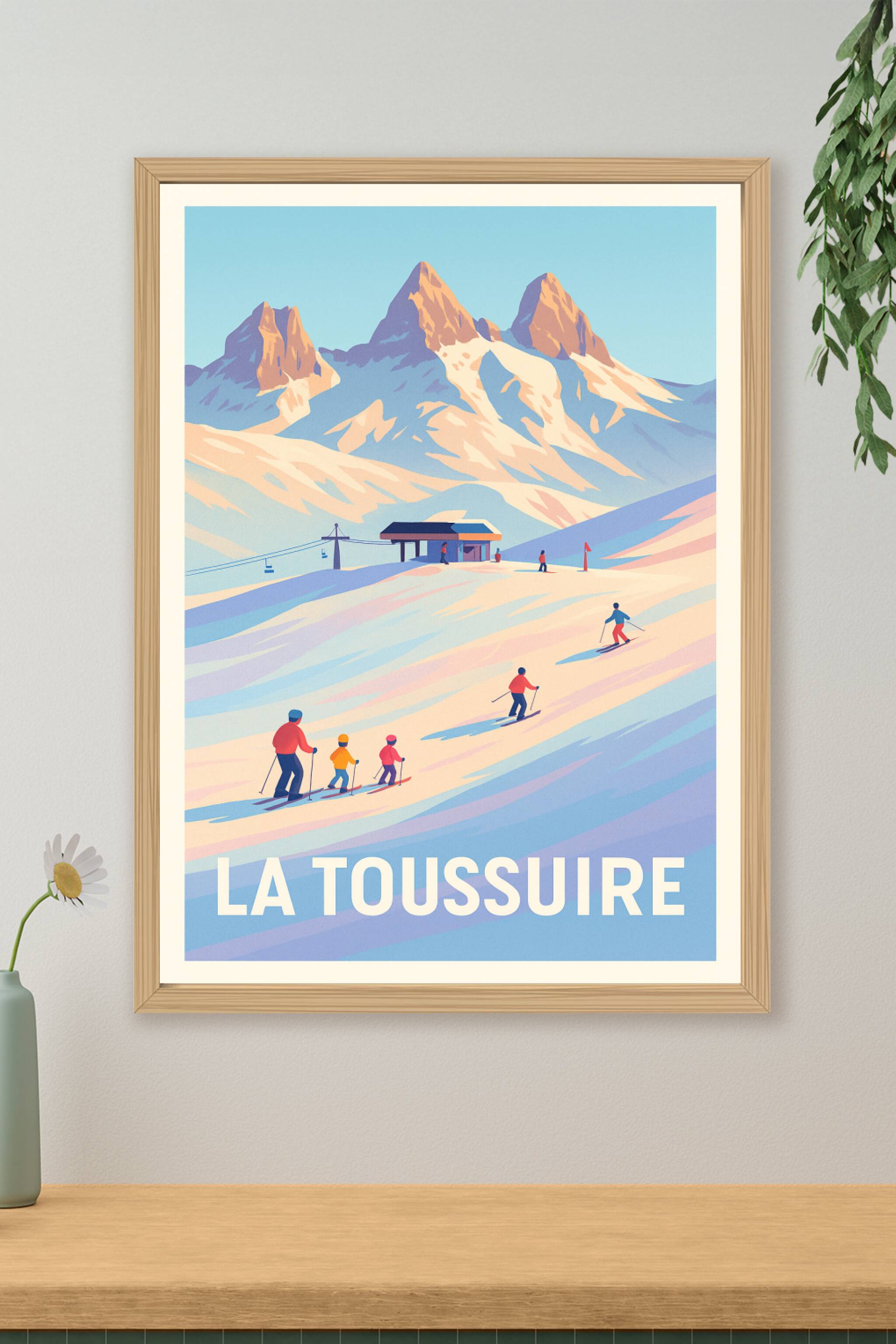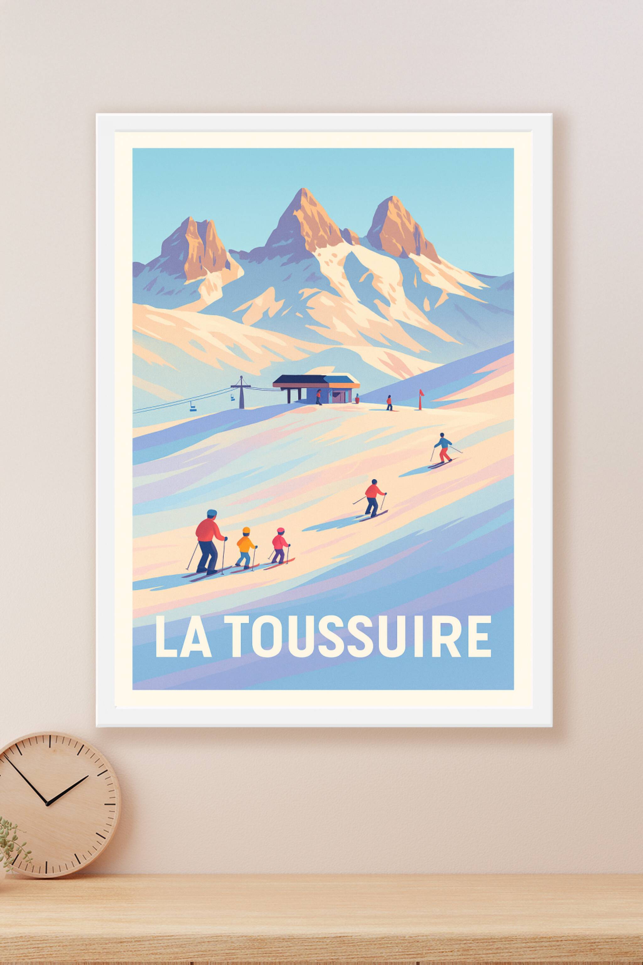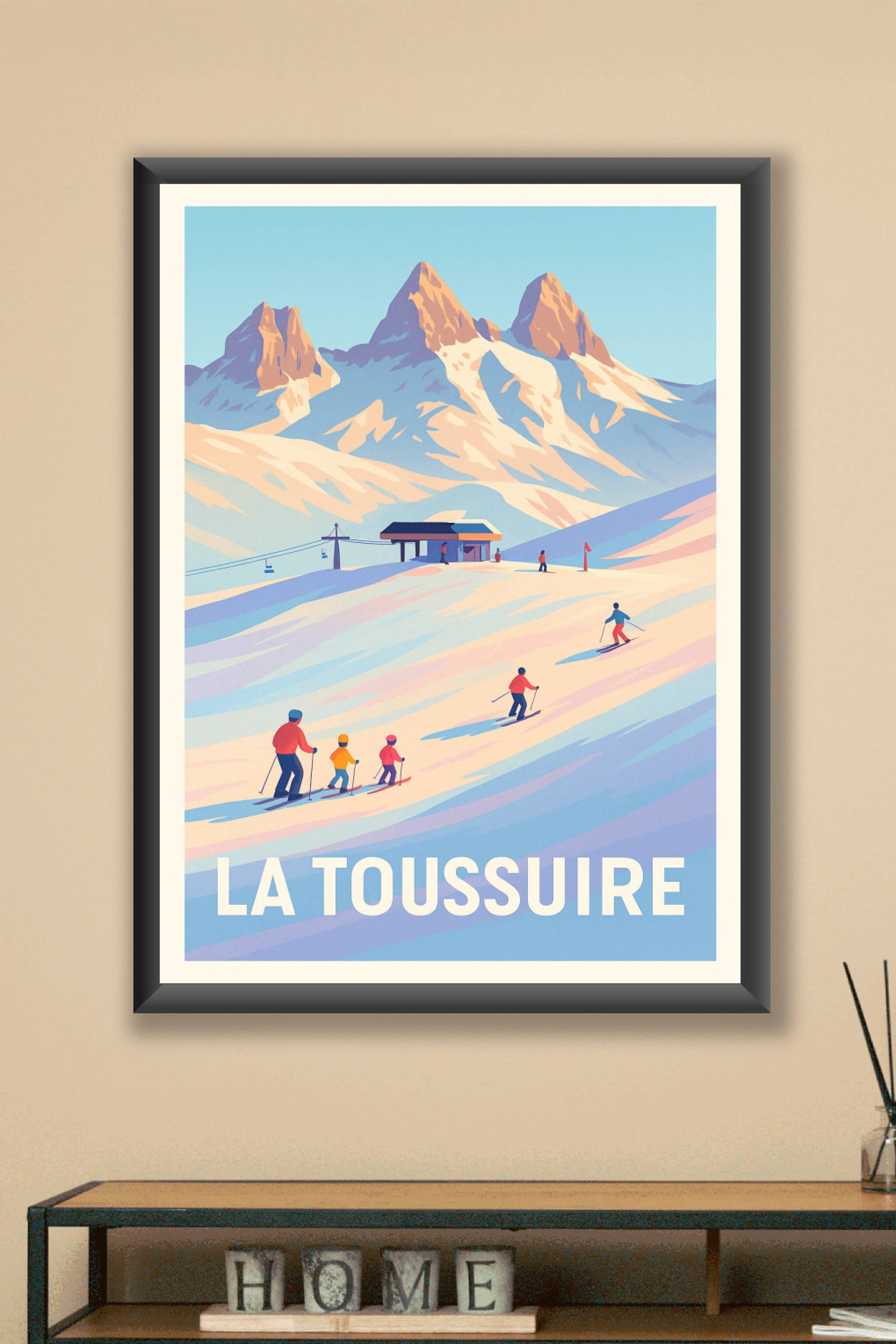 Découvrez la magie de La Toussuire avec cette affiche vintage représentant une scène enneigée et ensoleillée où skieurs et montagnes majestueuses se côtoient dans un cadre idyllique. Ce poster évoque à la fois l'aventure et la douceur des vacances en station de ski, parfait pour les passionnés de montagne et d'hiver.Cette affiche est disponible en tirage Fine Art sur papier 305g coton, garantissant une qualité d'impression exceptionnelle et des couleurs éclatantes qui dureront dans le temps. Choisissez parmi les formats A1, A2, A3 et A4, avec ou sans cadre, pour adapter parfaitement ce poster à votre intérieur ou en faire un cadeau unique. Profitez d'un produit premium entièrement fabriqué en France pour sublimer votre décoration avec une ambiance alpine authentique.