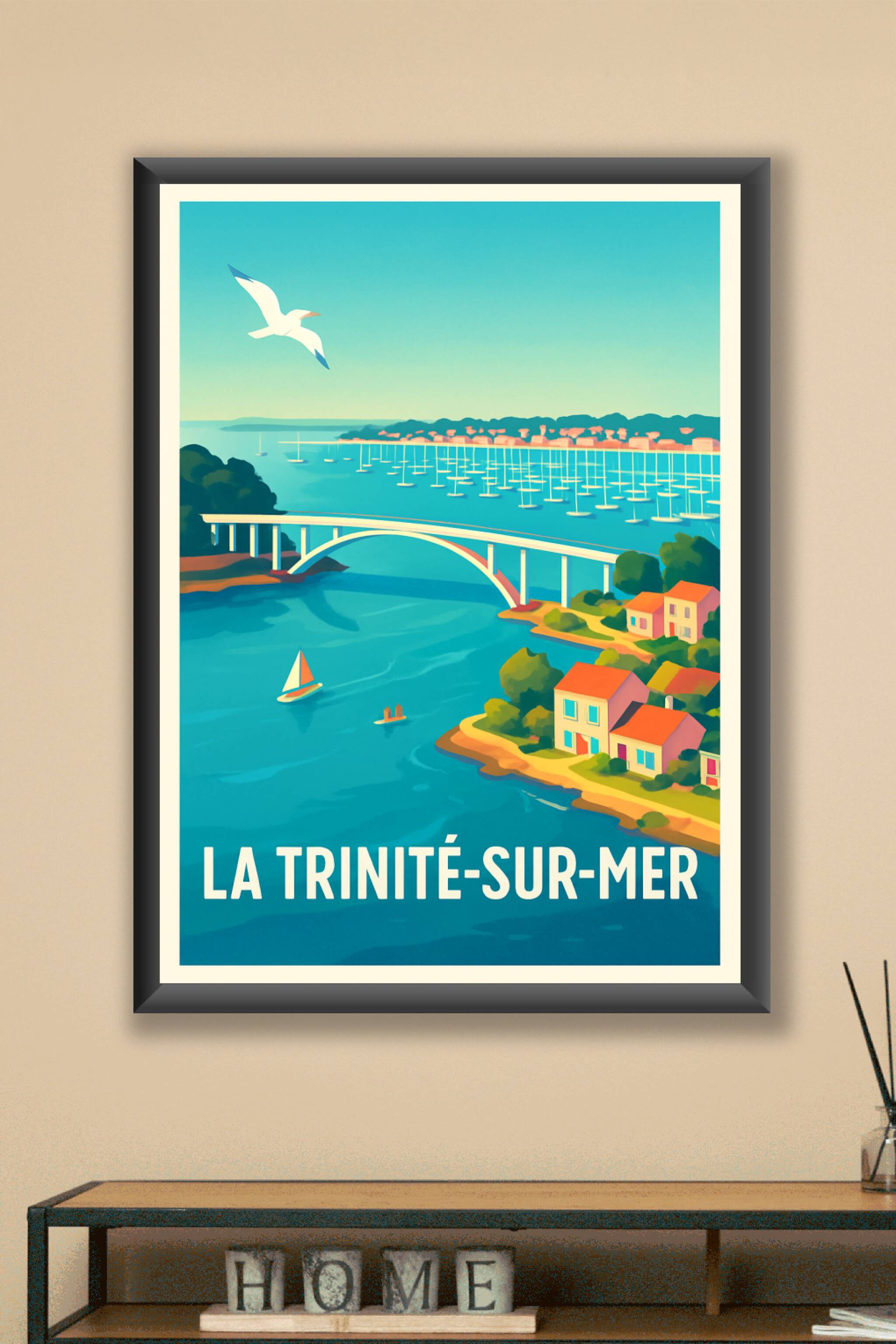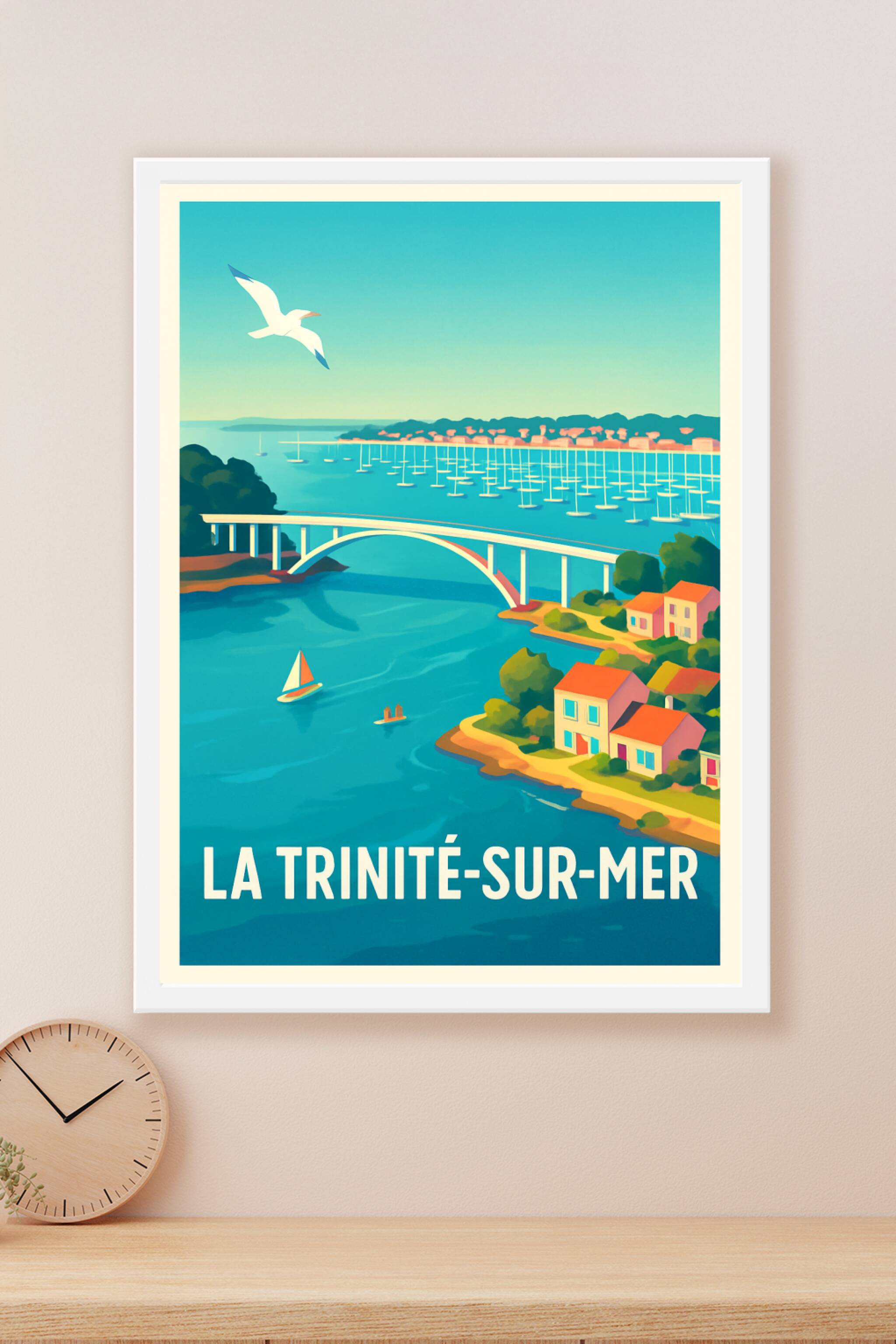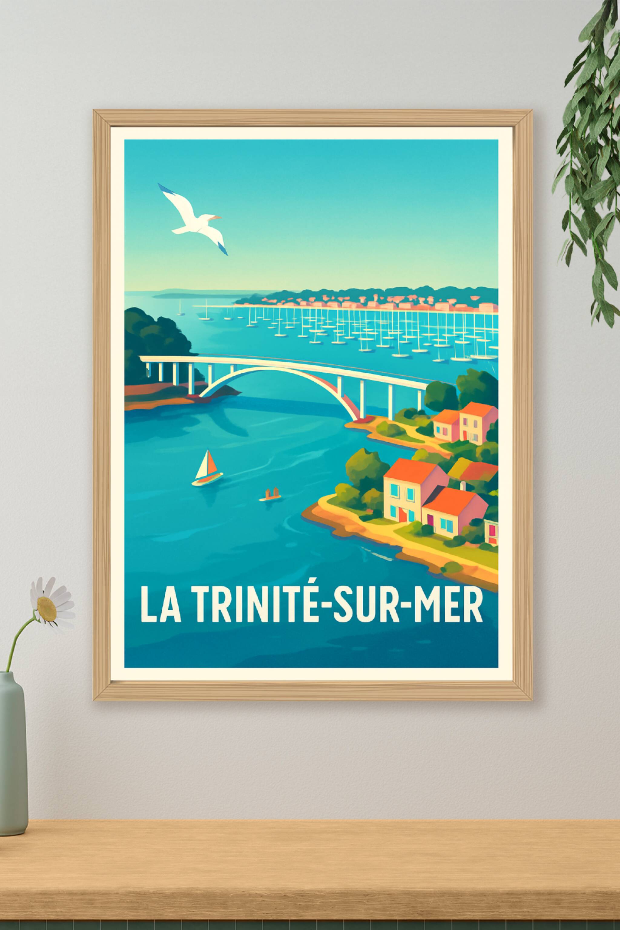 Découvrez l'élégance et la sérénité de La Trinité-sur-Mer avec cette affiche au style rétro, mettant en valeur son célèbre pont et ses eaux paisibl...