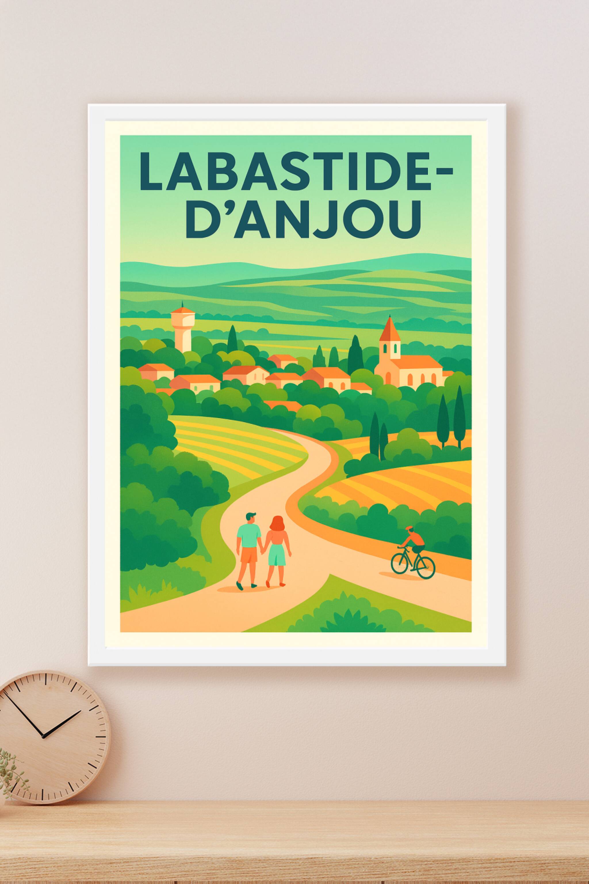 Découvrez ce poster charmant qui capture l'essence paisible de Labastide-d'Anjou, avec ses paysages verdoyants, ses collines ondulantes et son vill...