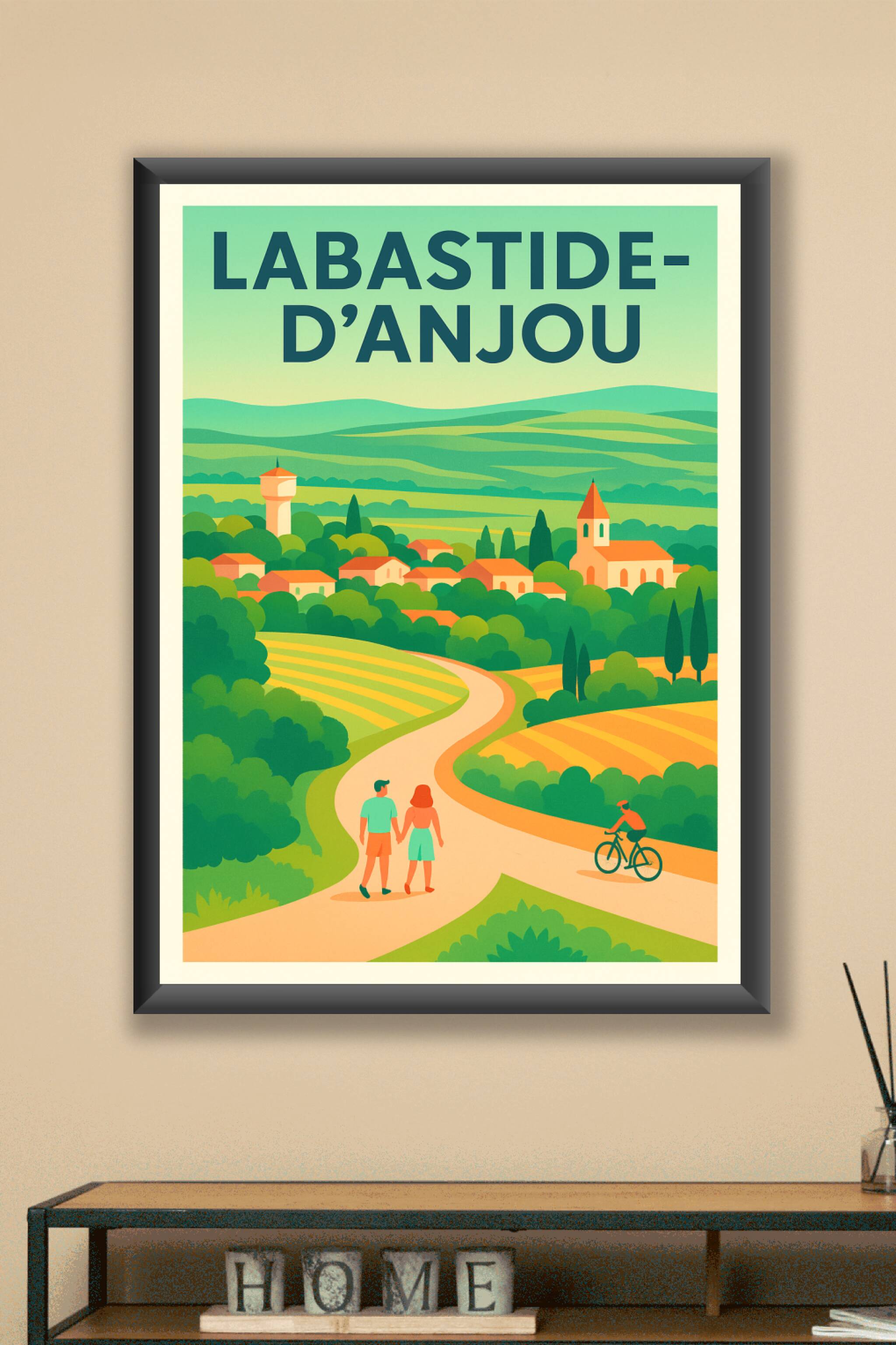 Découvrez ce poster charmant qui capture l'essence paisible de Labastide-d'Anjou, avec ses paysages verdoyants, ses collines ondulantes et son village pittoresque. Cette affiche illustre une balade à pied et une promenade à vélo, symboles d'une vie bucolique au cœur de la nature. Imprimée en tirage "Fine Art" sur un papier 305g coton, cette affiche garantit une excellente tenue des couleurs et une qualité d'impression premium. Disponible en formats A1 à A4, avec ou sans cadre, elle s'intègre parfaitement à tout intérieur, apportant une touche douce et authentique. Sublimez votre décoration ou offrez ce poster comme un souvenir raffiné de cette belle destination.
