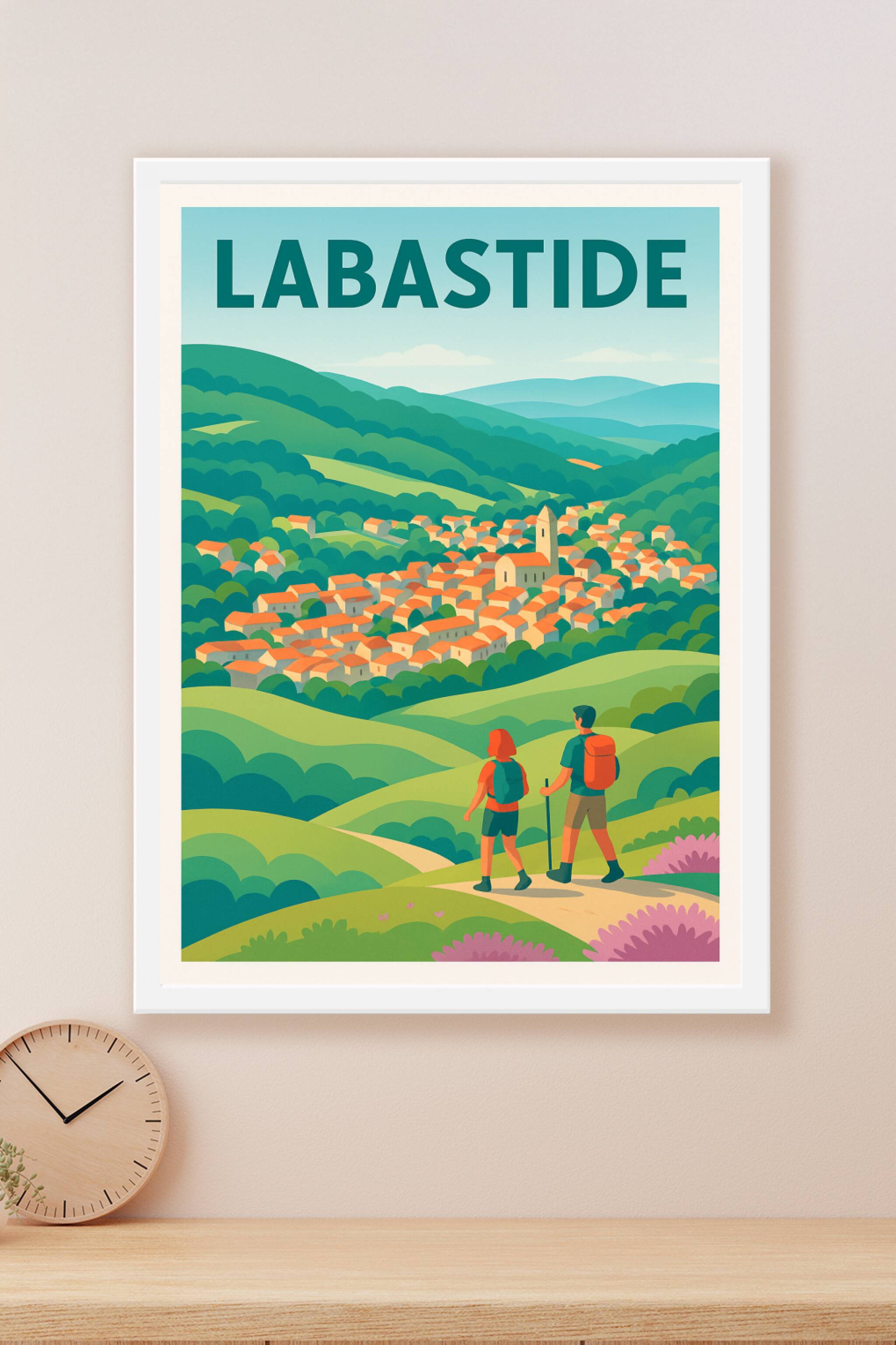 Découvrez la sérénité des paysages vallonnés autour de Labastide avec cette affiche illustrée au style chaleureux et coloré. Ce poster met en scène deux randonneurs admirant la charmante ville nichée au milieu des collines verdoyantes. Imprimée en tirage "Fine Art" sur papier 305g coton, cette affiche garantit une qualité d'impression supérieure et un rendu éclatant des couleurs. Disponible en formats A1 à A4, avec ou sans cadre, elle s'intégrera parfaitement à votre décoration intérieure ou fera un cadeau idéal pour les amoureux de nature et de paysages authentiques. Offrez à votre intérieur une touche d'évasion et d'aventure grâce à cette superbe affiche de Labastide.