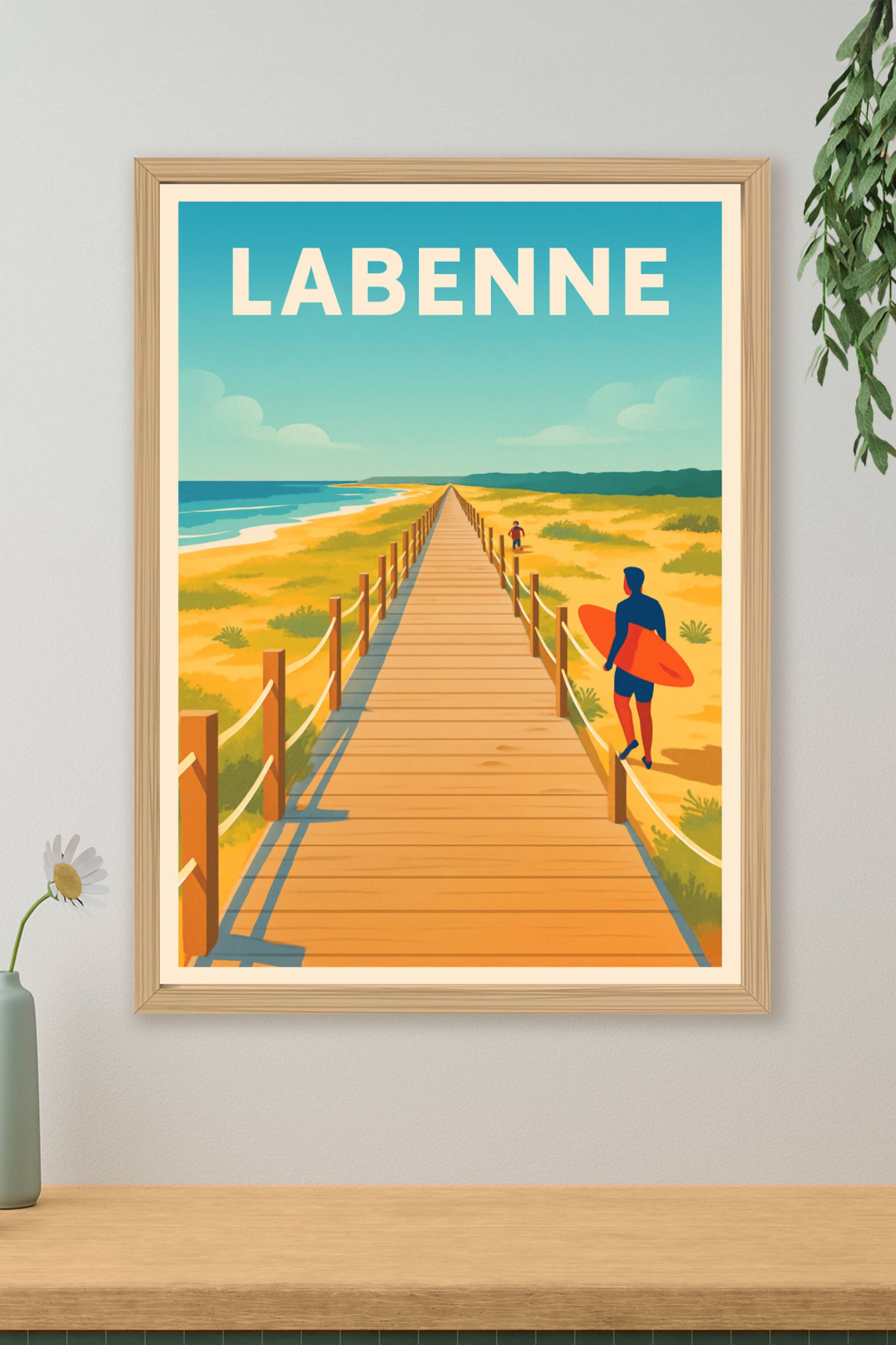 Découvrez la beauté authentique de Labenne avec cette affiche illustrée au style vintage, mettant en scène une promenade en bois qui mène aux plage...