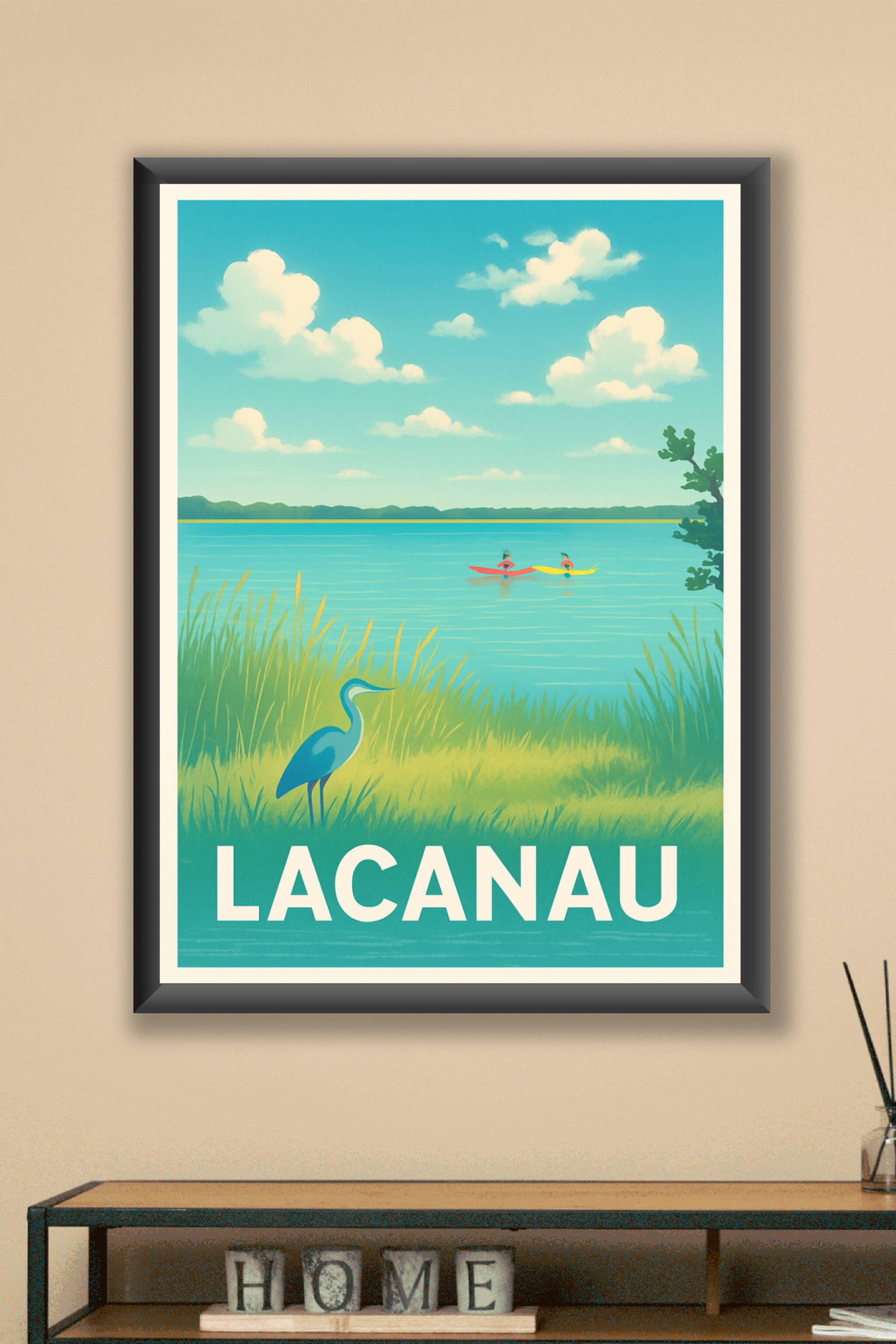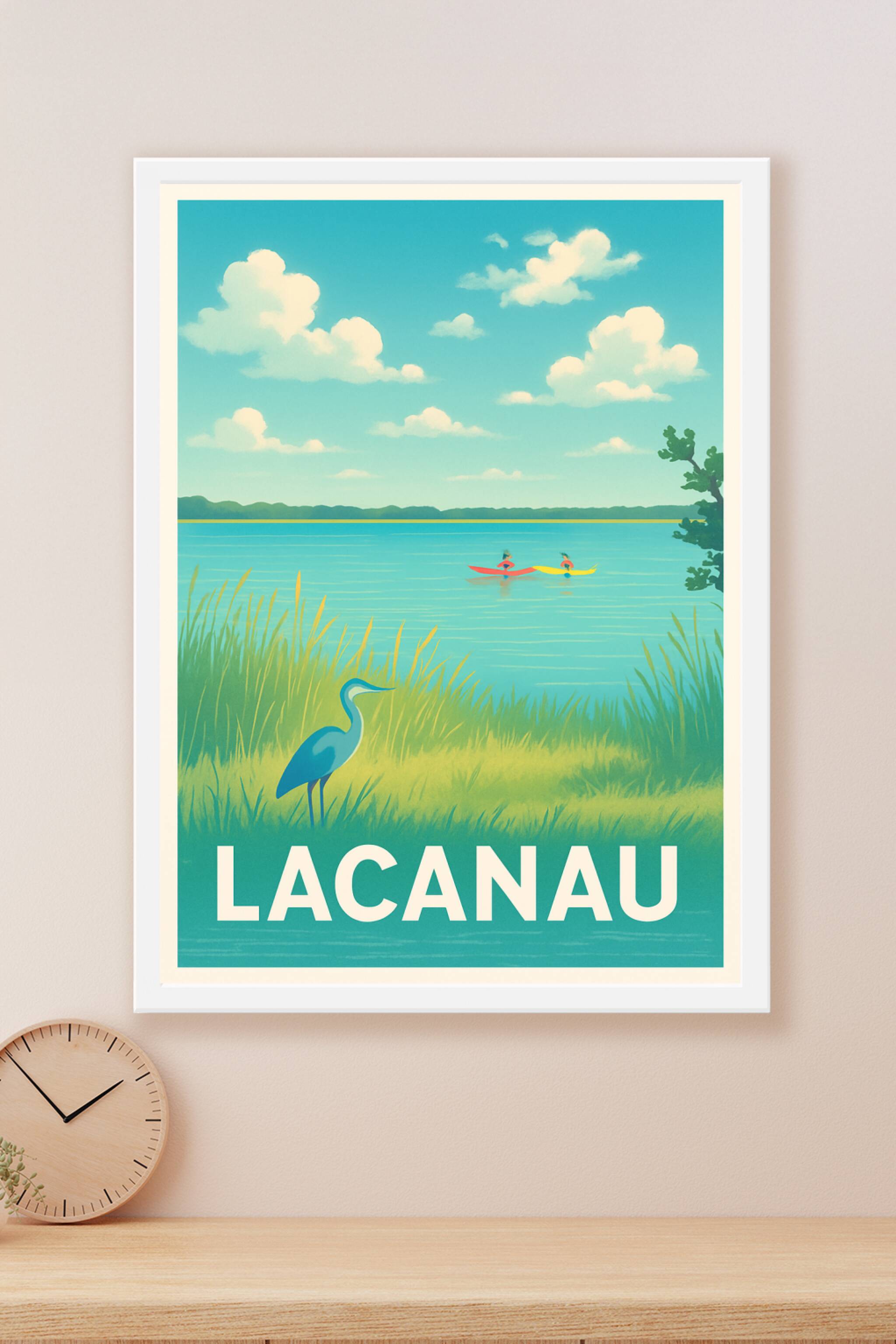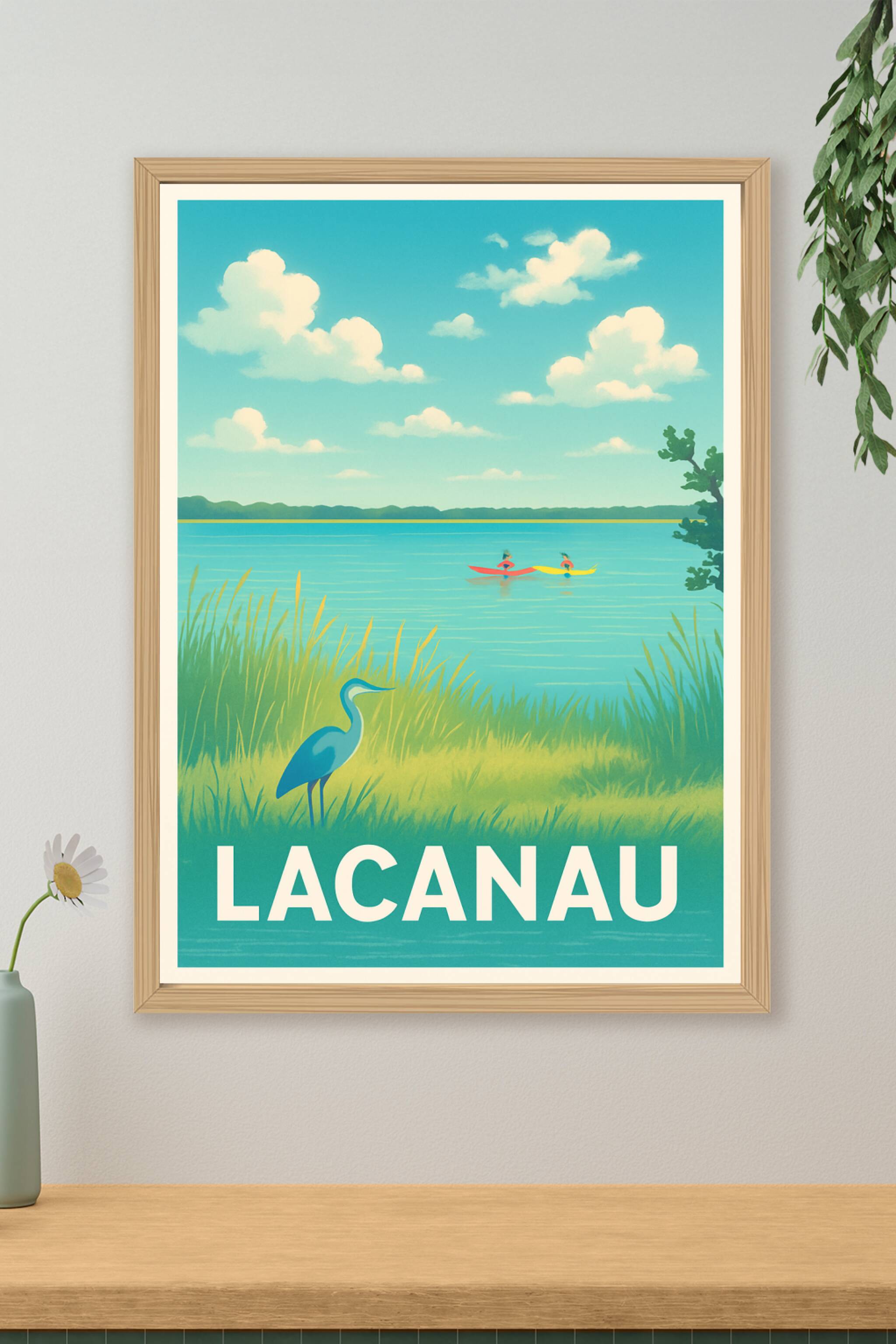 Découvrez la sérénité du bassin de Lacanau avec cette affiche au style rétro-chic, évoquant un paysage naturel apaisant où la faune locale et les k...