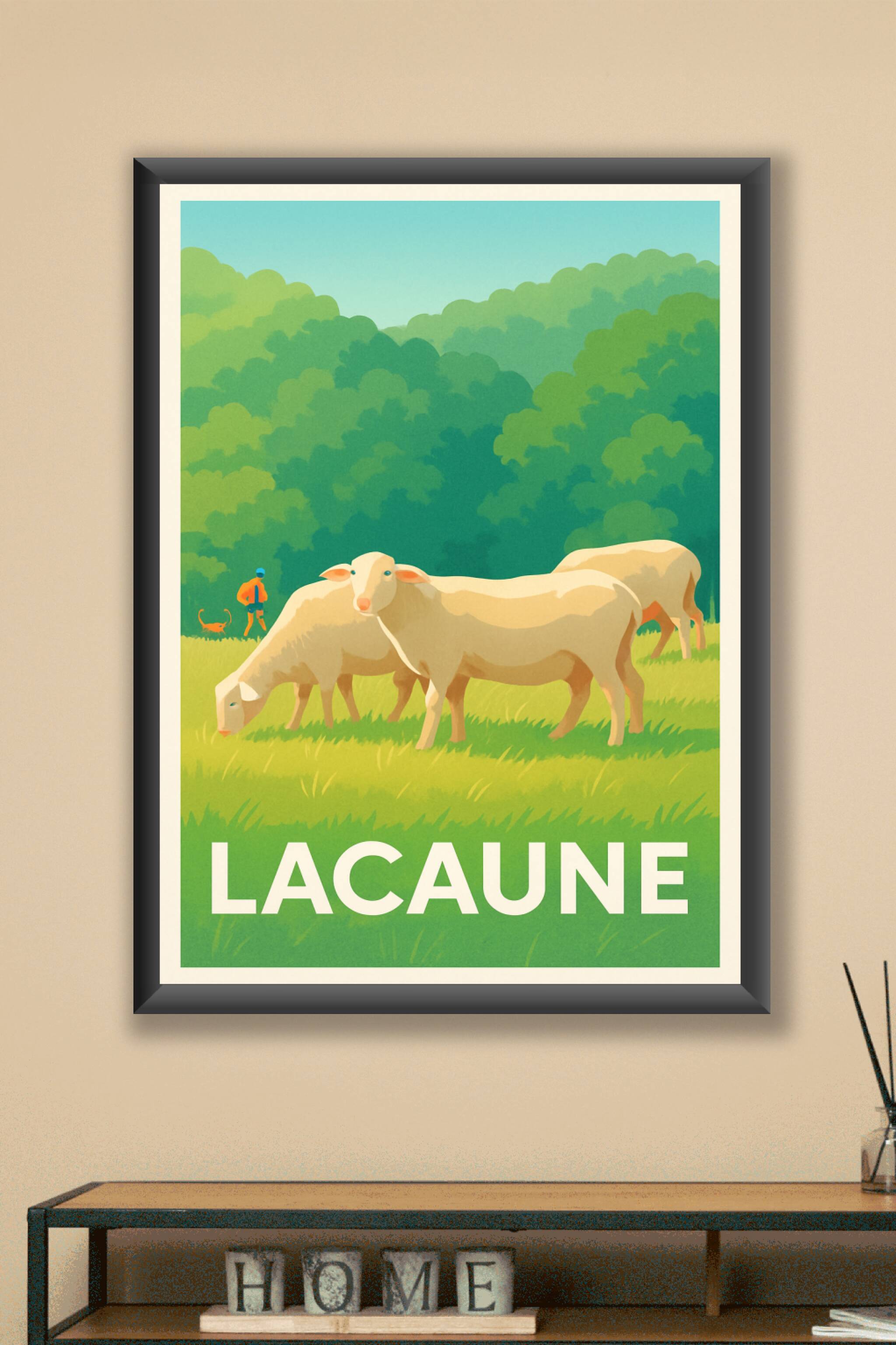 Découvrez toute la sérénité de la campagne tarnaise avec cette affiche représentant un paisible troupeau de moutons dans les verts pâturages de Lac...