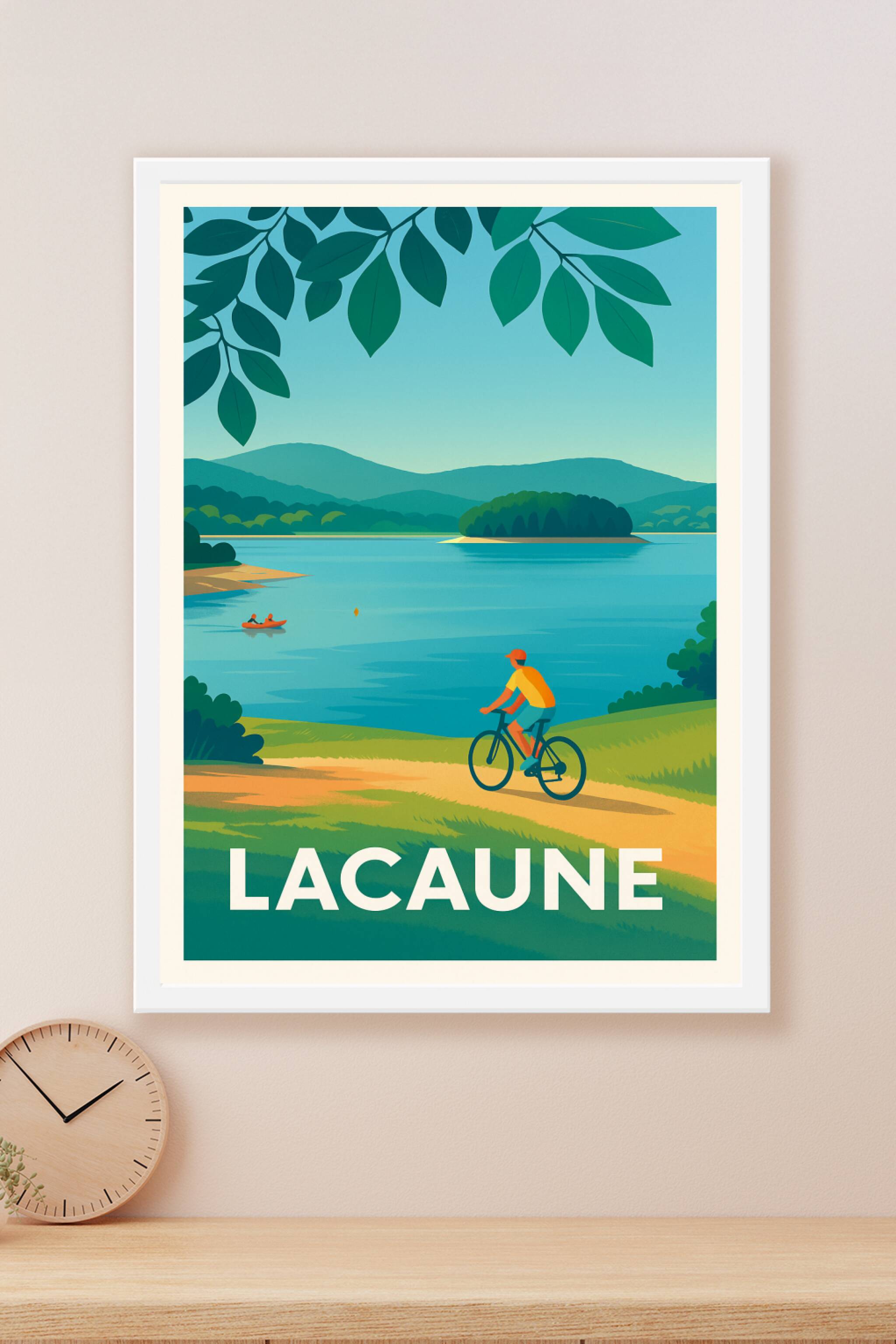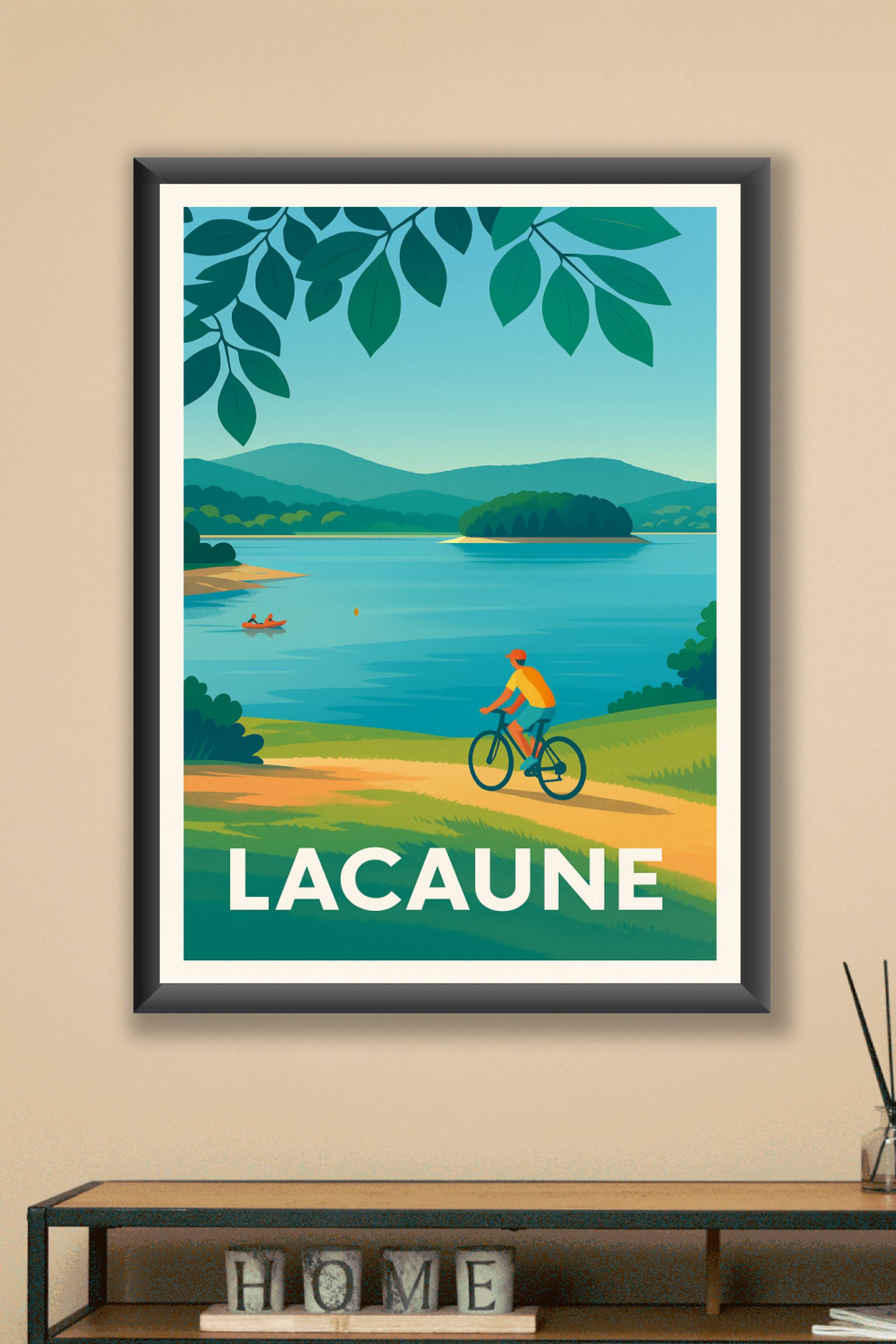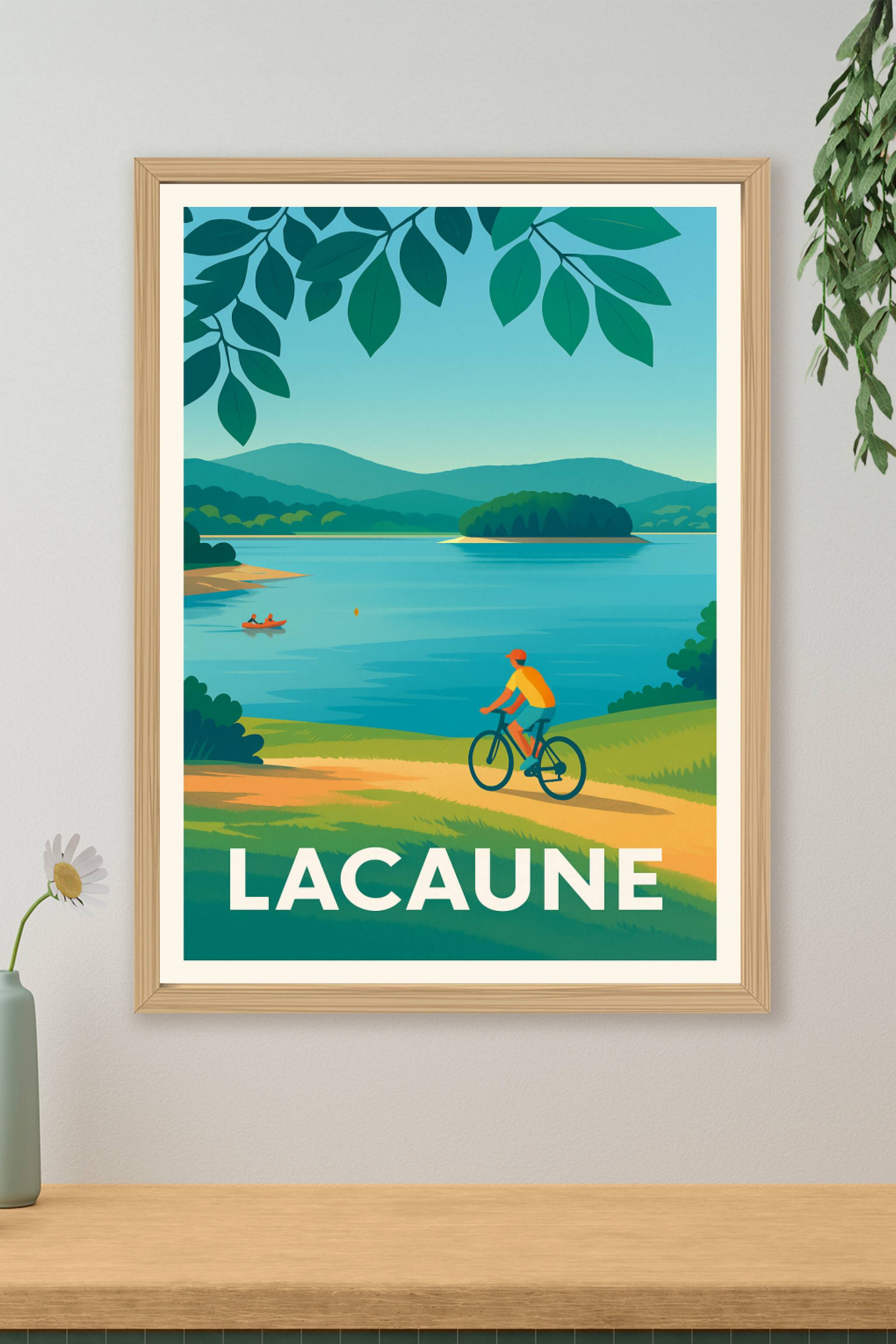 Découvrez la quiétude et la beauté naturelle de Lacaune avec cette affiche inspirante illustrant un paysage paisible au bord d'un lac, où un cyclis...
