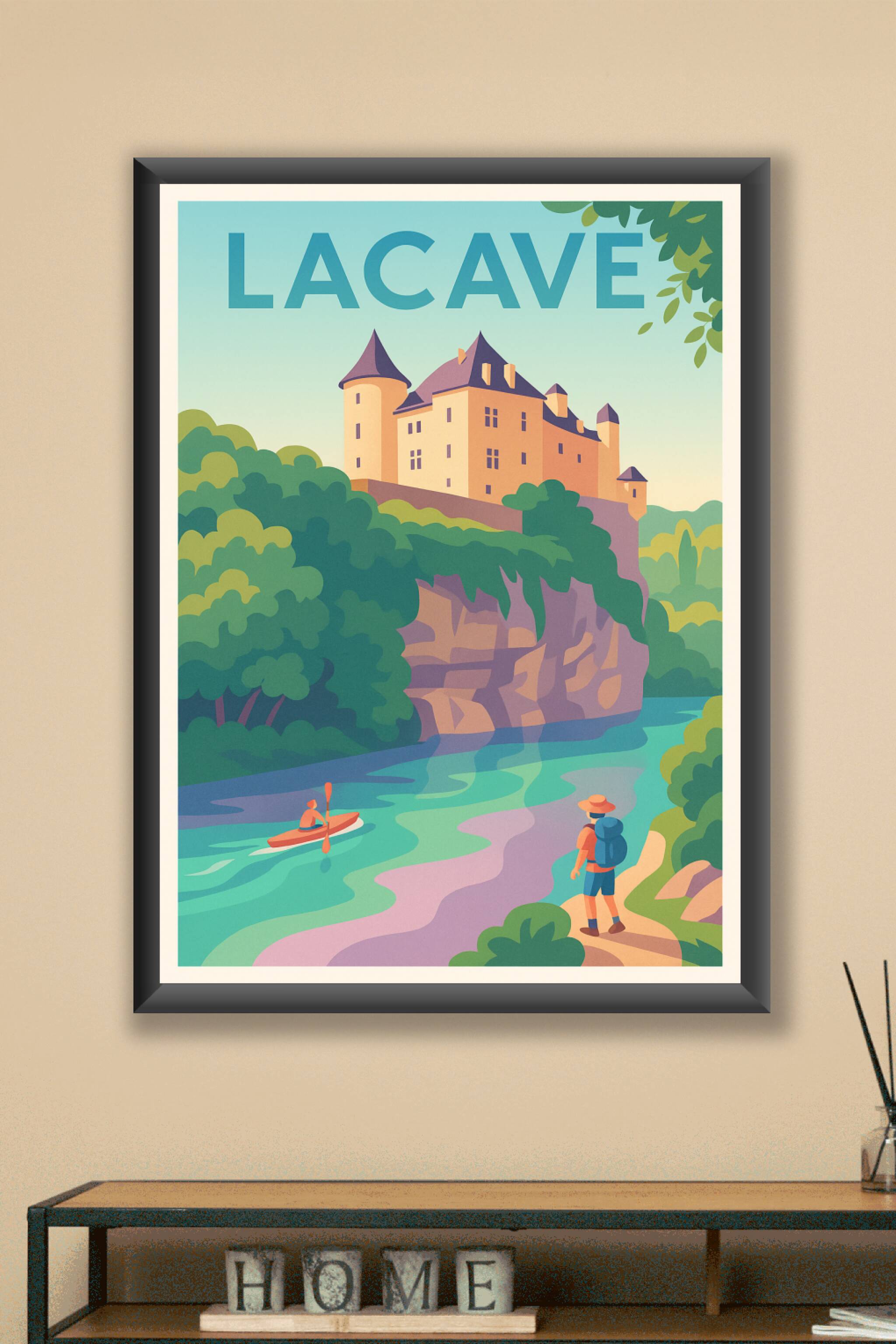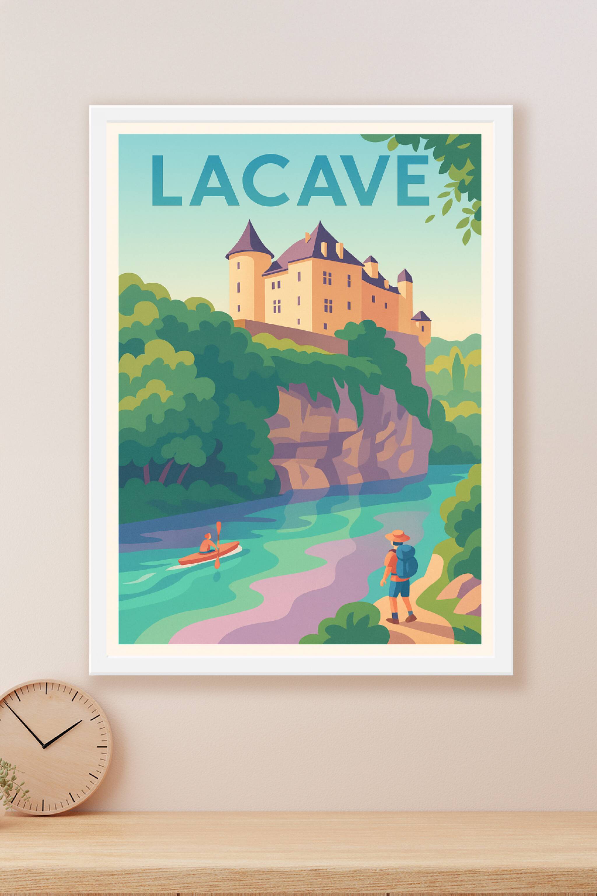 Découvrez la beauté sereine de Lacave avec cette affiche illustrée mettant en scène le château perché sur sa falaise et une rivière paisible où un ...