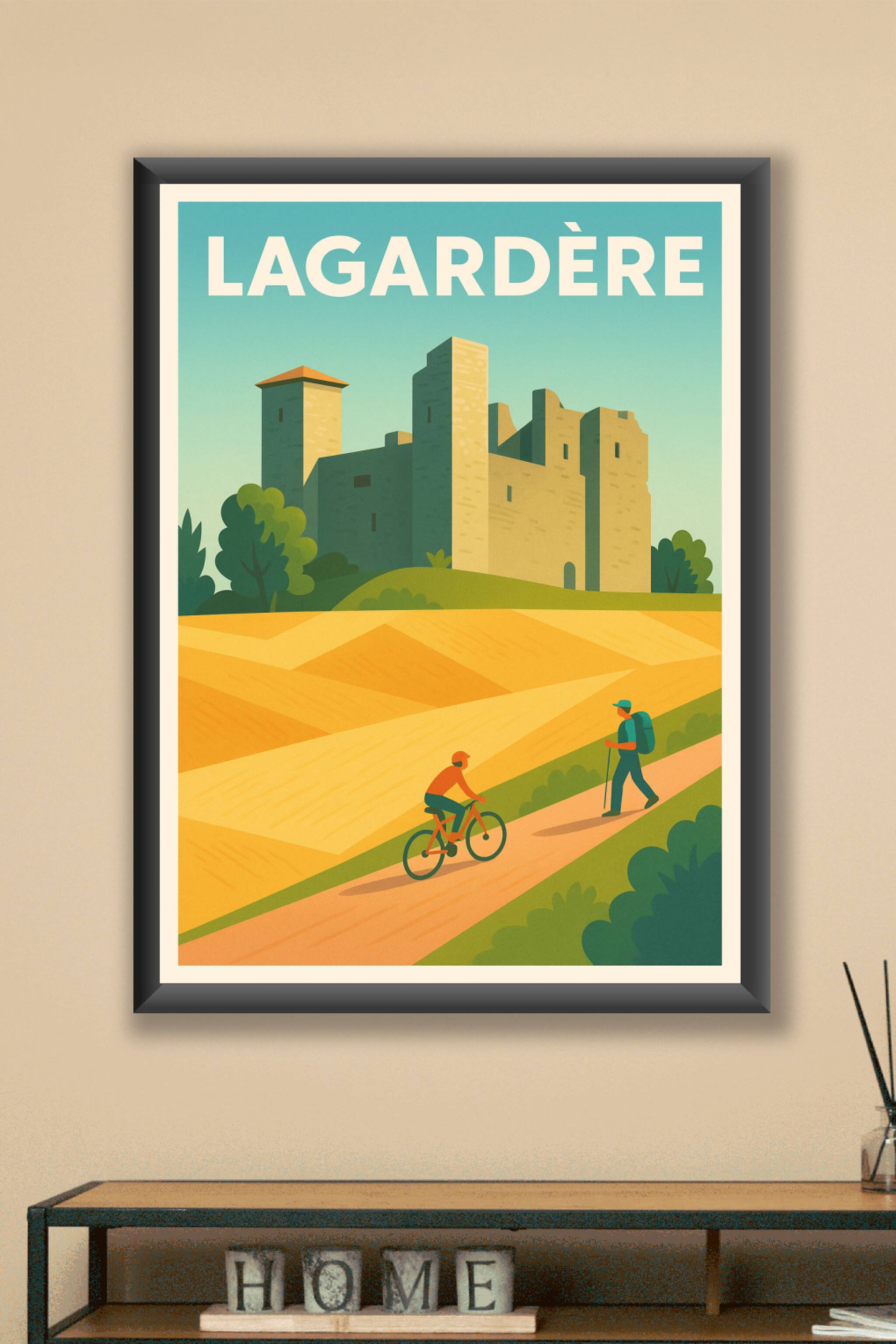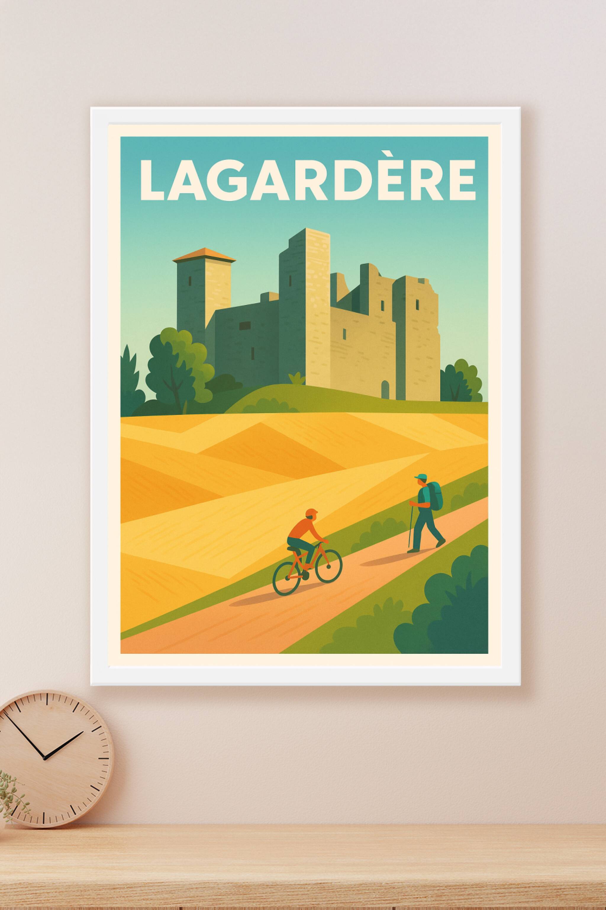 Découvrez l'élégance rustique de Lagardère avec cette affiche au design épuré et coloré qui met en lumière son château majestueux et les paysages v...