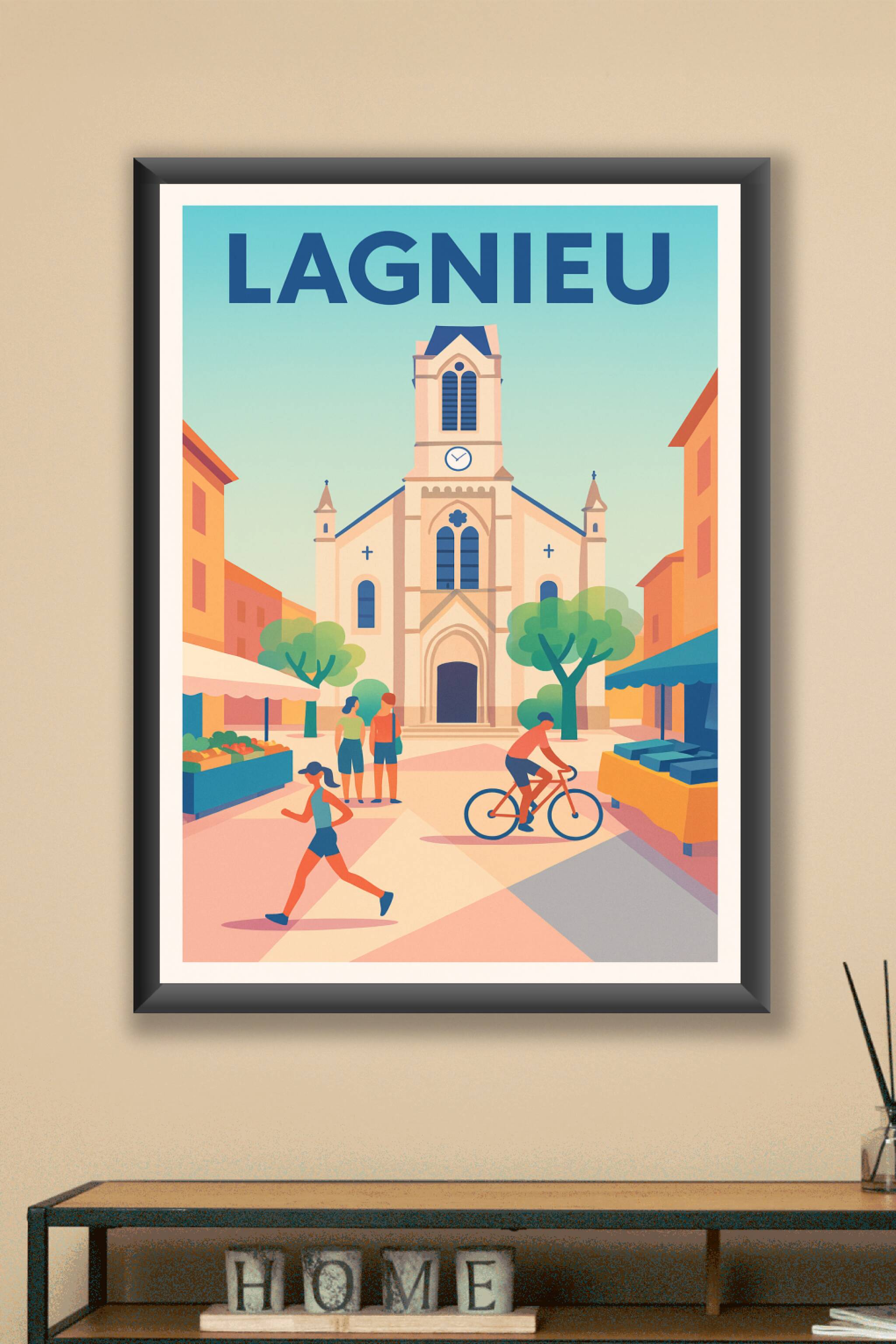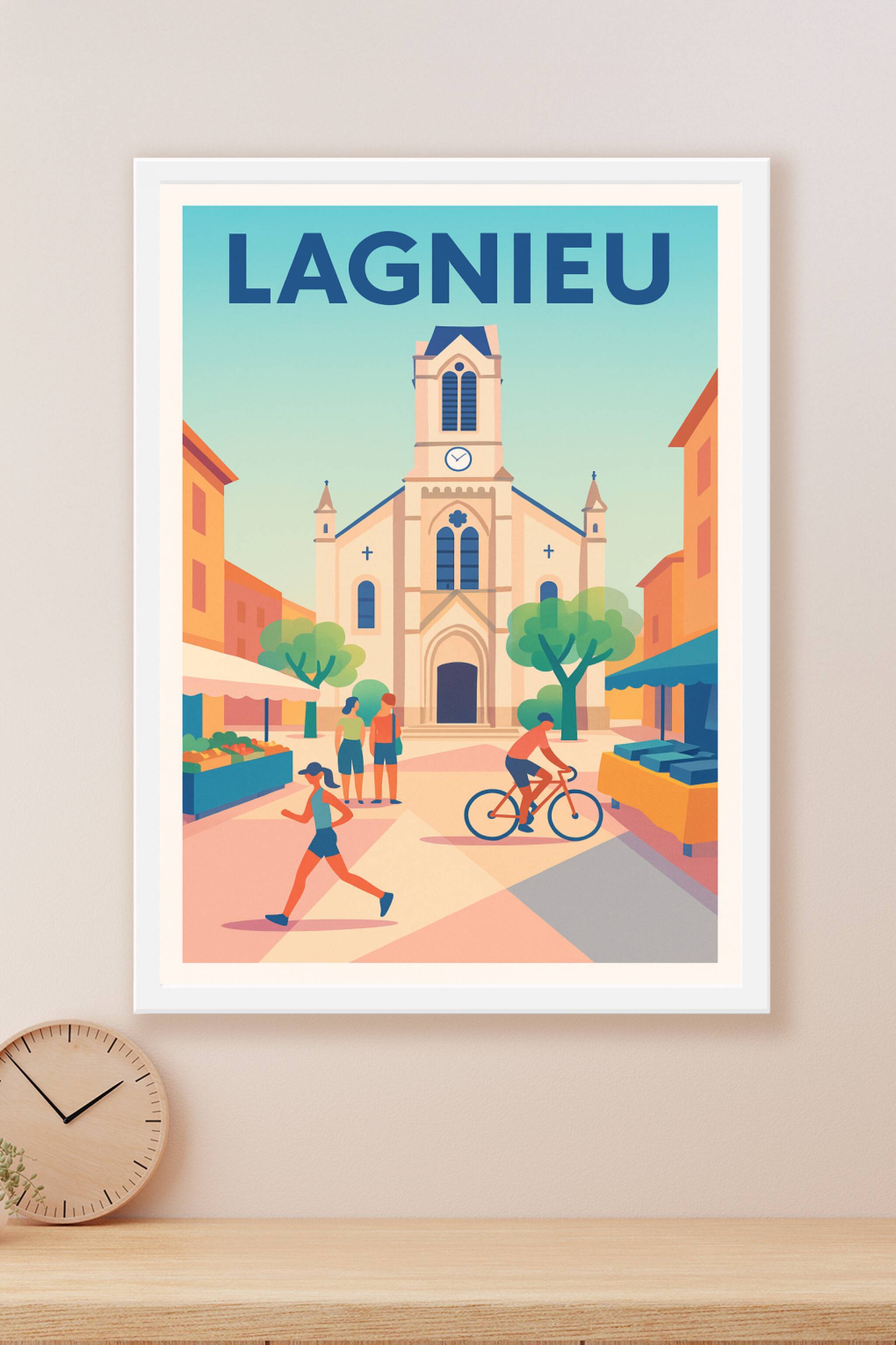 Découvrez l'affiche qui capture l'esprit chaleureux et dynamique de Lagnieu, illustrant sa place centrale animée avec son église emblématique. Ce p...