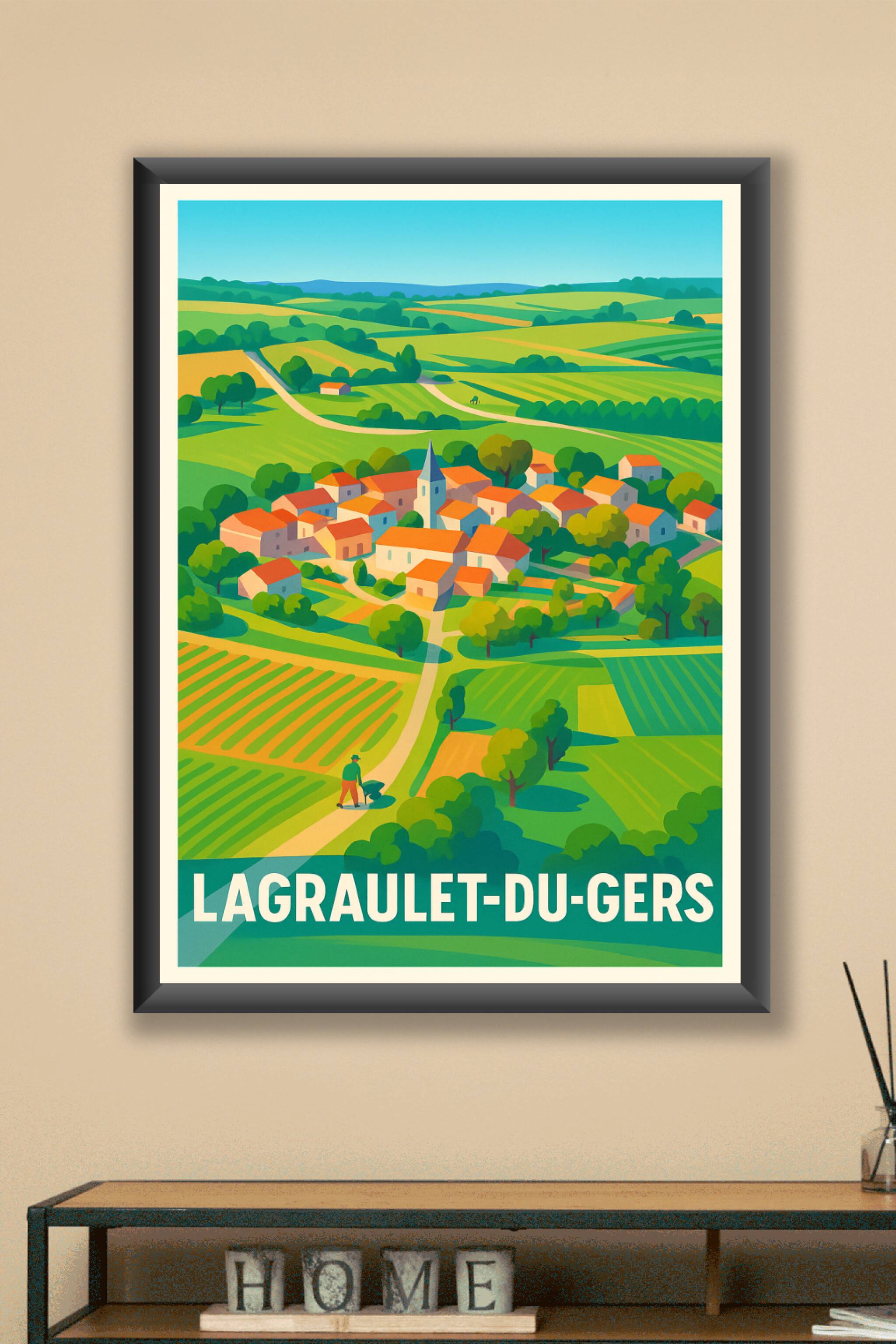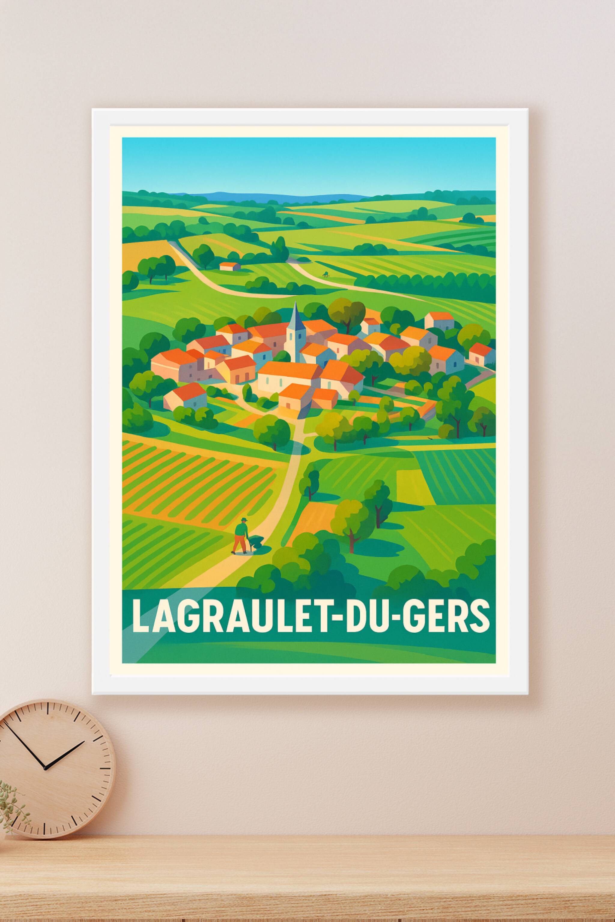 Découvrez la douceur de vivre de Lagraulet-du-Gers avec cette affiche qui illustre un village typique niché dans un paysage verdoyant et vallonné. ...