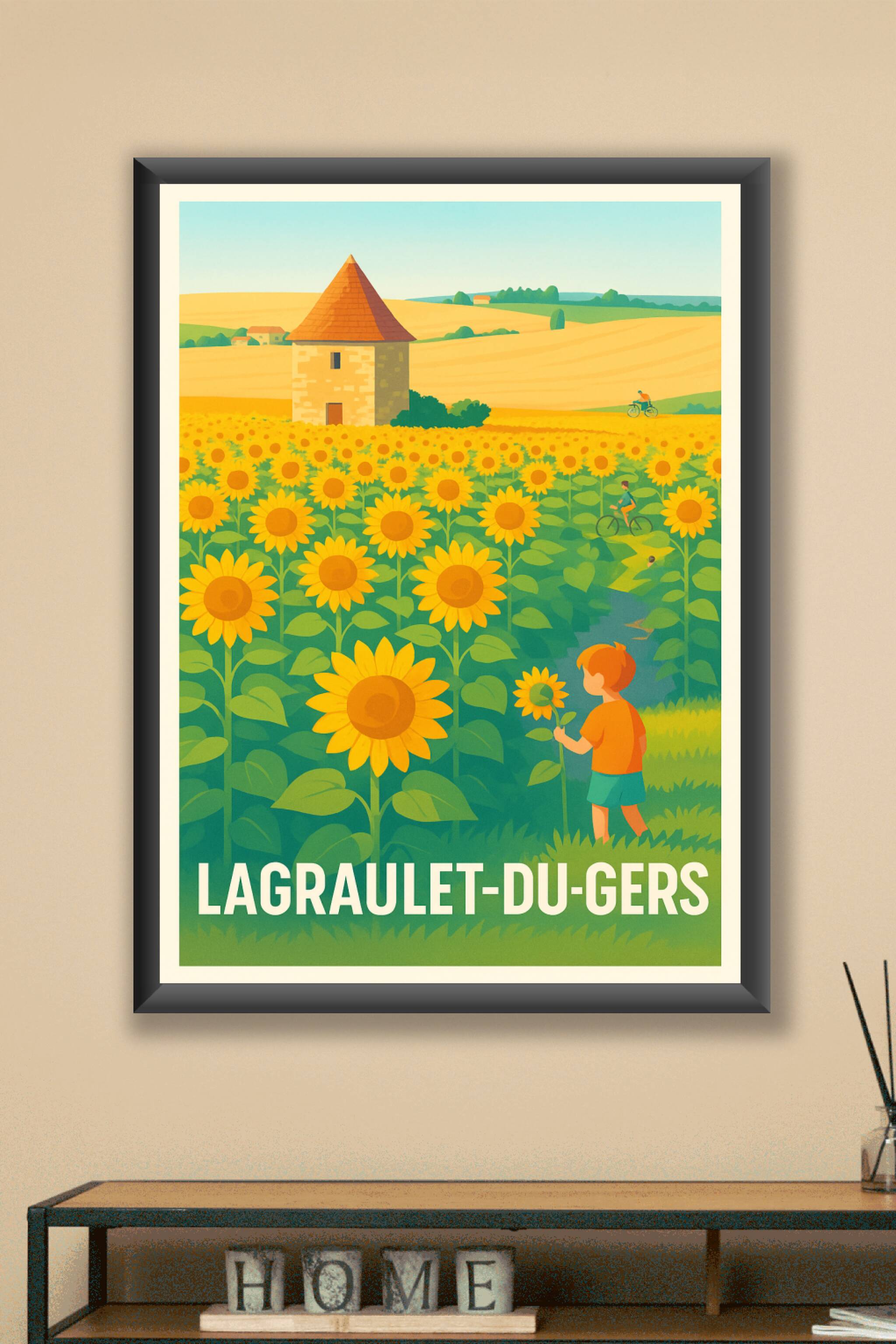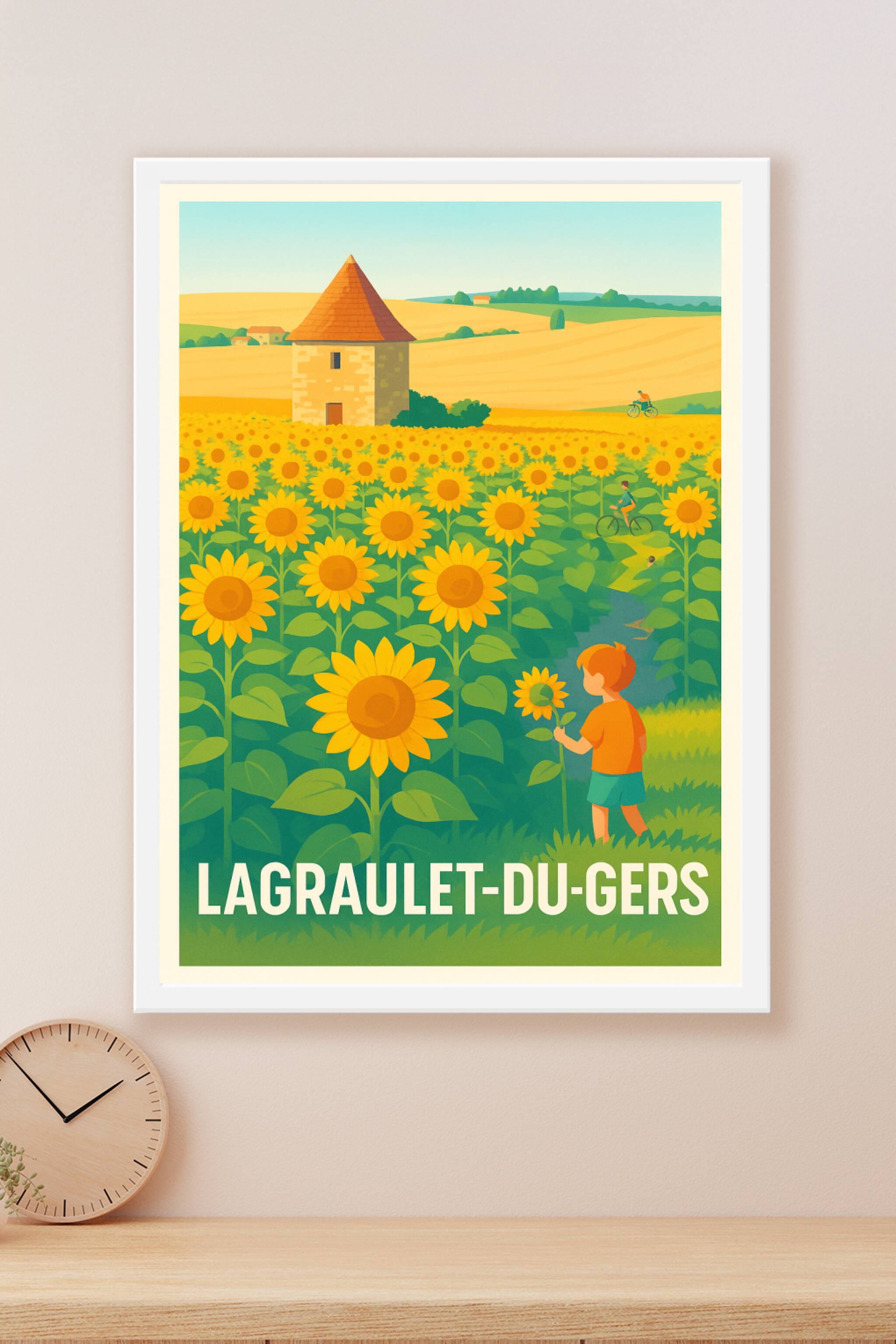 Évadez-vous dans la douceur bucolique de Lagraulet-du-Gers avec cette affiche illustrée mettant en scène un champ de tournesols baignés par un sole...