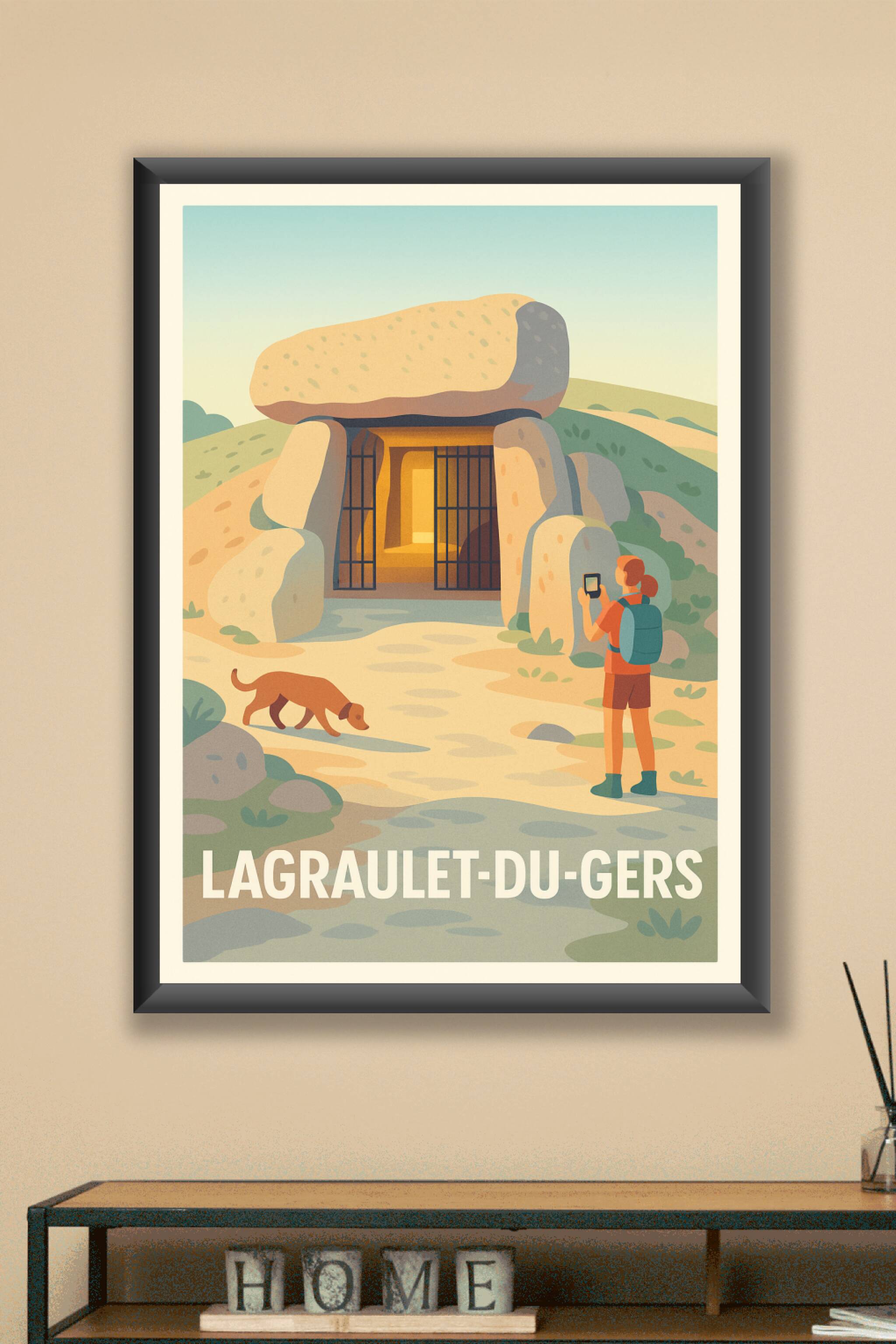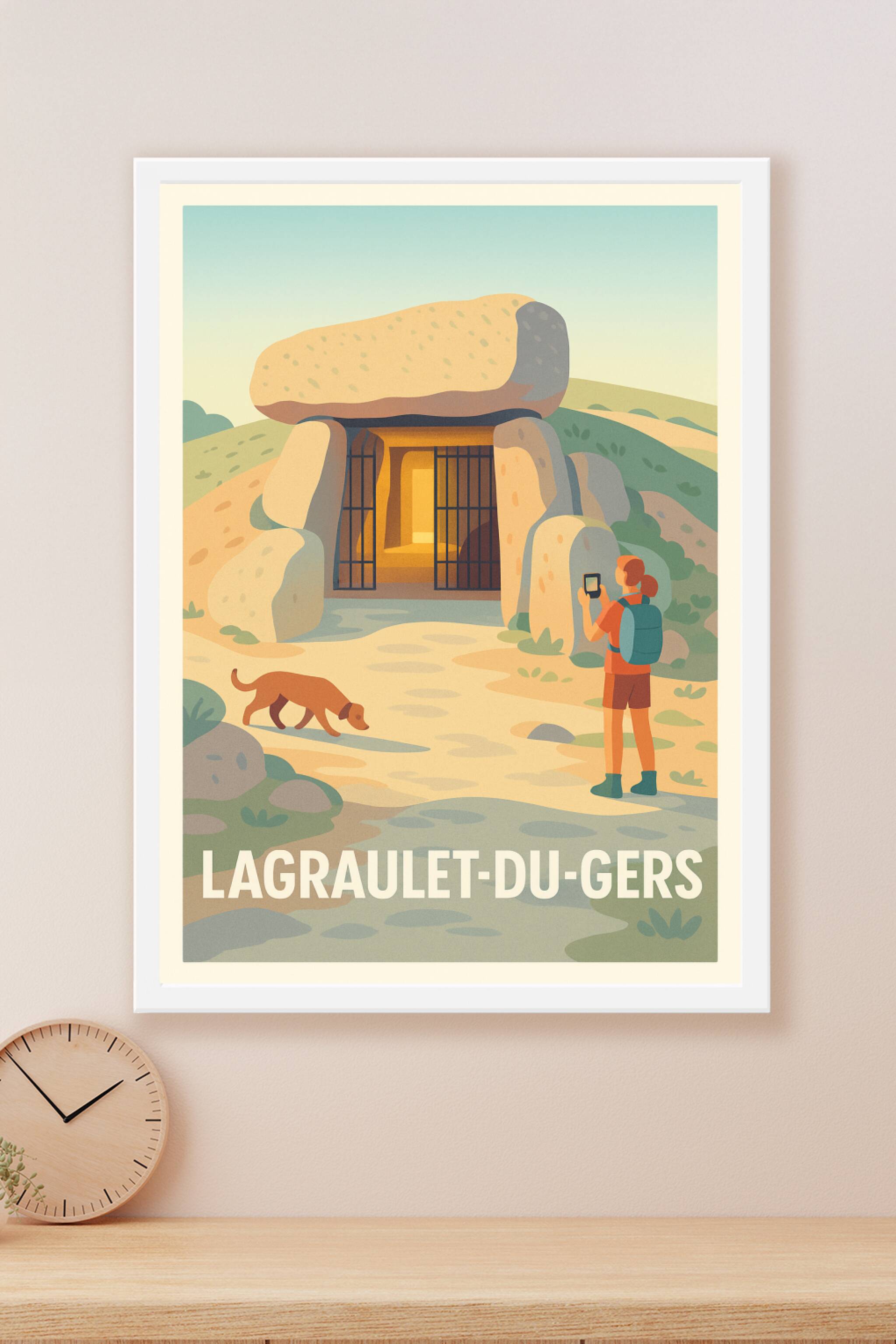 Découvrez l'affiche immersive de Lagraulet-du-Gers, mettant en scène un dolmen emblématique niché dans la douceur du paysage gascon. Cette illustra...
