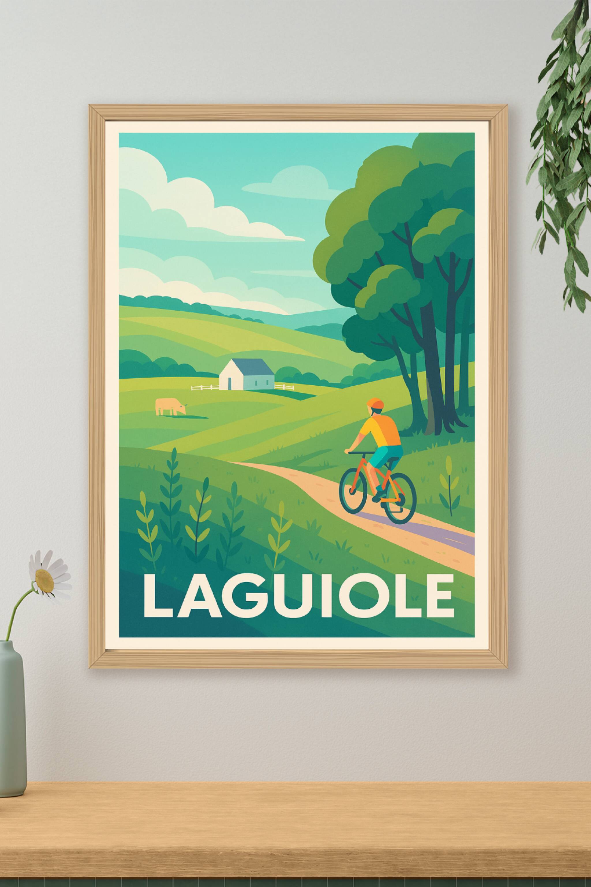 Découvrez la douceur et la tranquillité des paysages verdoyants de Laguiole grâce à cette affiche illustrée au style vintage et épuré. Ce poster met en scène une balade à vélo à travers les collines et prairies typiques de la région, avec une ferme et une vache en arrière-plan qui renforcent le charme rural du lieu.Ce poster est imprimé en tirage "Fine Art" sur papier 305g coton de qualité musée, garantissant des couleurs vibrantes et une durabilité exceptionnelle. Disponible en formats A1, A2, A3 et A4, avec ou sans cadre, cette affiche s'adapte parfaitement à tous les styles de décoration intérieure.Fabriquée en France avec un procédé d'impression premium, cette affiche est idéale pour apporter une touche de nature et de sérénité à votre intérieur ou offrir un souvenir authentique et artistique de Laguiole.