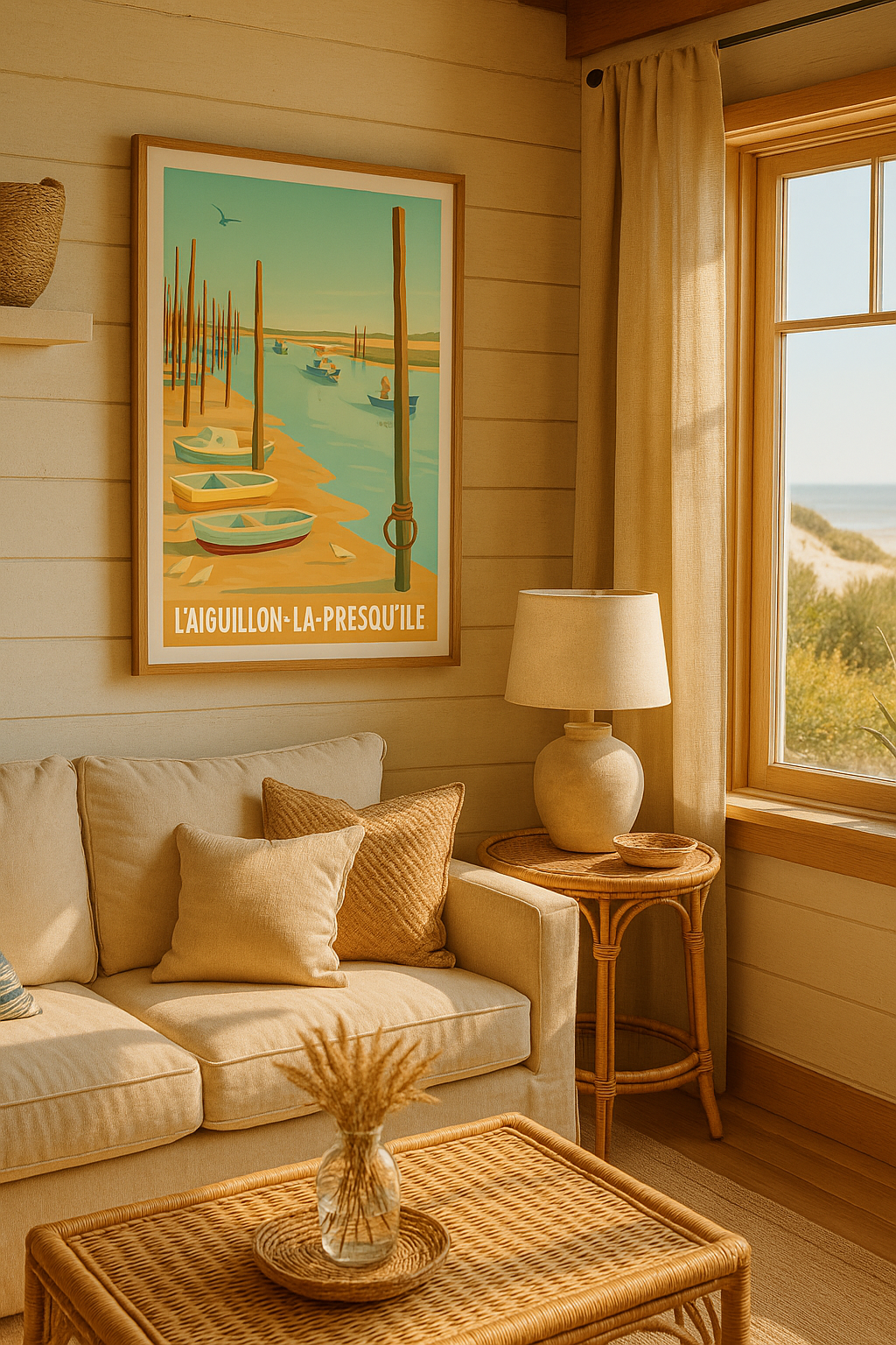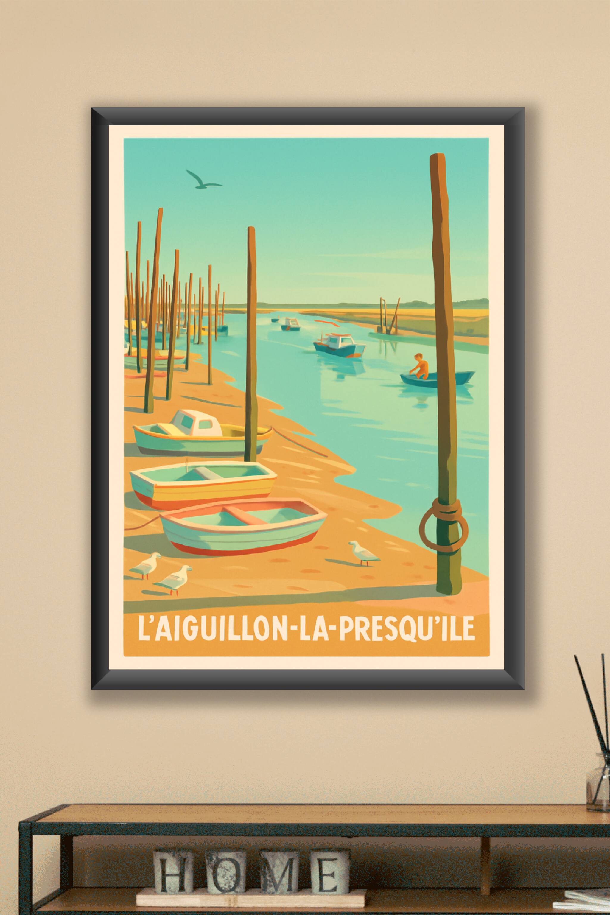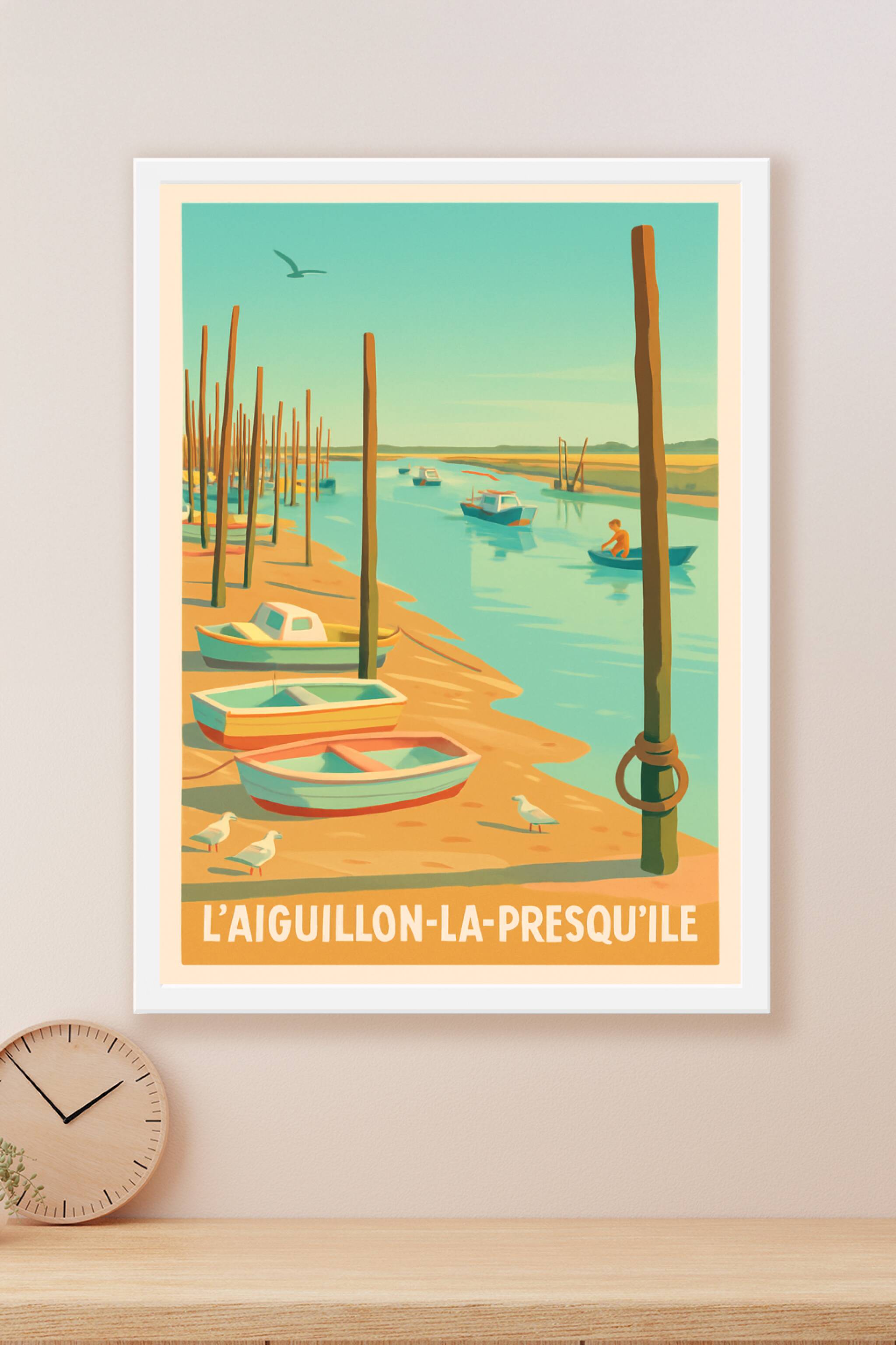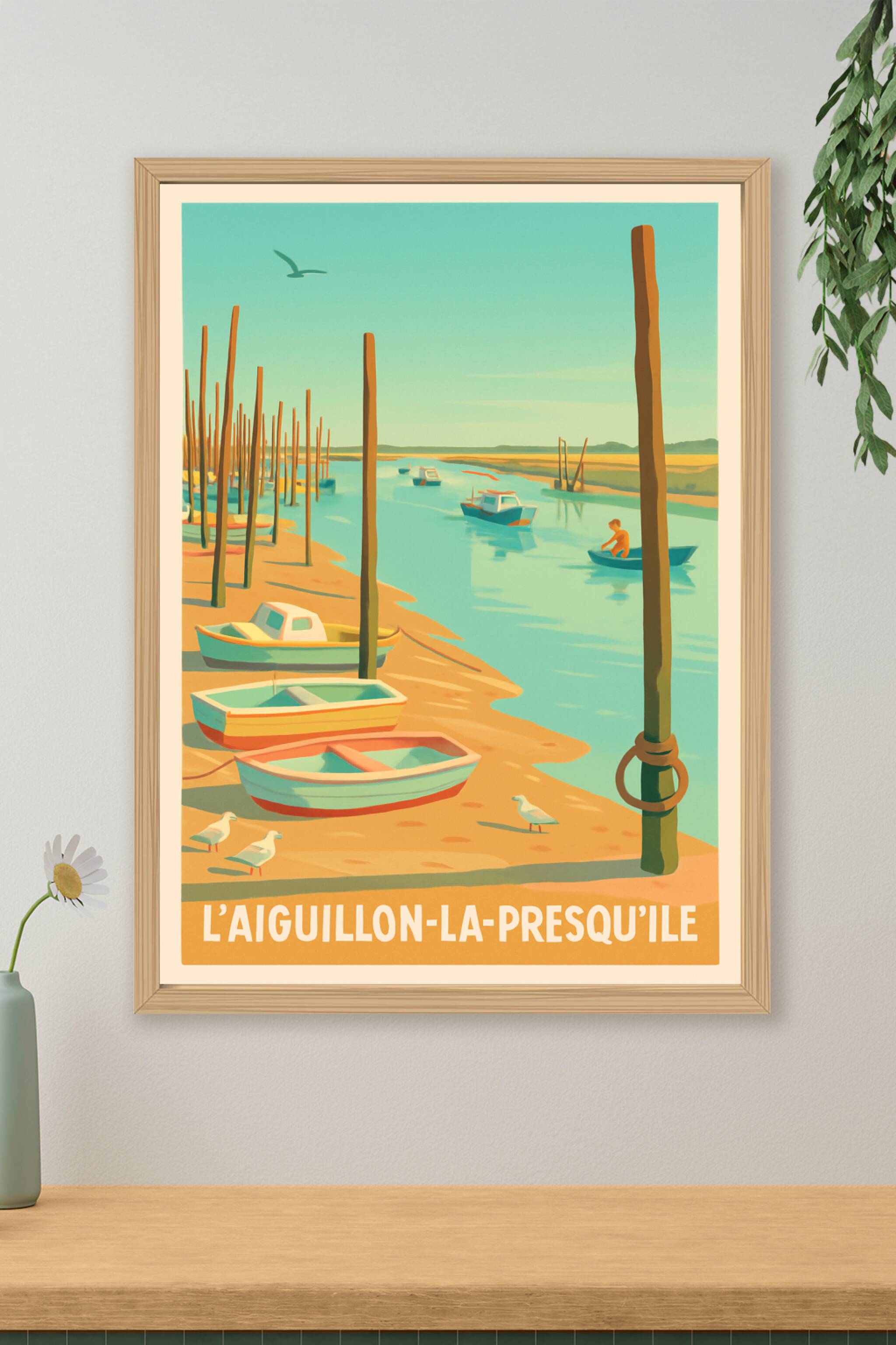 Découvrez la sérénité et le charme authentique de L'Aiguillon-la-Presqu'île avec cette magnifique affiche illustrée aux couleurs douces et lumineus...