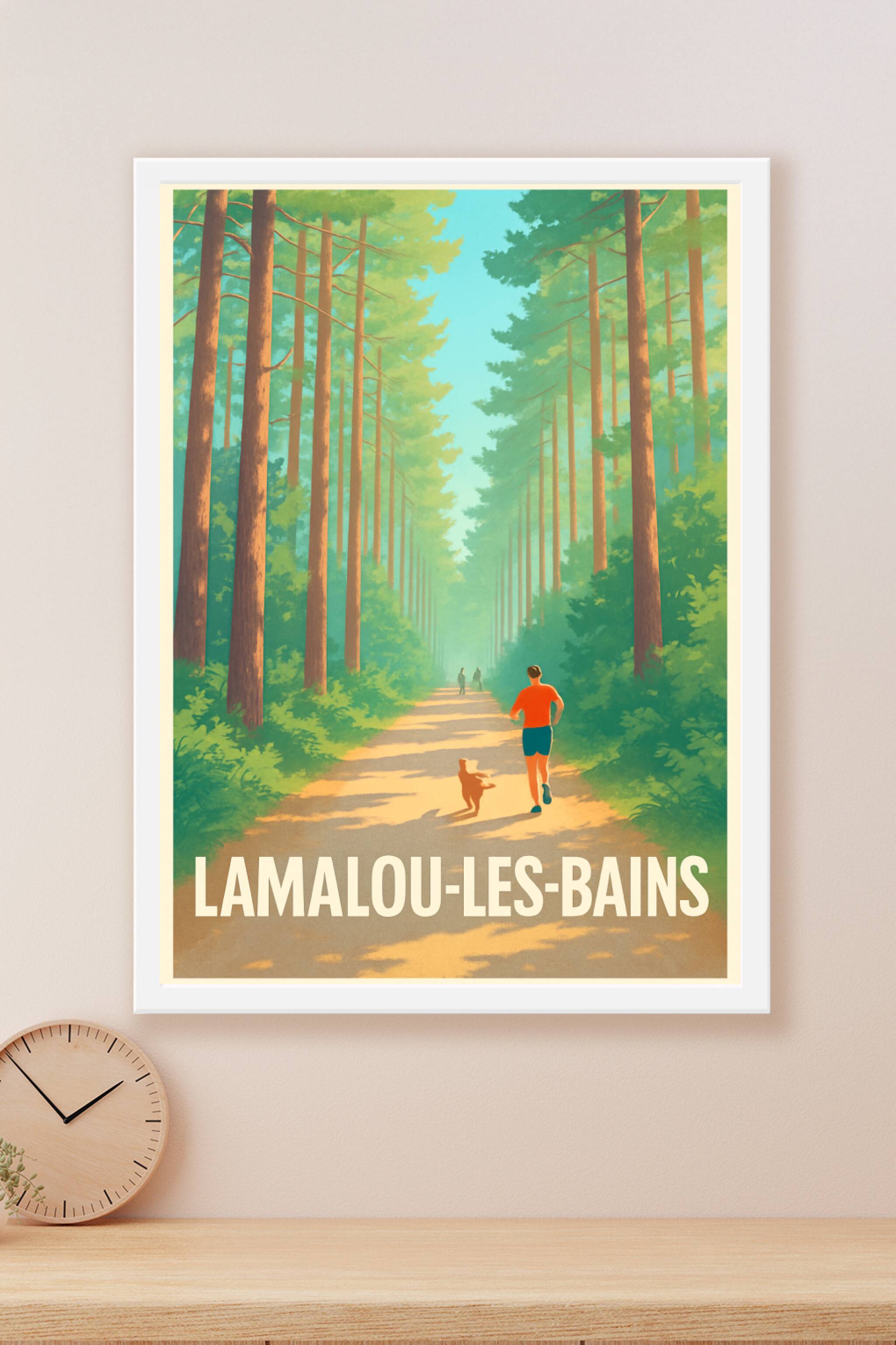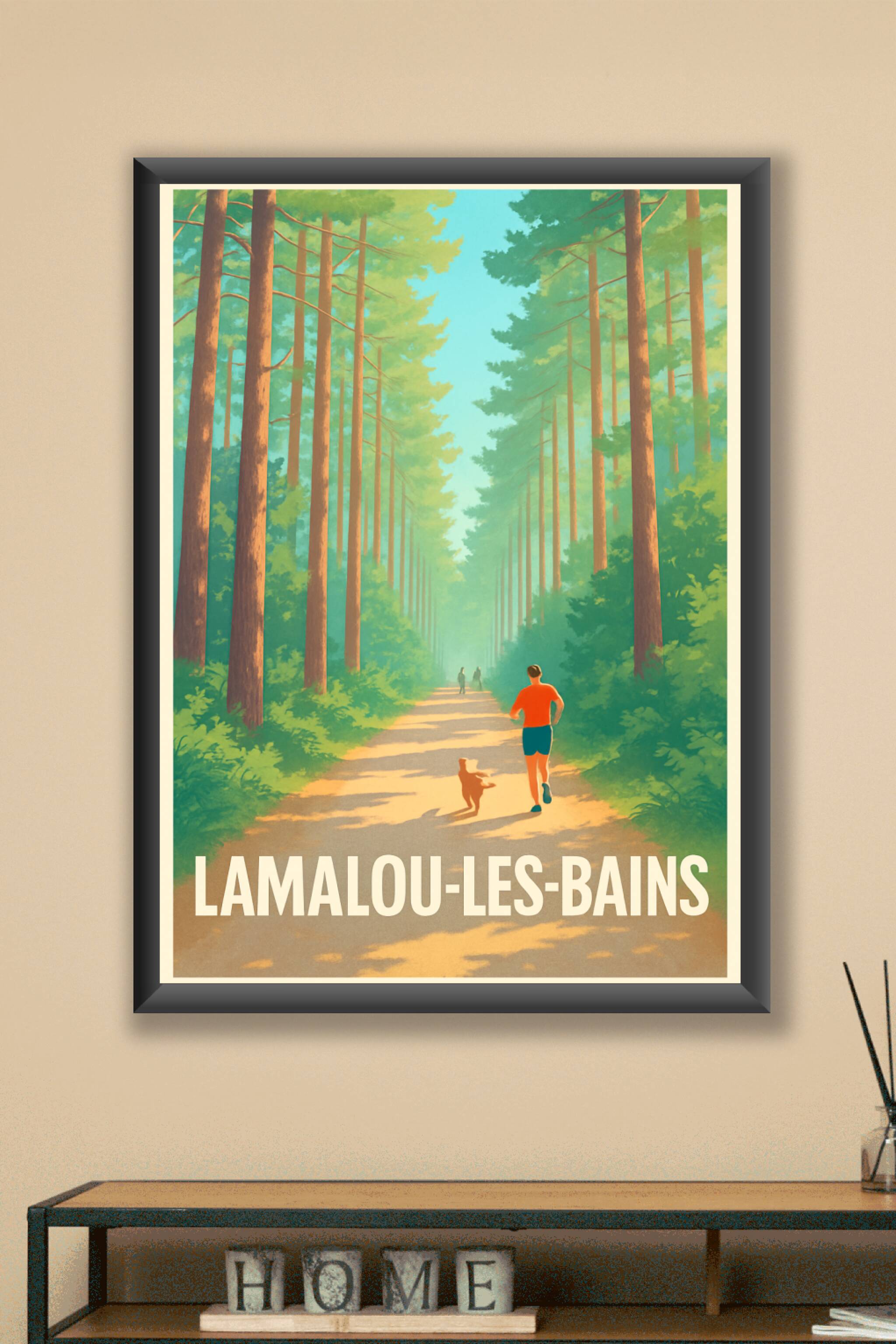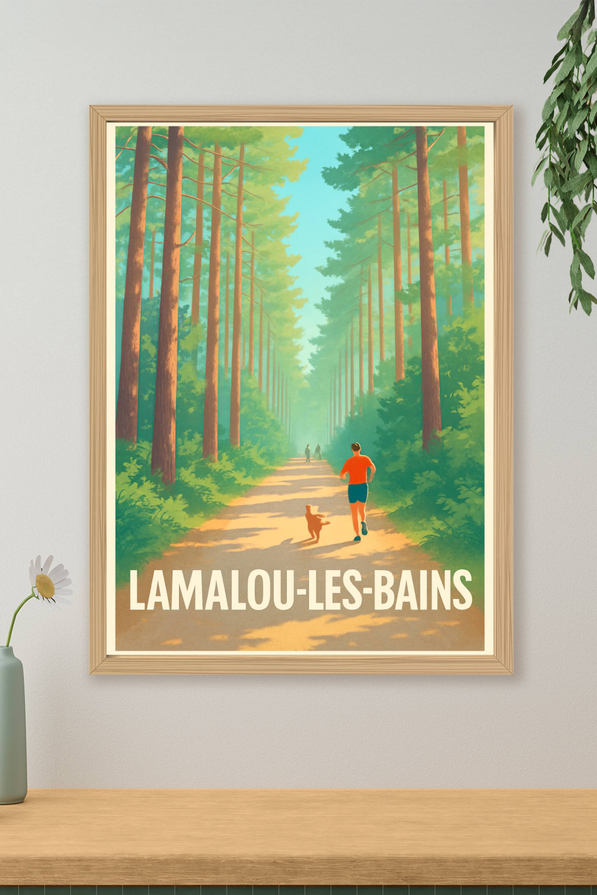 Découvrez la sérénité de Lamalou-les-Bains avec cette affiche illustrant une balade matinale dans une forêt ensoleillée, où la nature et le bien-êt...