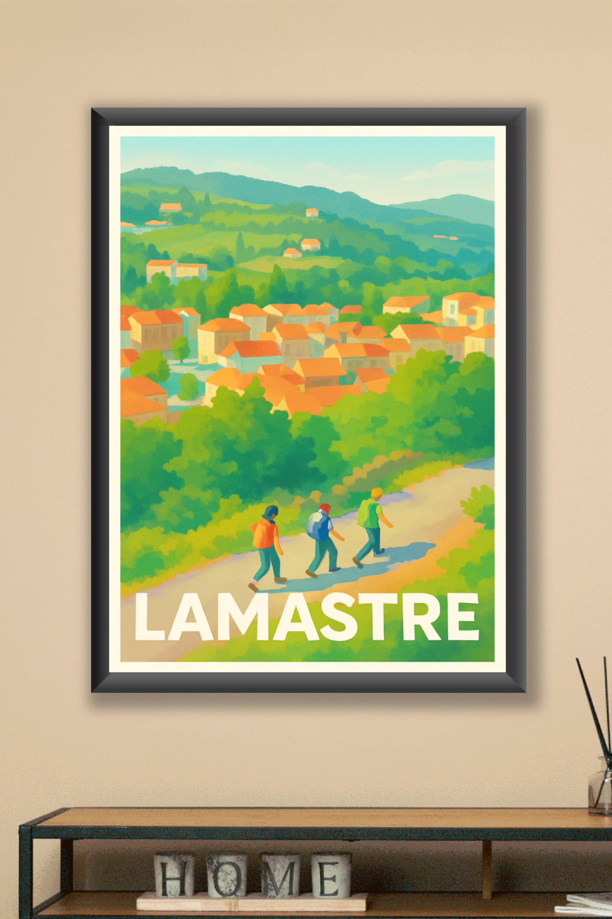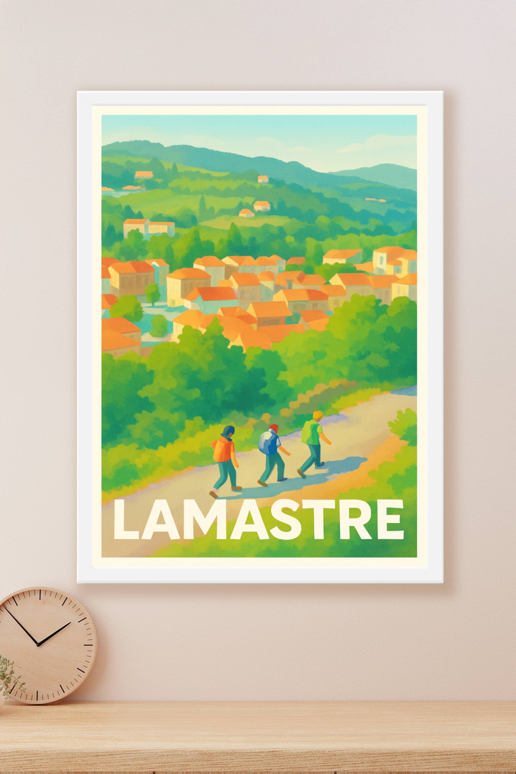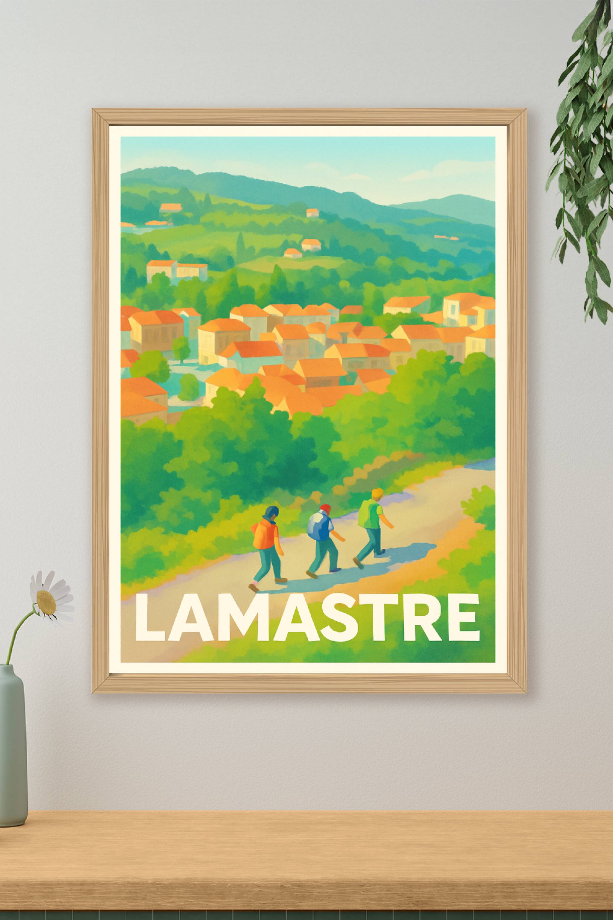 Découvrez la charmante commune de Lamastre à travers cette affiche illustrée d'une balade en pleine nature, surplombant le village aux toits rouges...