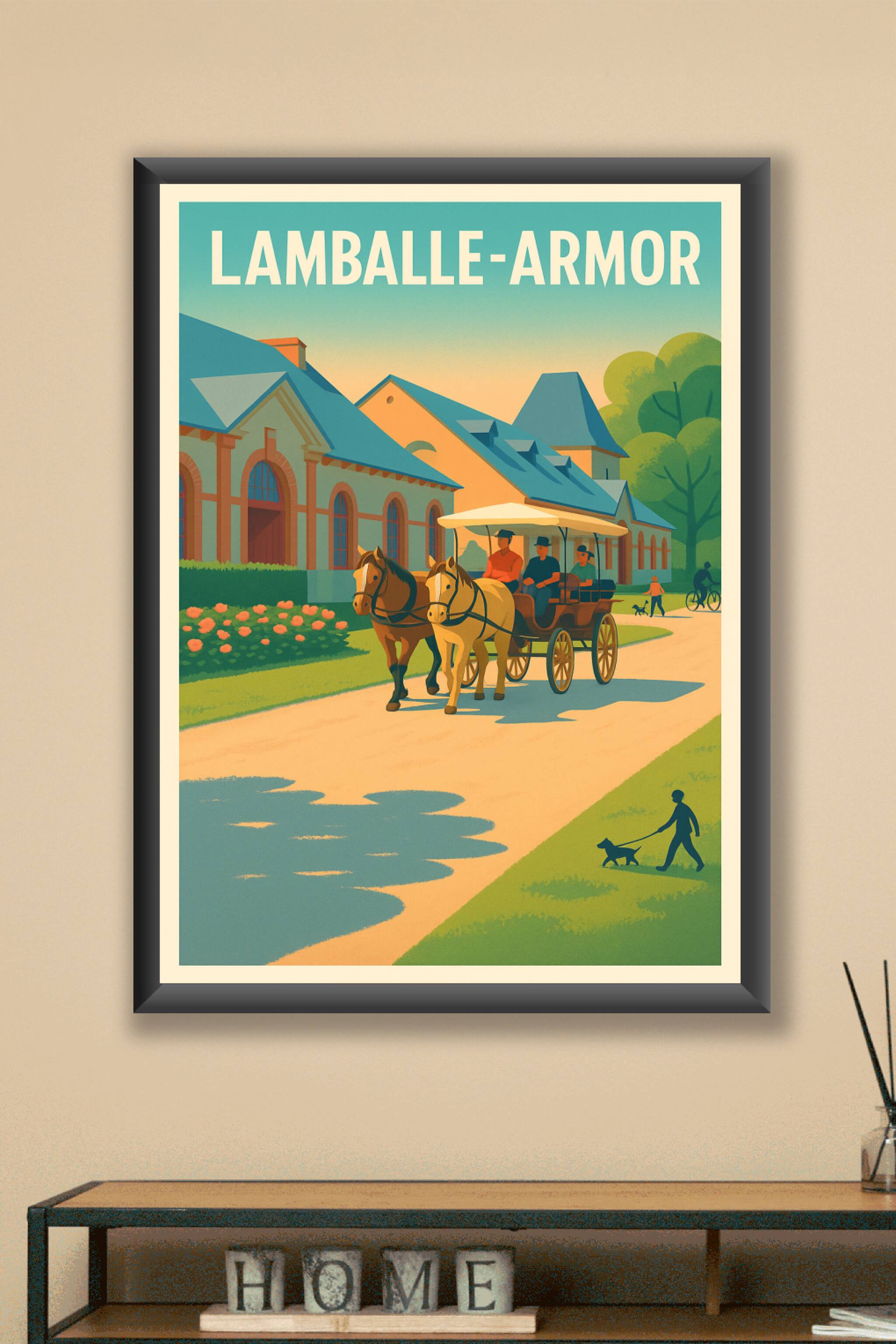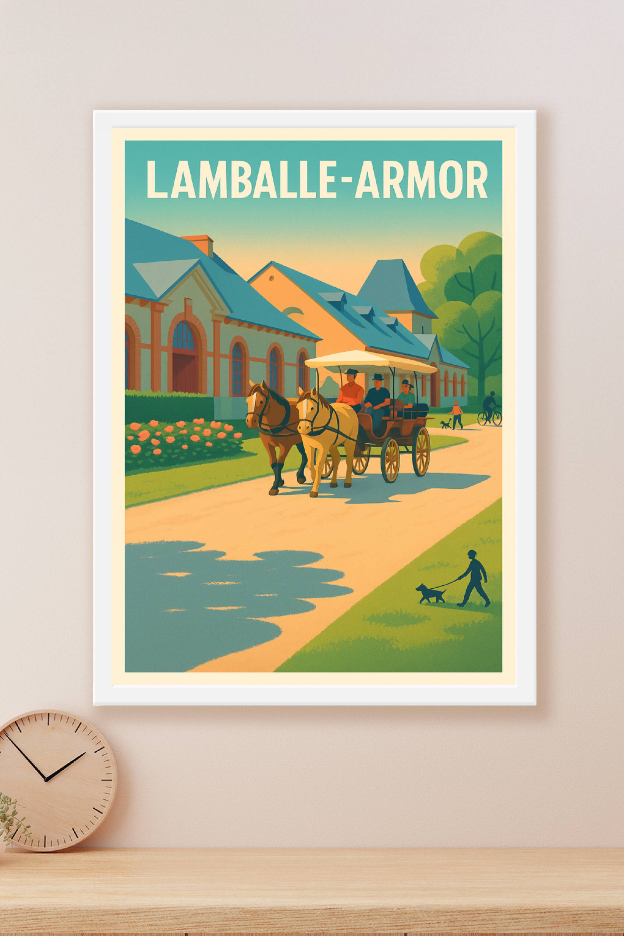 Découvrez l'élégance intemporelle de Lamballe-Armor à travers cette affiche au style vintage qui met en scène une calèche tirée par des chevaux, dé...