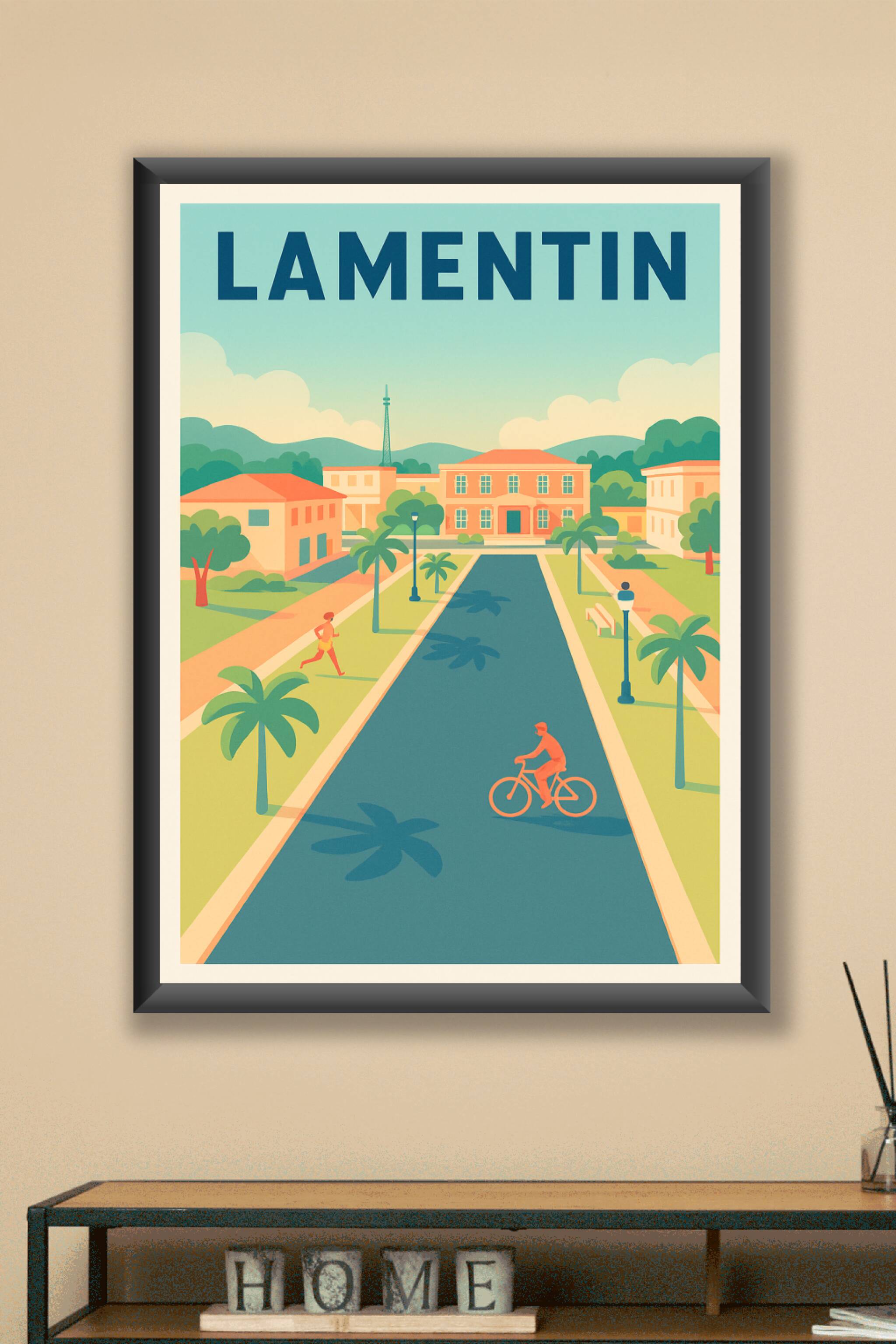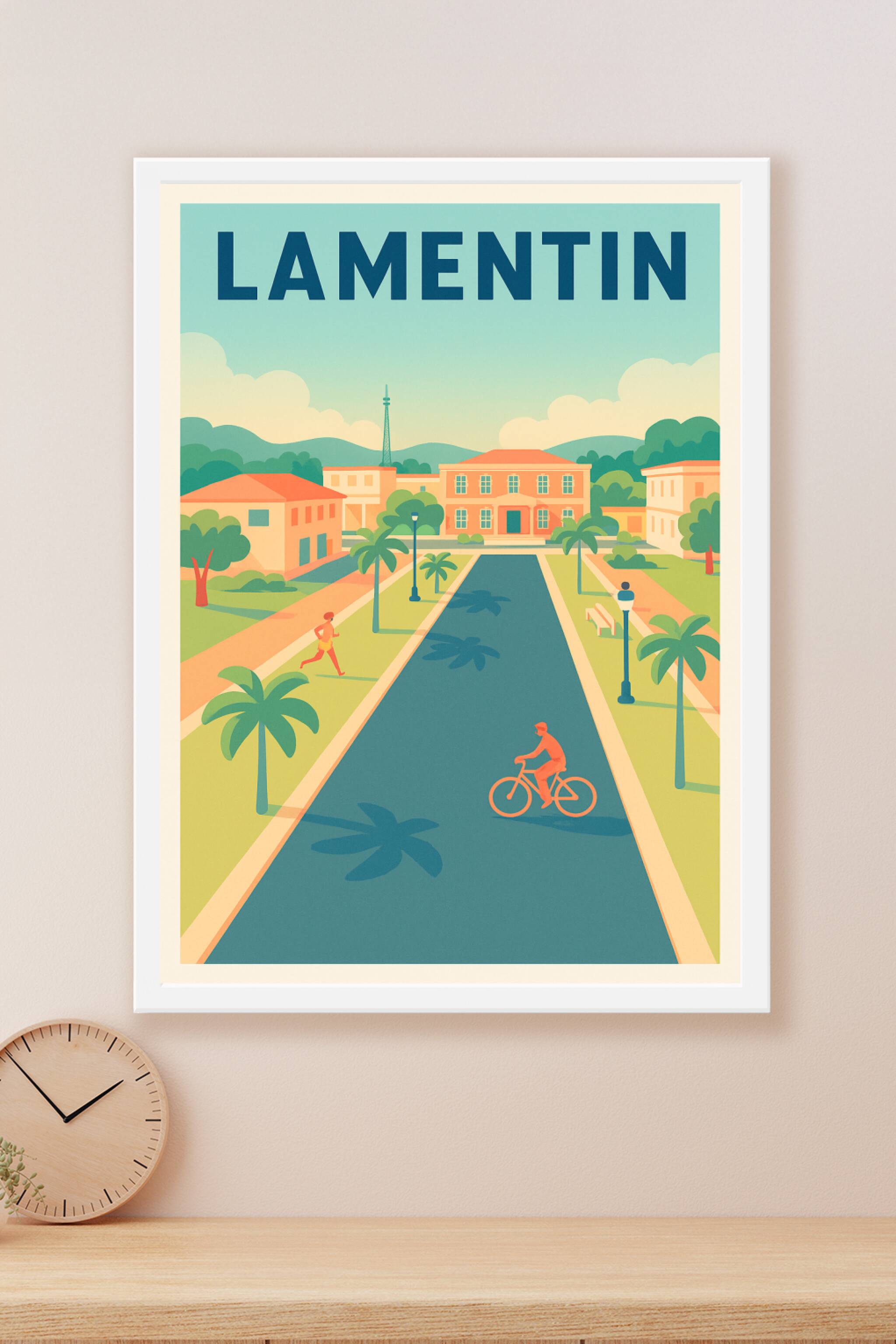 Découvrez l'atmosphère paisible et ensoleillée de Lamentin avec cette affiche au style vintage épuré. Cette illustration met en scène une promenade...