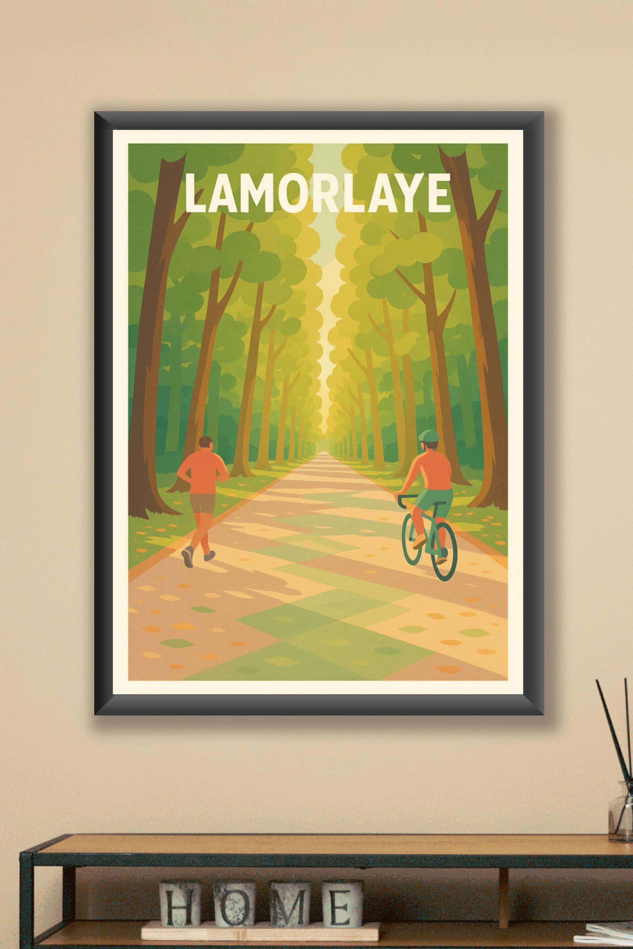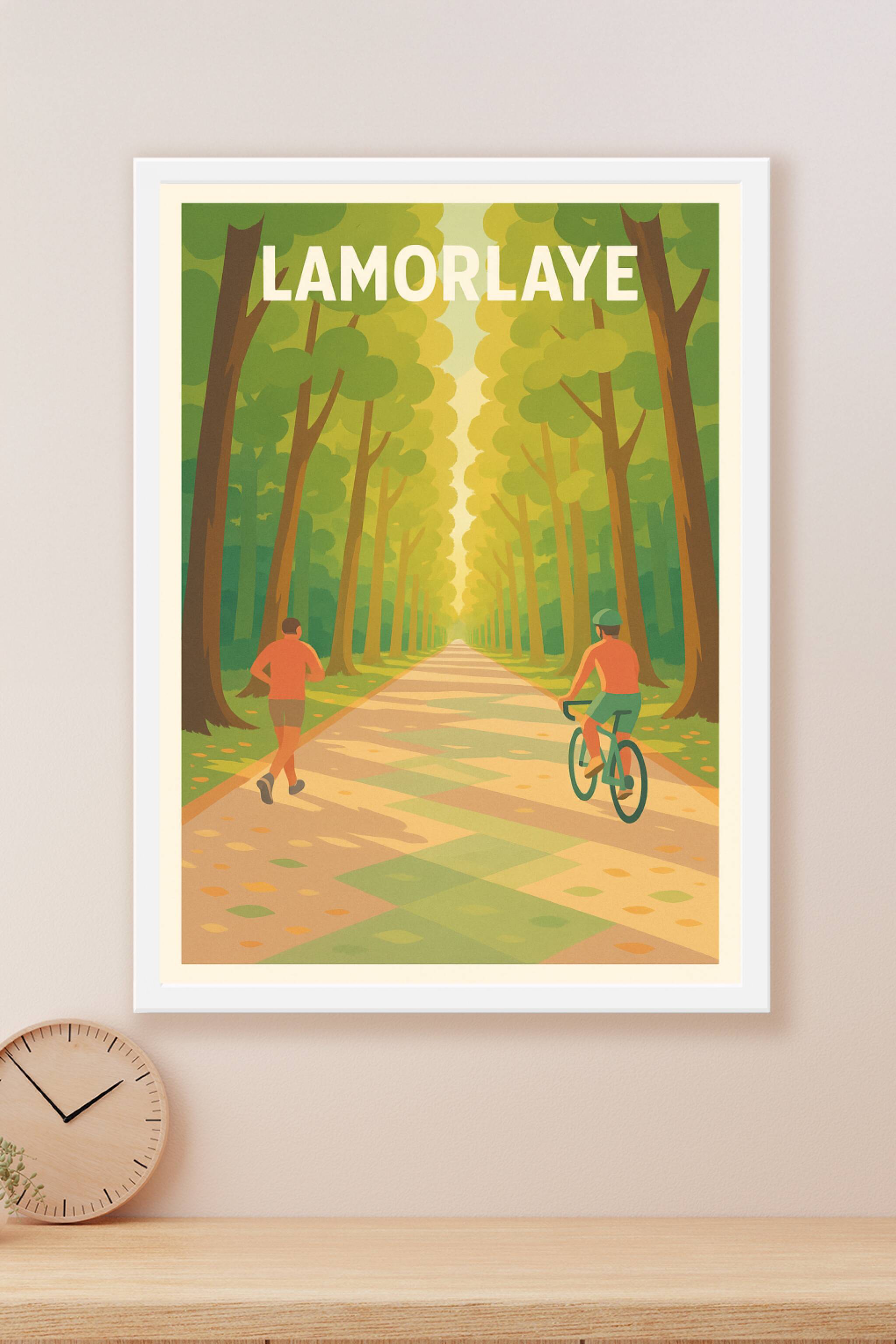 Découvrez la sérénité de Lamorlaye avec cette affiche illustrée mettant en scène une allée arborée où coureur et cycliste partagent un moment de dé...