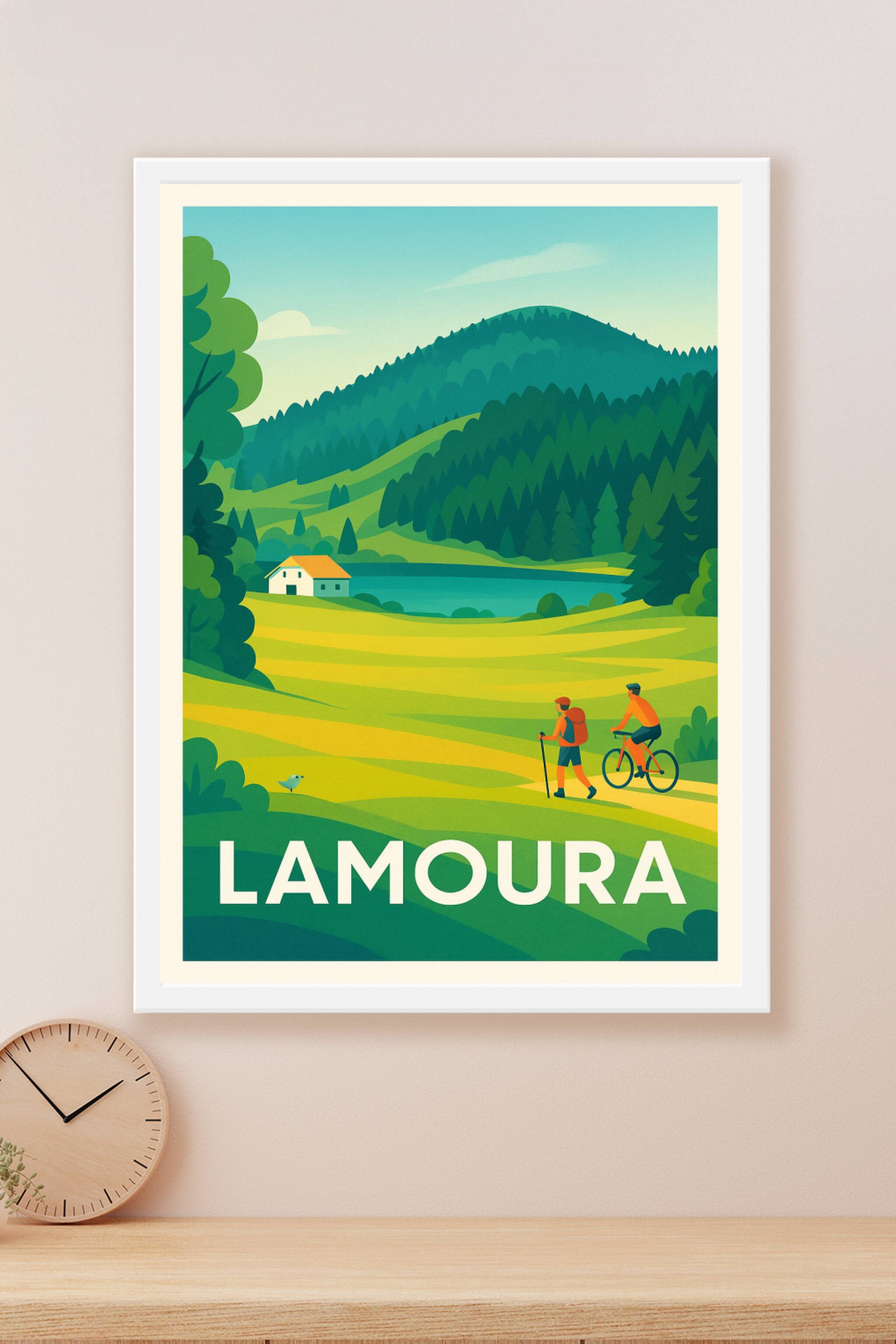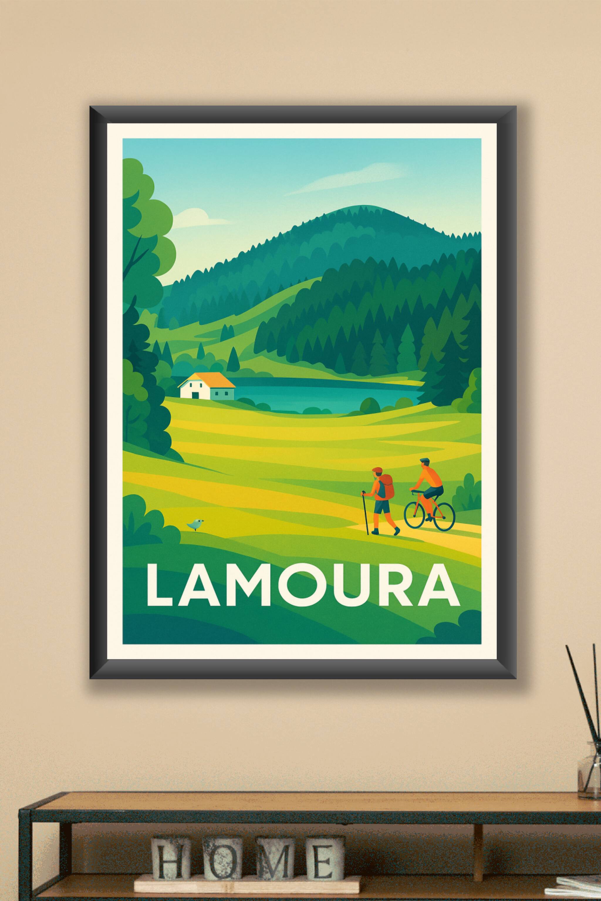 Découvrez la beauté apaisante de Lamoura avec cette affiche qui capture une scène bucolique entre collines verdoyantes et forêt dense. Un couple de...