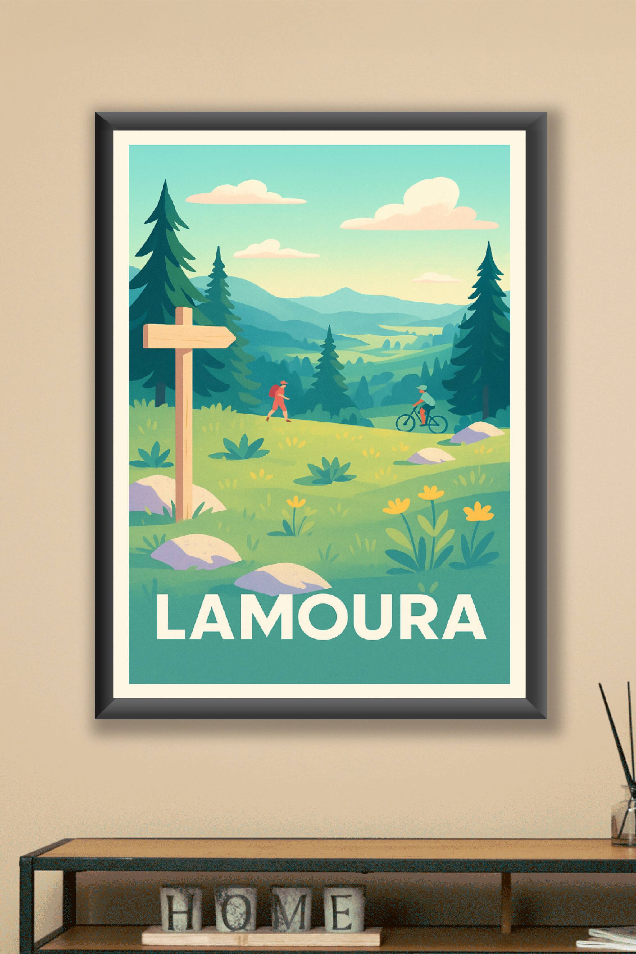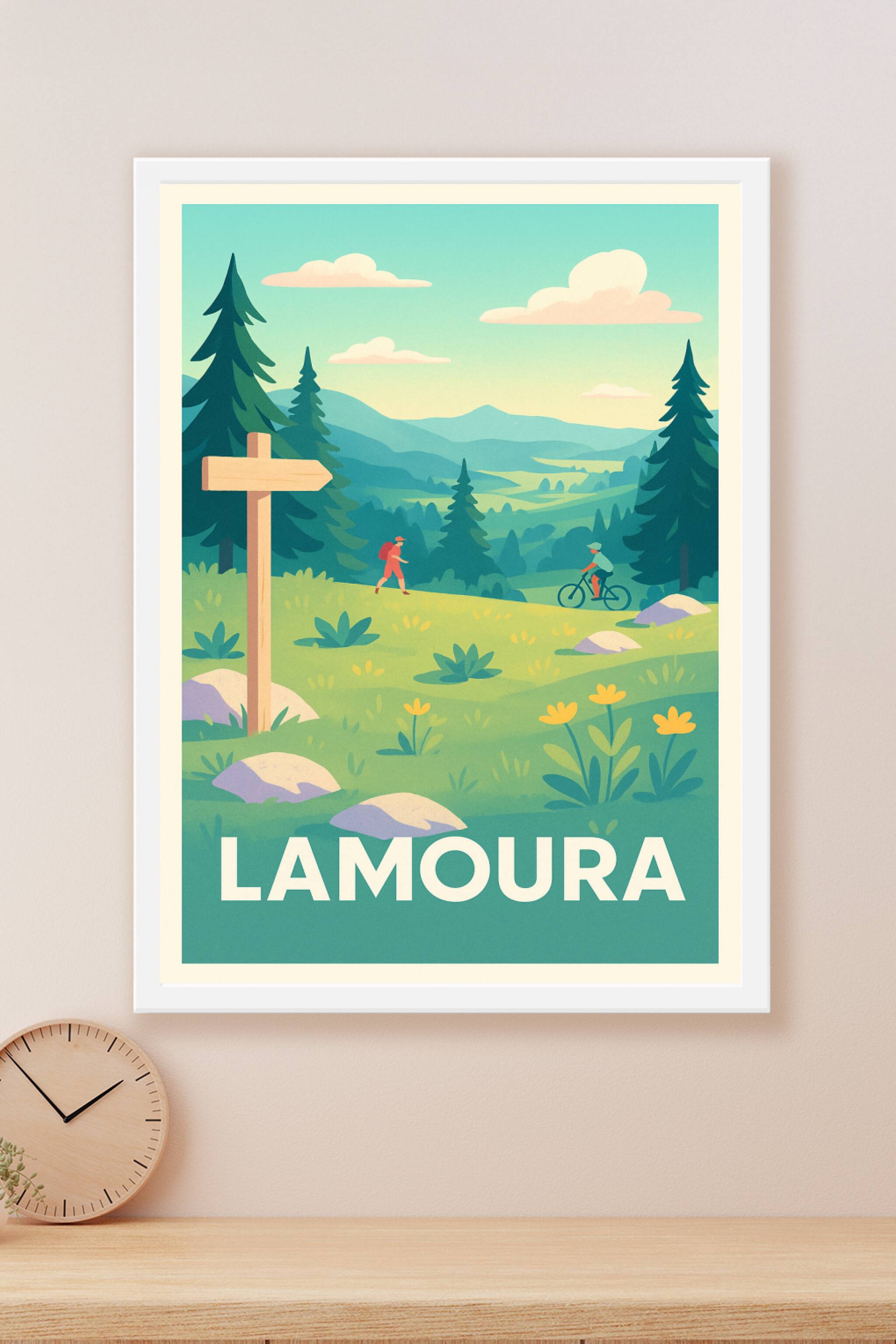 Découvrez l'envoûtante douceur des paysages de Lamoura avec cette affiche vintage qui illustre la beauté intacte des forêts et prairies jurassiennes. Ce poster met en scène une balade à pied et en vélo dans un décor bucolique, où sommets et vallées se fondent dans une harmonie apaisante.Ce poster est imprimé en tirage "Fine Art" sur papier 305g coton pour une qualité d'impression optimale et durable. Disponible en formats A1 à A4, avec ou sans cadre, cette affiche s'adapte parfaitement à votre décoration intérieure ou à vos envies de cadeaux souvenirs.Offrez à vos murs la sérénité et la fraîcheur de Lamoura, avec une impression premium 100% fabriquée en France.