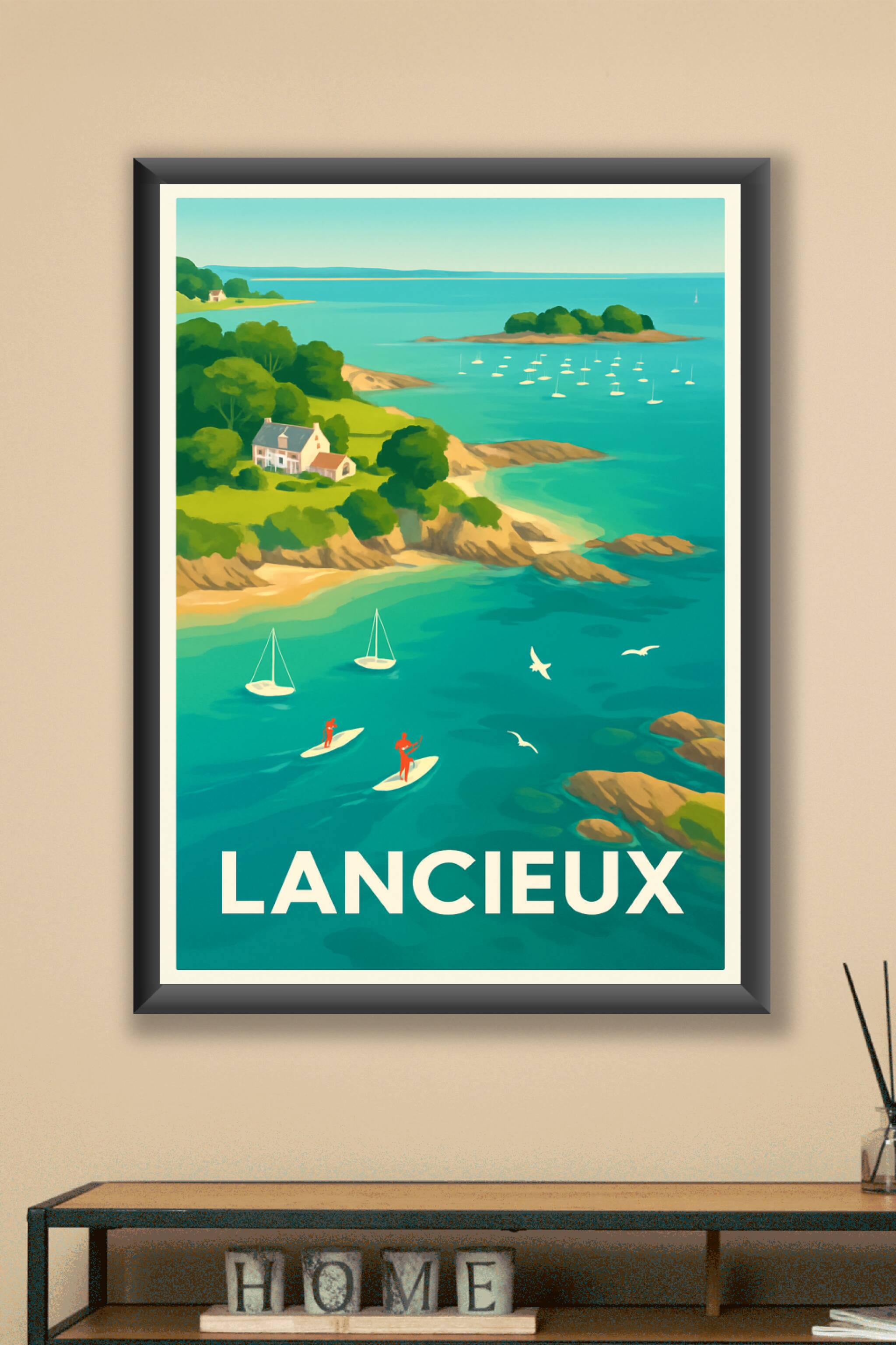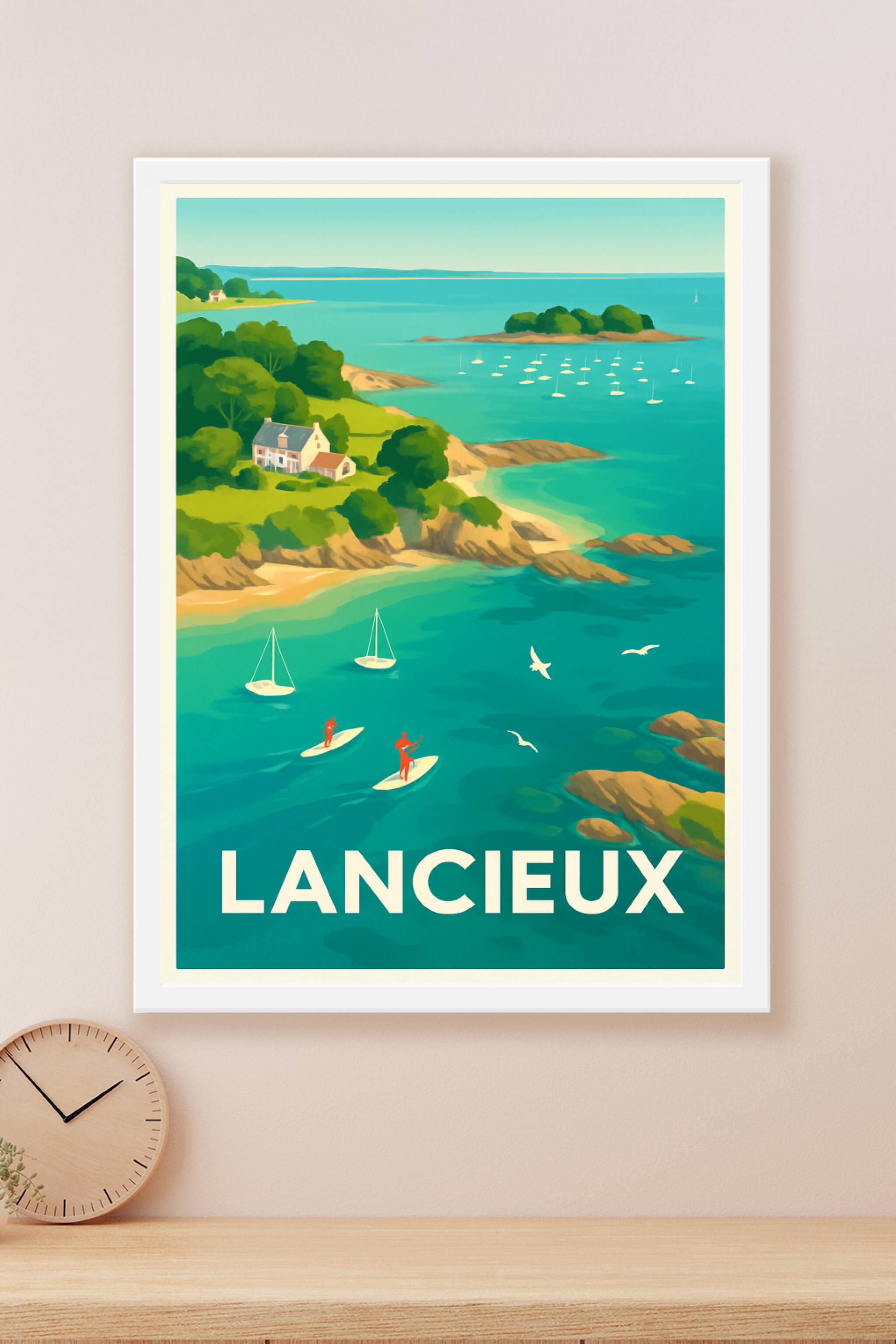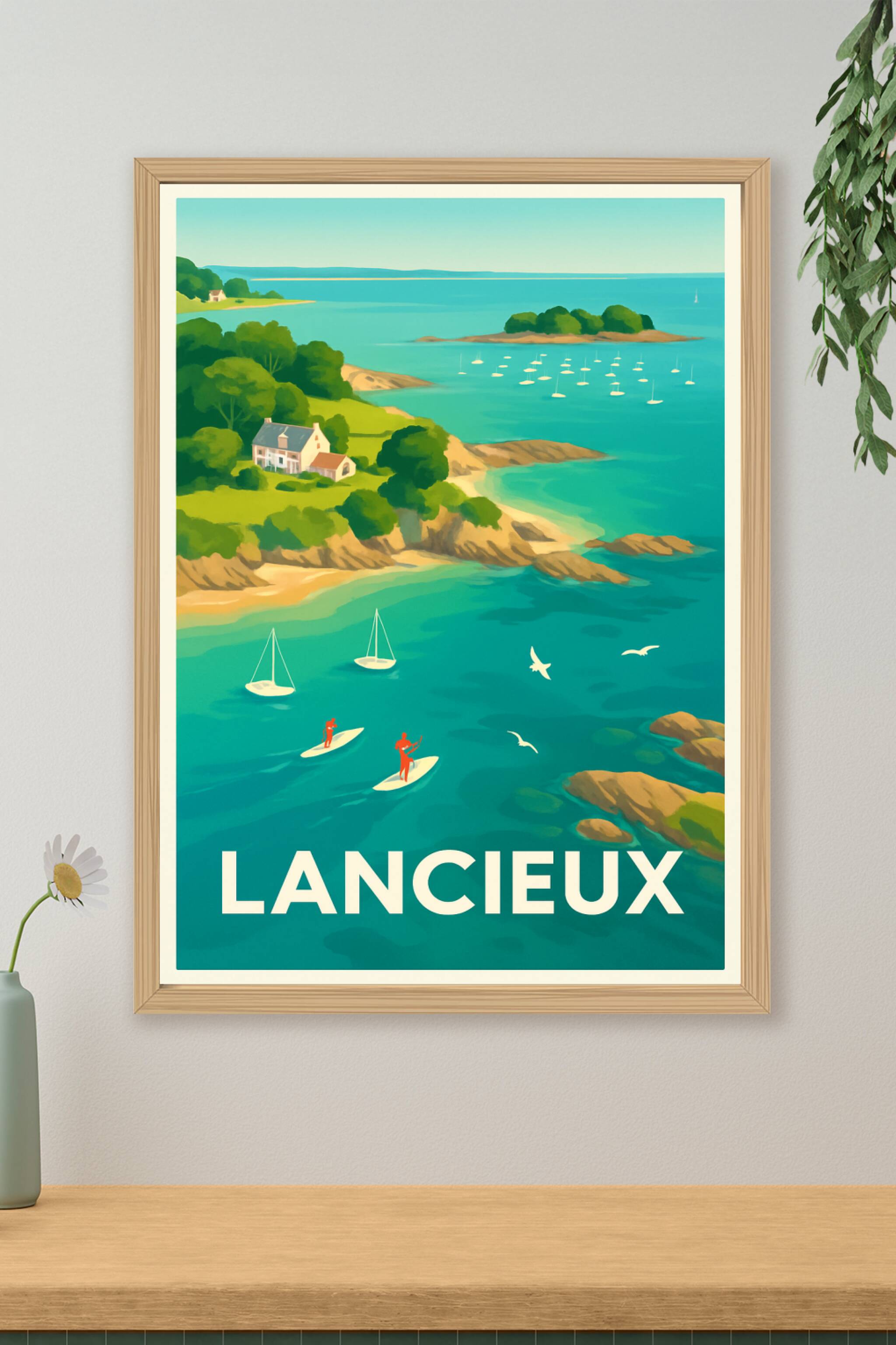 Découvrez l'ambiance sereine et lumineuse de Lancieux à travers cette affiche illustrée représentant ses paysages côtiers idylliques. Les eaux turq...