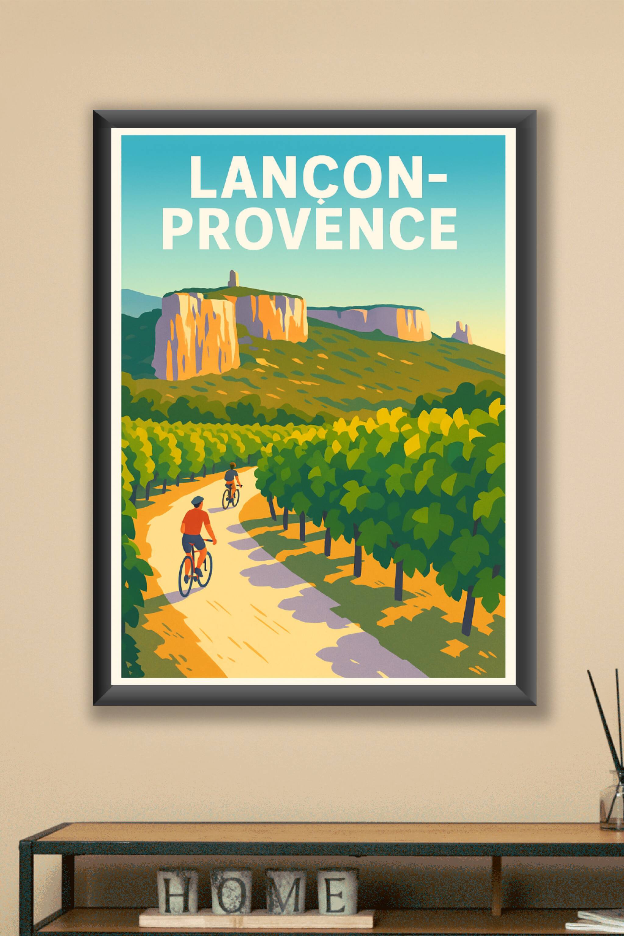 Découvrez l'ambiance chaleureuse de Lançon-Provence avec cette affiche illustrée mettant en scène une balade à vélo au cœur des vignobles verdoyants, face aux majestueuses falaises baignées par la lumière dorée du soleil. Ce poster, au style rétro et aux couleurs éclatantes, apportera une touche de sérénité et de nature à votre décoration intérieure. Imprimé en tirage "Fine Art" sur papier 305g coton, il garantit une qualité d'impression exceptionnelle et une durabilité remarquable. Disponible en plusieurs formats allant de A1 à A4, avec ou sans cadre, cette affiche de Lançon-Provence est parfaite pour les amateurs de paysages provençaux ou pour offrir un cadeau unique et raffiné.