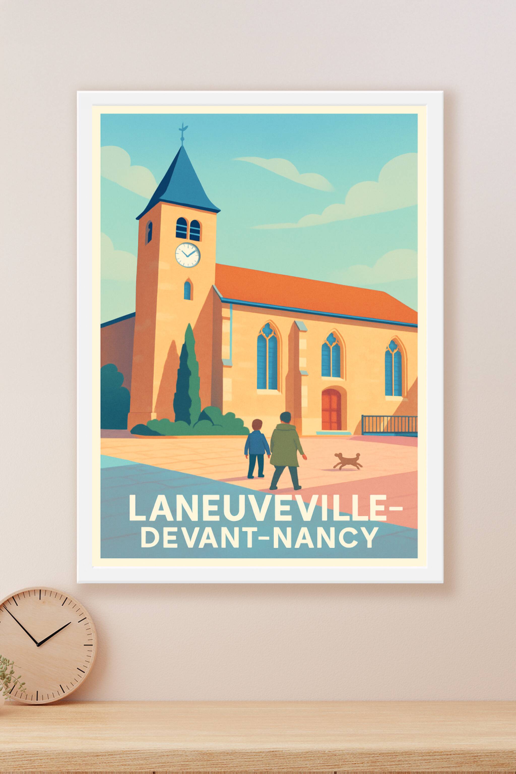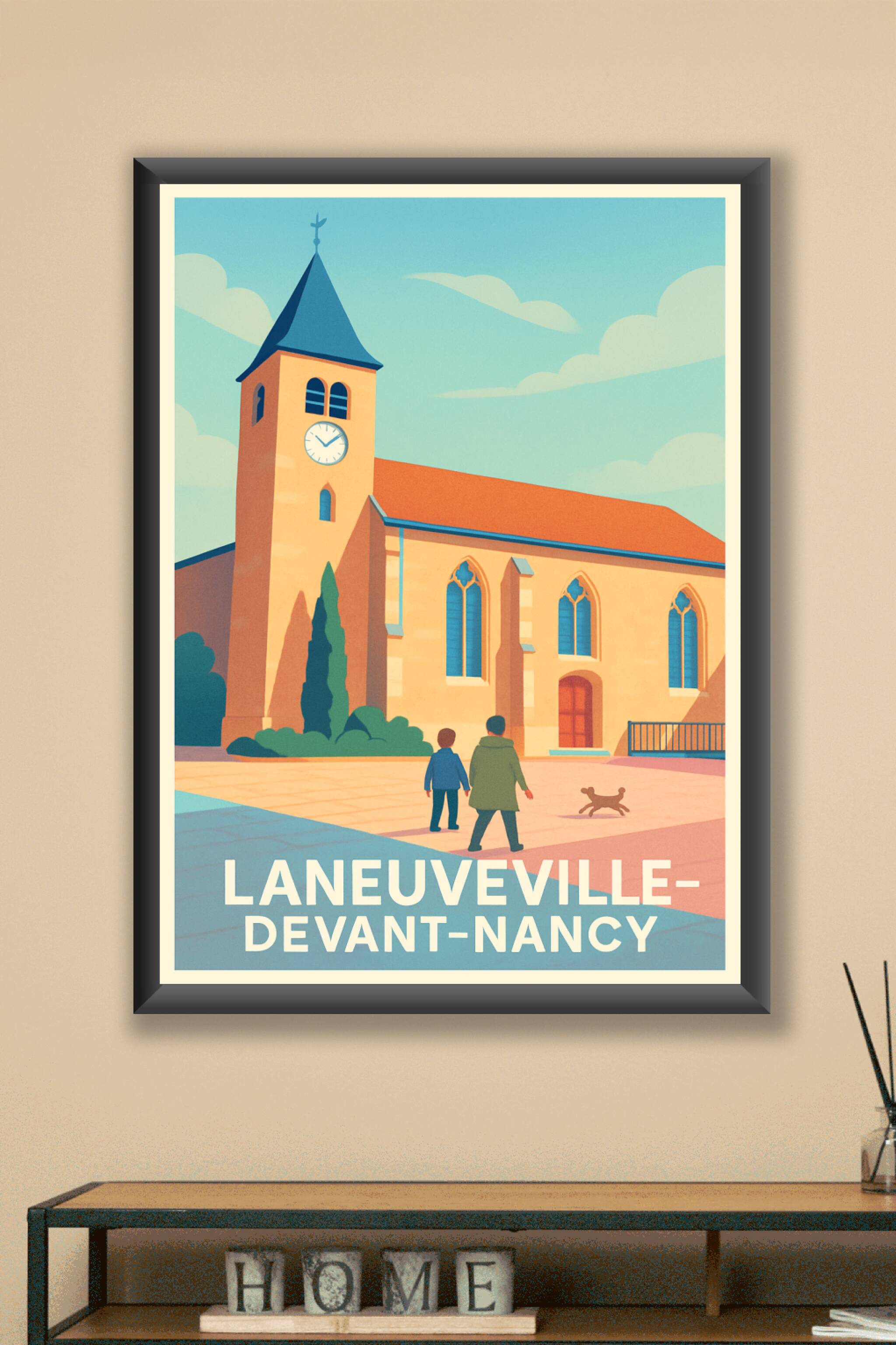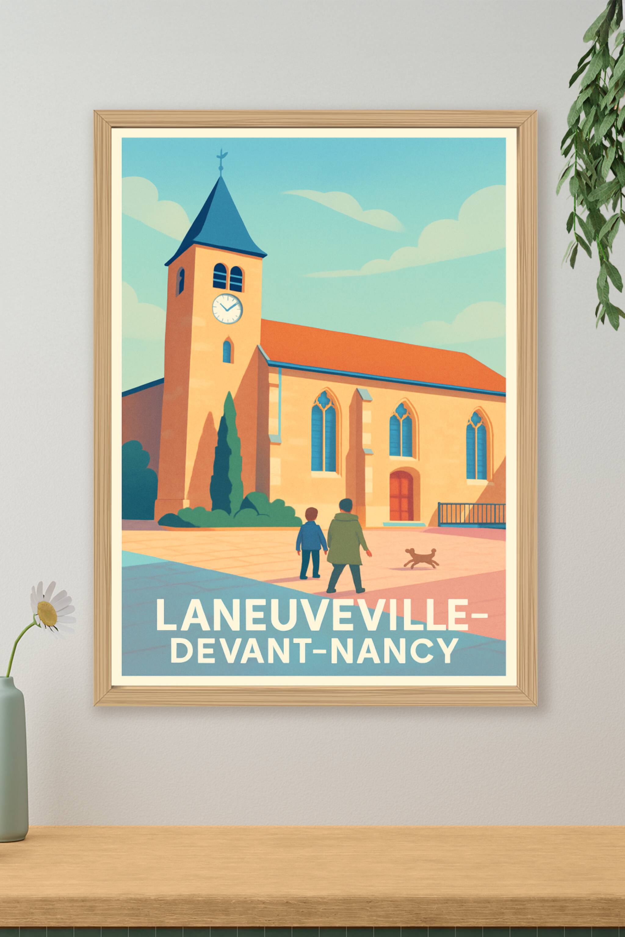 Découvrez l'atmosphère paisible et authentique de Laneuveville-devant-Nancy à travers cette superbe affiche au style vintage et coloré. Le poster p...