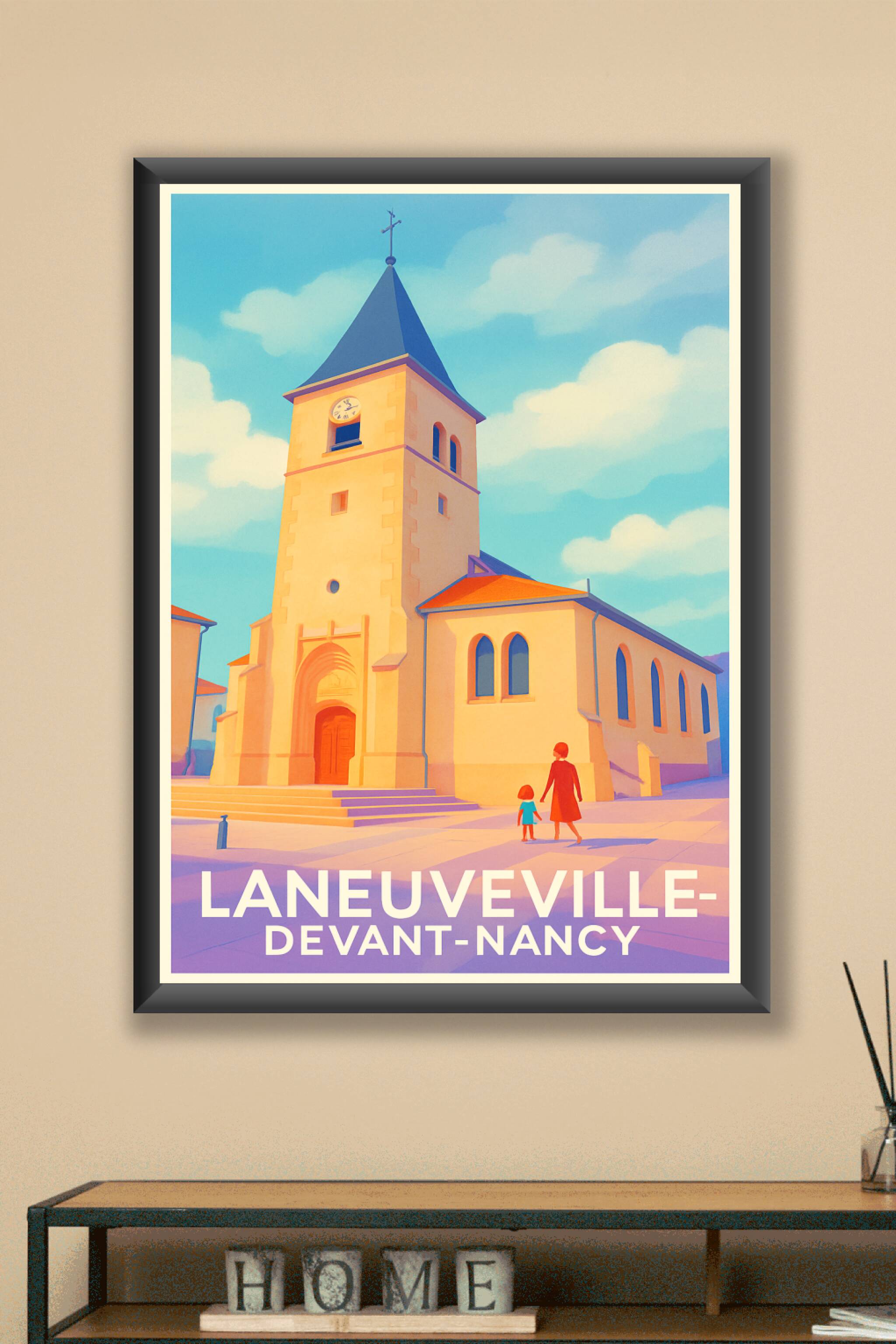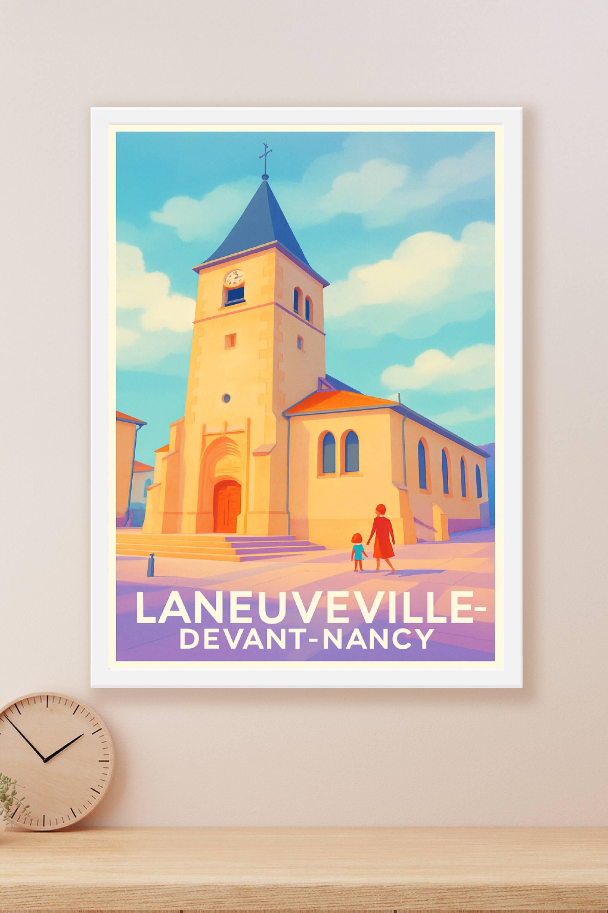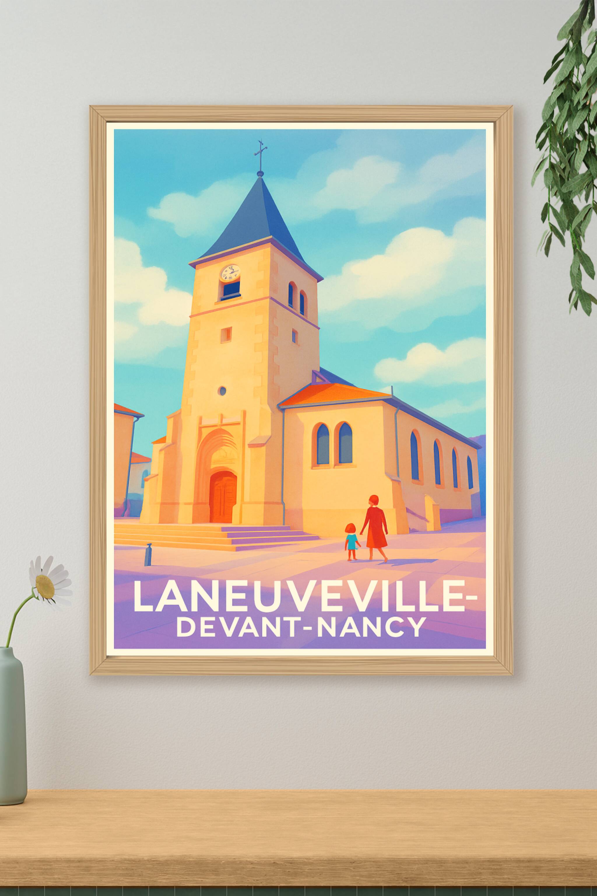 Découvrez le charme paisible de Laneuveville-devant-Nancy à travers cette affiche illustrée mettant en scène son église emblématique sous un ciel b...
